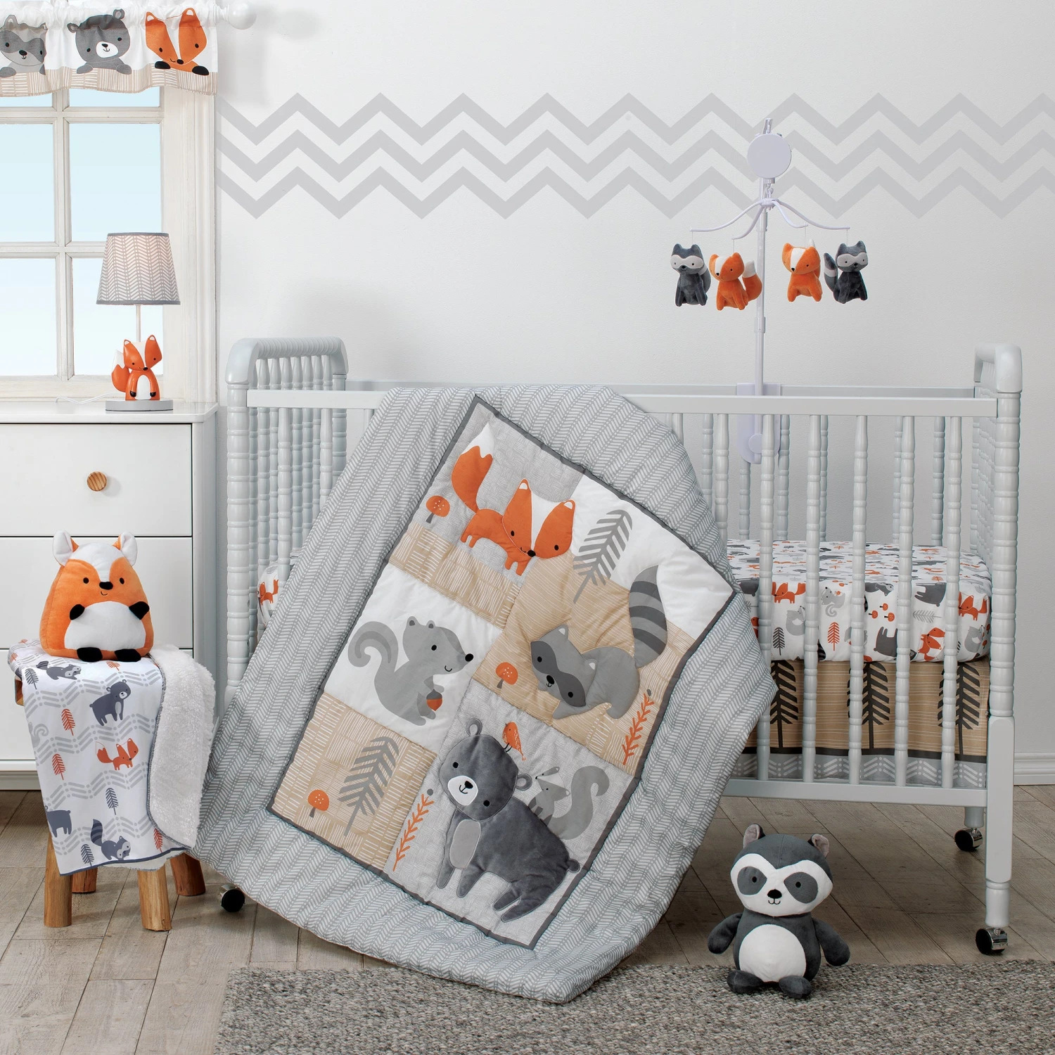 The 3-piece crib bedding set includes one quilt, one fitted crib sheet and one crib skirt. An appliqued plush bear is enjoying the great outdoors while a cute little fox and sweet little bird stand on his back and head. His favorite forest friends include a clever auburn fox, a gray squirrel and a curious raccoon. A pretty gray and white pattern decorates the border and back of the quilt. A charming tossed print with Mr. Bear, clever fox, sweet squirrel with acorns in hand and raccoon decorate the 28” x 52” fitted crib sheet. The fitted crib sheet is fully elasticized all around ensuring a secure fit. Completing the 3-piece crib bedding set is a coordinating crib skirt with forest trees over a gray border and chevron stripes. Made of a soft cotton poly blend. Imported. SKU: 229003V, UPC: 084122229037.