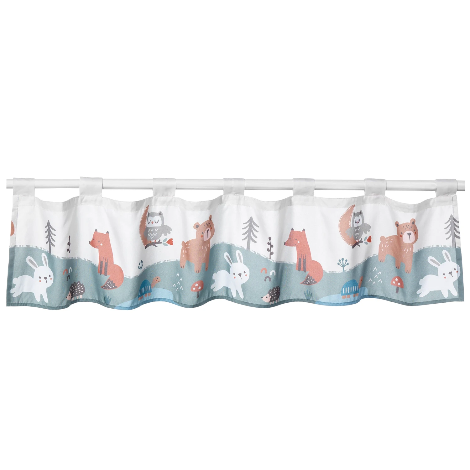 Complete the look of this charming nursery with the window valance. It softens the look of the window and coordinates perfectly with the Bedtime Originals bedding set or it can be used as an accent with your own room design. It is 54” long and 13.5” in height. There are seven 3” tabs on top for easy hanging using a standard rod (rod not included). It is cute, colorful and features our friendly animals. SKU: 238029, UPC: 084122013957.