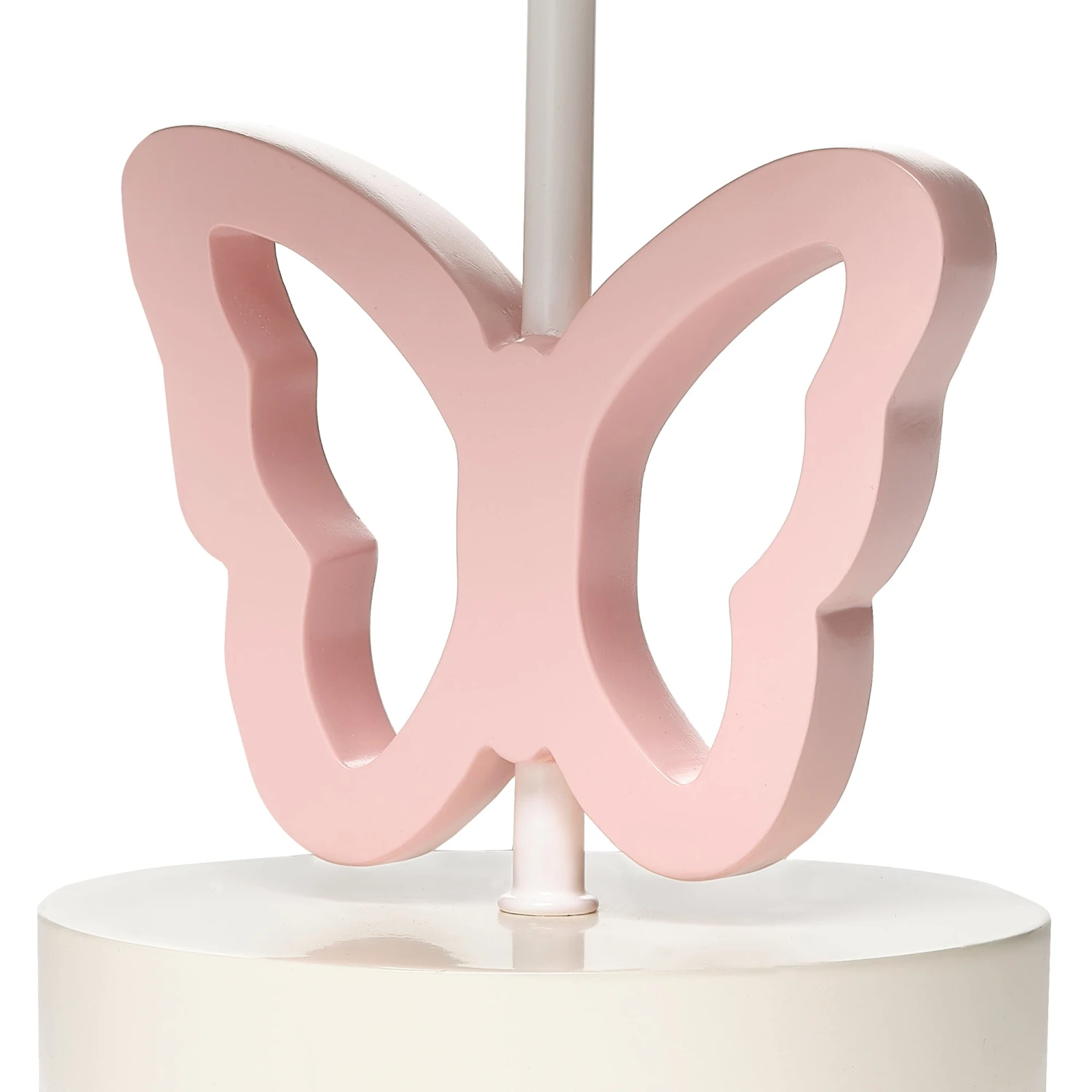 This three-dimensional sculpted butterfly lamp will add a soft glow to your child’s room. A pretty butterfly with graceful open wings decorates this lovely lamp. Colorful watercolor butterflies and flowers decorate the light cream lamp shade. The total height of the lamp and shade is 13 ¼”. The lamp comes complete with an energy efficient light bulb (equivalent to 60 watts) that uses less energy. SKU: 725024B, UPC: 084122015388.