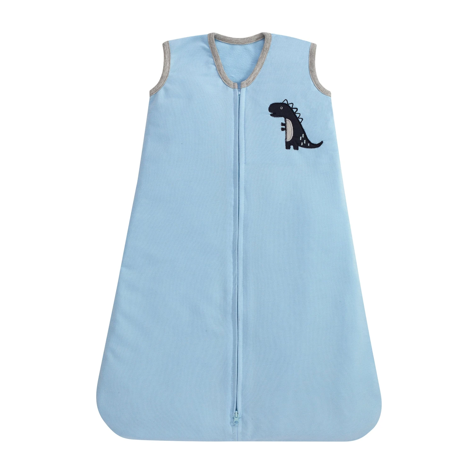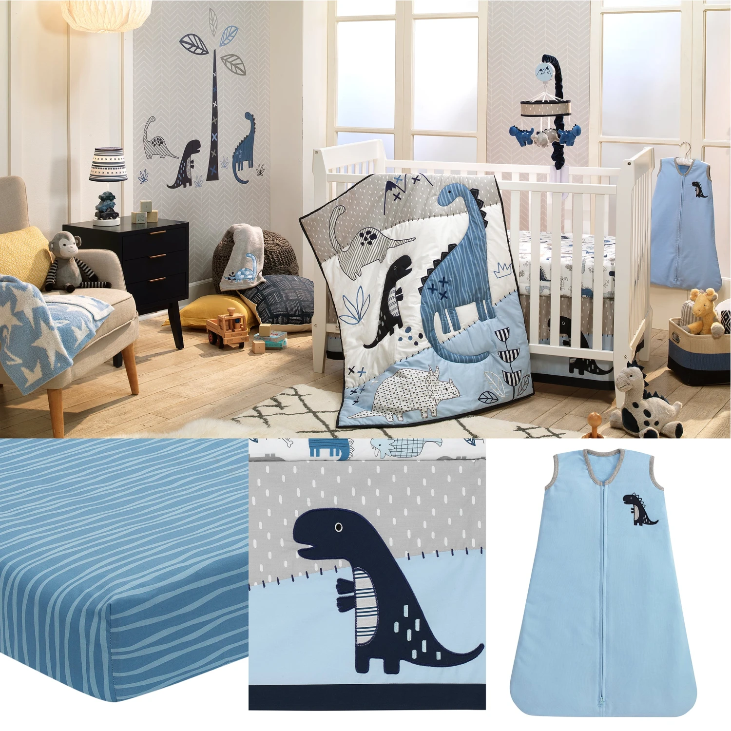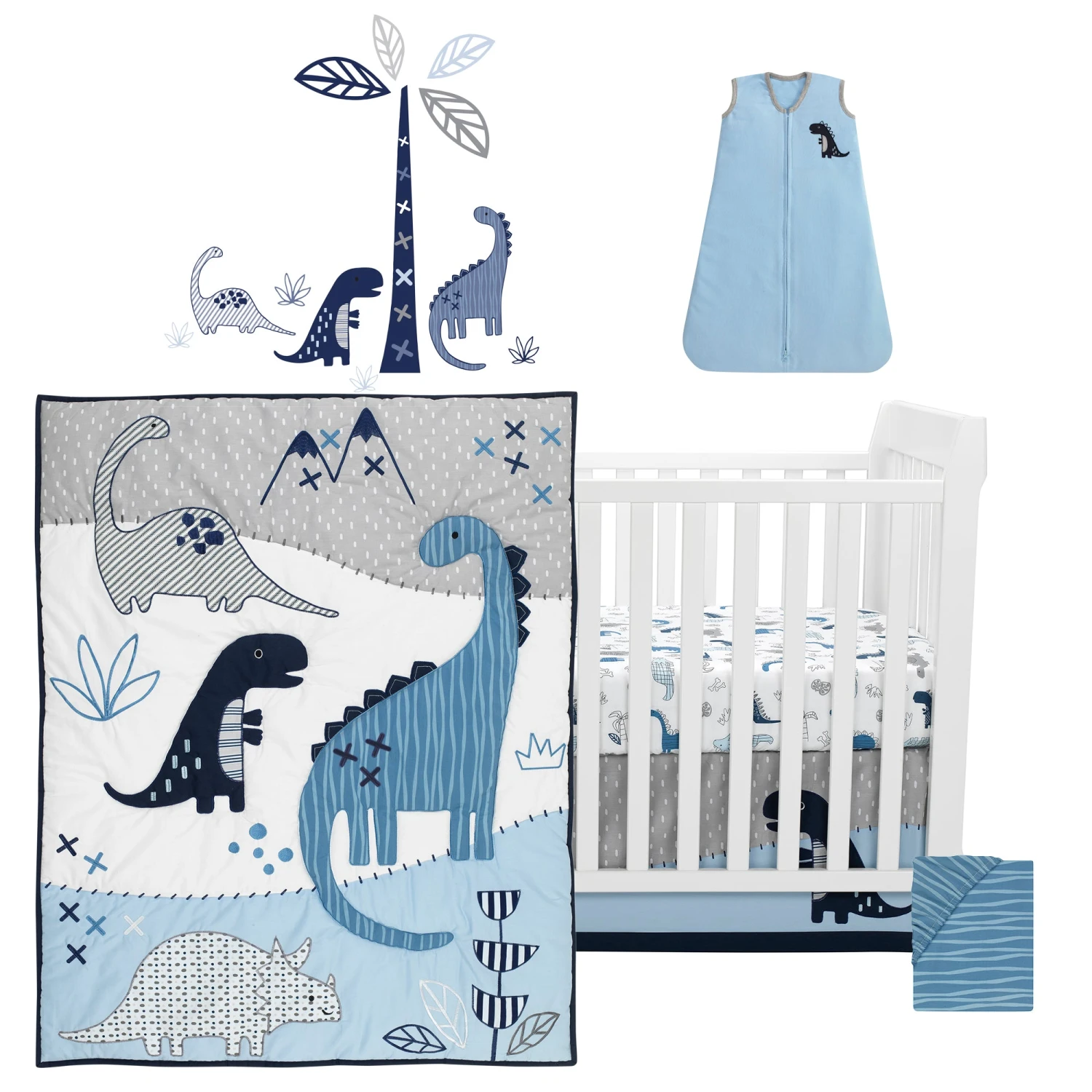 Welcome home your little adventurer with this six-piece bedding set which includes one quilt, two fitted crib sheets (one dino print is 100% cotton and one blue stripe is a cotton/poly blend), one crib skirt, one wearable blanket, and one set of wall decals. This layered landscape features four of our favorite dinosaurs appliqued in different shapes and sizes. Expert embroideries are featured on the mountains, plants, leaves and trims. Two fitted crib sheets are included, one is a tossed dino print on a white ground and the other is a blue ground with wavy lines. The crib skirt features an appliqued dino on a background of white dashes on gray with a light blue panel and navy border. The blue wearable blanket is trimmed in gray and has a dino applique on the upper right-hand side. It fits a size small-medium. Complete this nursery with a designer touch by adding the easy on easy off wall decals. Included are three dinosaurs and a large tree. Finish your nursery with the other matching accessories such as the Musical Crib Mobile Toy, Spike the Dinosaur Plush Stuffed Animal, a Fitted Crib Sheet, or Wall Decals (all sold separately). Designed with love in sunny California. SKU: 850006V, UPC: 084122007024.