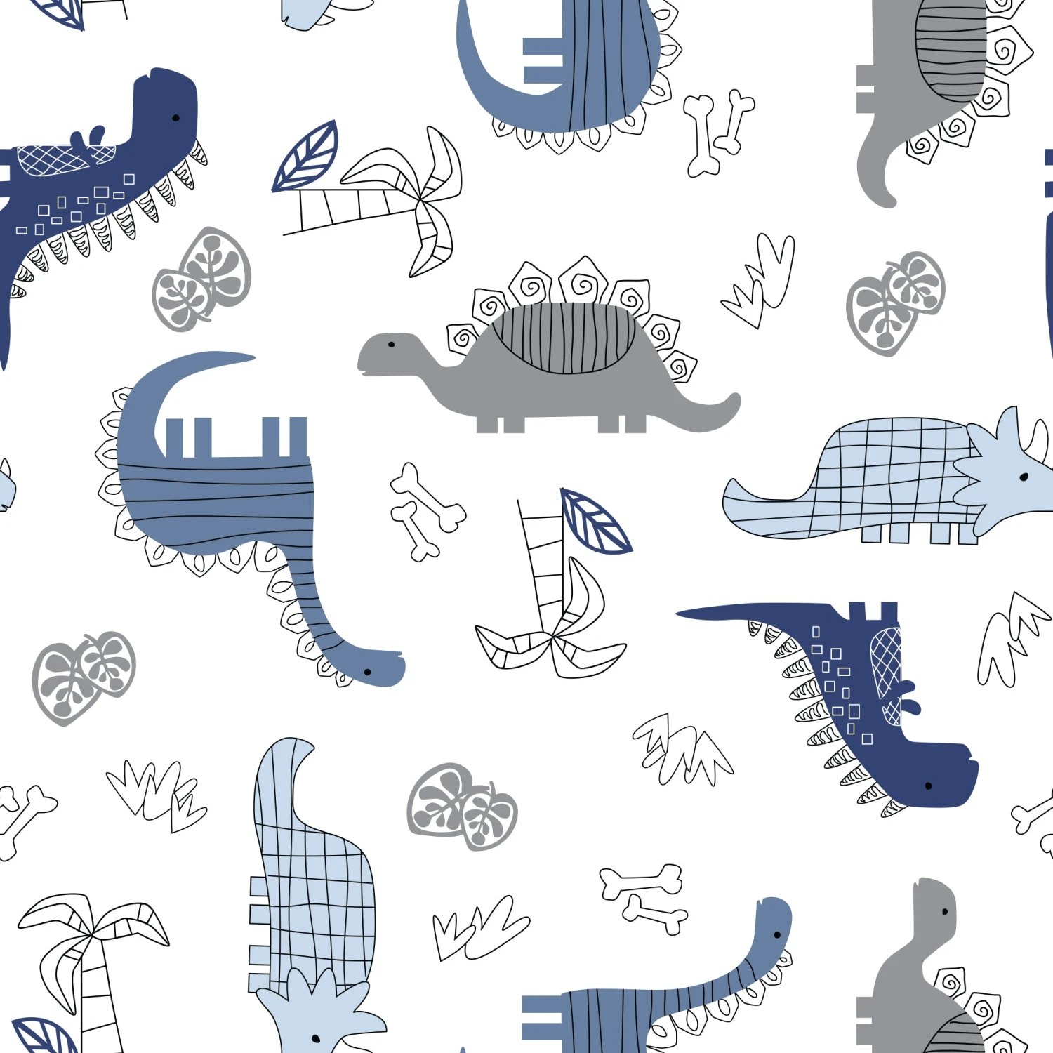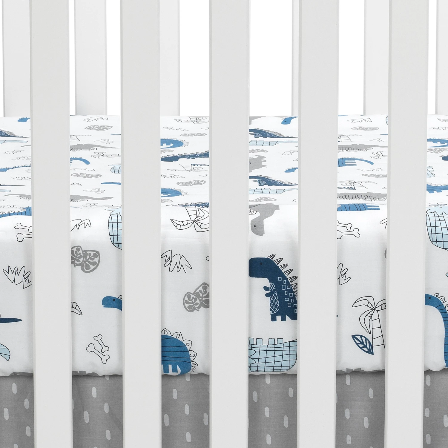 This 100% cotton fitted crib sheet is tossed with different dinos on a white ground. Fits a standard 28” x 52” crib/toddler mattress. Fully elasticized for a more secure fit. SKU: 850006B, UPC: 084122007048.