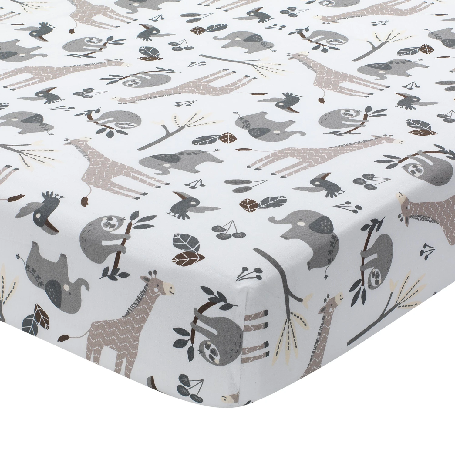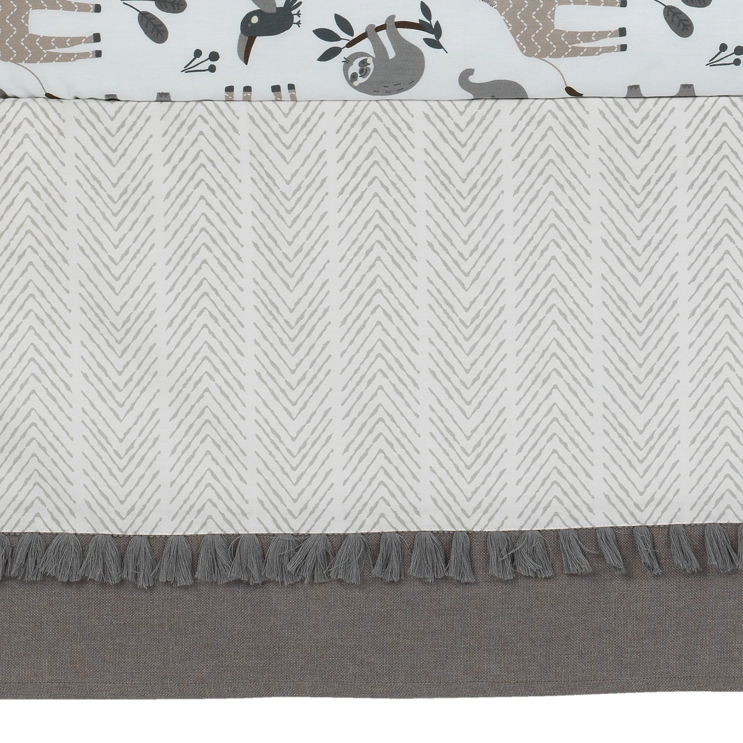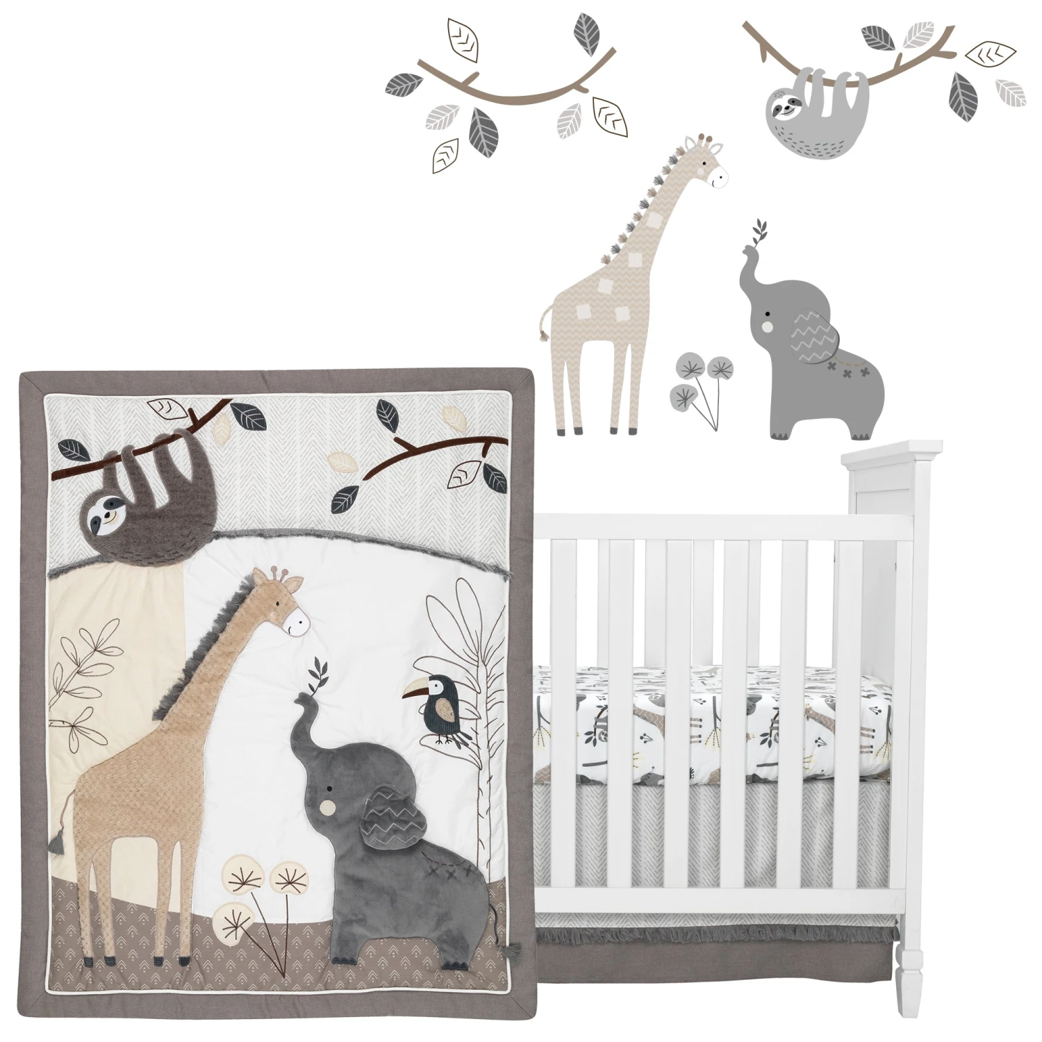 This four-piece nursery baby bedding set includes one quilt, one 100% cotton fitted crib sheet, one crib skirt and a complete set of wall decals. The neutral color palette of gray, taupe, tan, cream and charcoal gray makes it perfect for baby boys and girls. The quilt features a 28” tall giraffe made with a textured chevron patterned minky. His mane is a thick eyelash trim in gray and his tassel tail is made of gray yarn. His feet are a charcoal gray corduroy. Our sweet baby elephant is made with gray minky, he has a 3-dimensional ear with embroidered stitching and a yarn tassel tail. A friendly toucan is appliqued in gray corduroy with cream fur minky and stands comfortably on an outlined tree branch. Up at the top of the quilt is a fuzzy, smiling, gray sloth hanging from a brown tree branch. His name is Speedy, and he is sure to delight your little adventurer. The 100% breathable cotton fitted crib sheet features giraffes, elephants, toucans, sloths and small trees and branches on a crisp white ground. The 100% cotton fitted crib sheet has elastic all around ensuring a safe and secure fit. The crib skirt gives the finishing touch to your child’s crib. It is a gray and white chevron print on the top and a textured gray fabric on the bottom with gray tassel trim in between the two fabrics. Complete this incredible jungle nursery with these custom jumbo wall decals featuring our tall giraffe, elephant, sloth, branches and leaves. They add a designer touch to a feature wall in the baby’s room. SKU: 509104V, UPC: 084122009936.