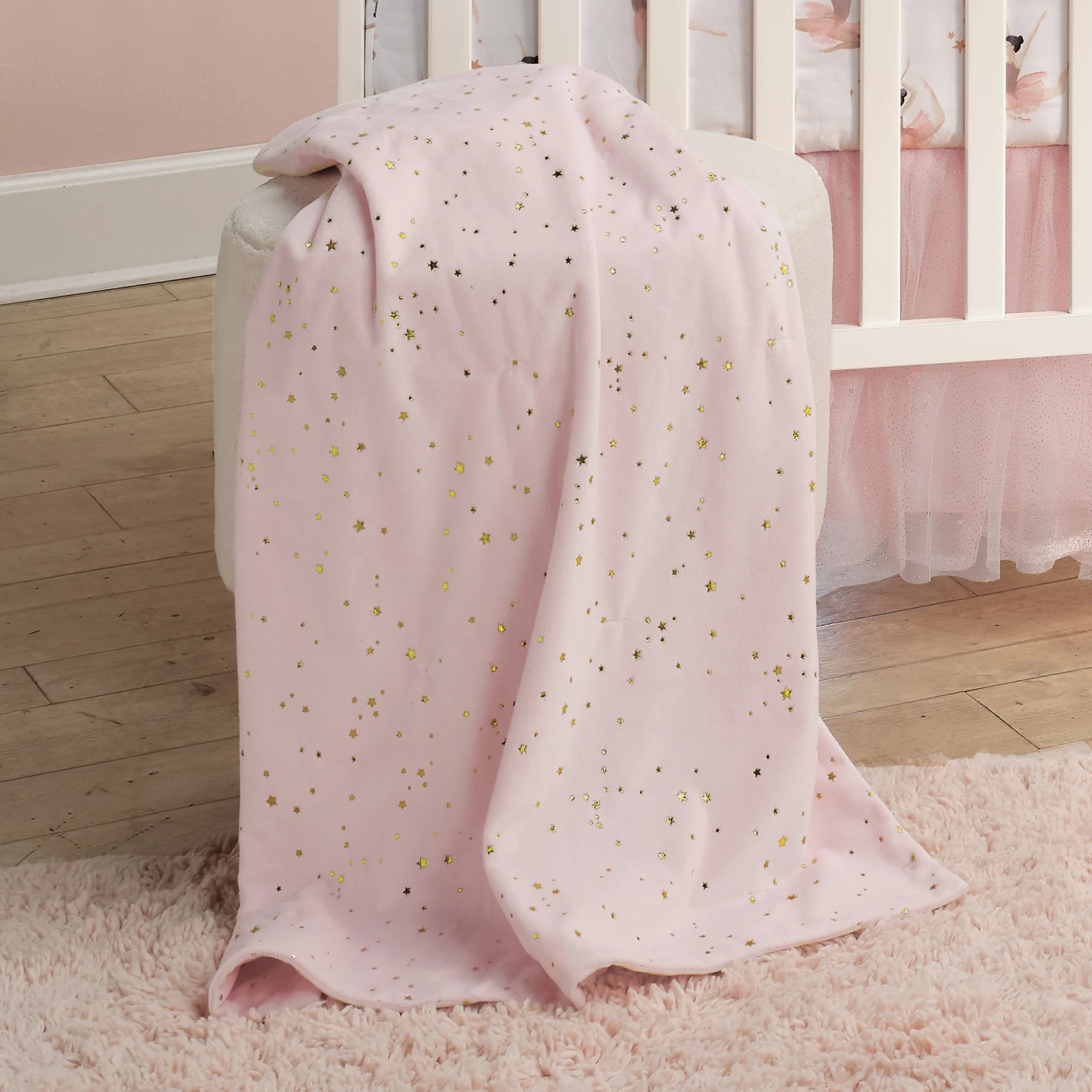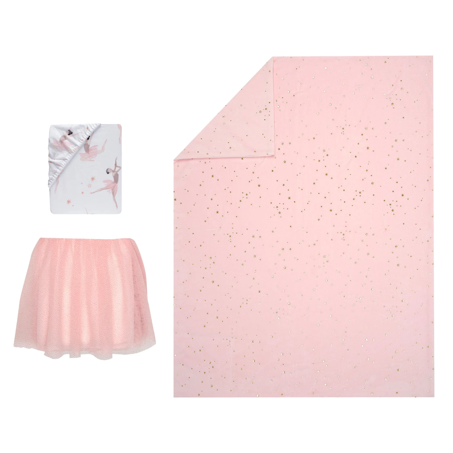 This three-piece crib bedding set includes one blanket with metallic gold stars, one breathable 100% cotton ballet themed fitted crib sheet and one lovely sparkling tulle crib skirt. The soft and cozy two-sided blanket is 30 cinhes by 40 inches and is a dreamy soft pink minky with sparkling metallic gold stars. The breathable 100% cotton fitted crib sheet is on a clean white ground and features sweet dancing ballerinas in different poses with pink tutus and ballet slippers. This elegantly shirred and sparkling crib skirt has four layers. It is 14 and a half inches long and adds the finishing touch to this beautiful collection. SKU: 701003V, UPC: 084122017917.