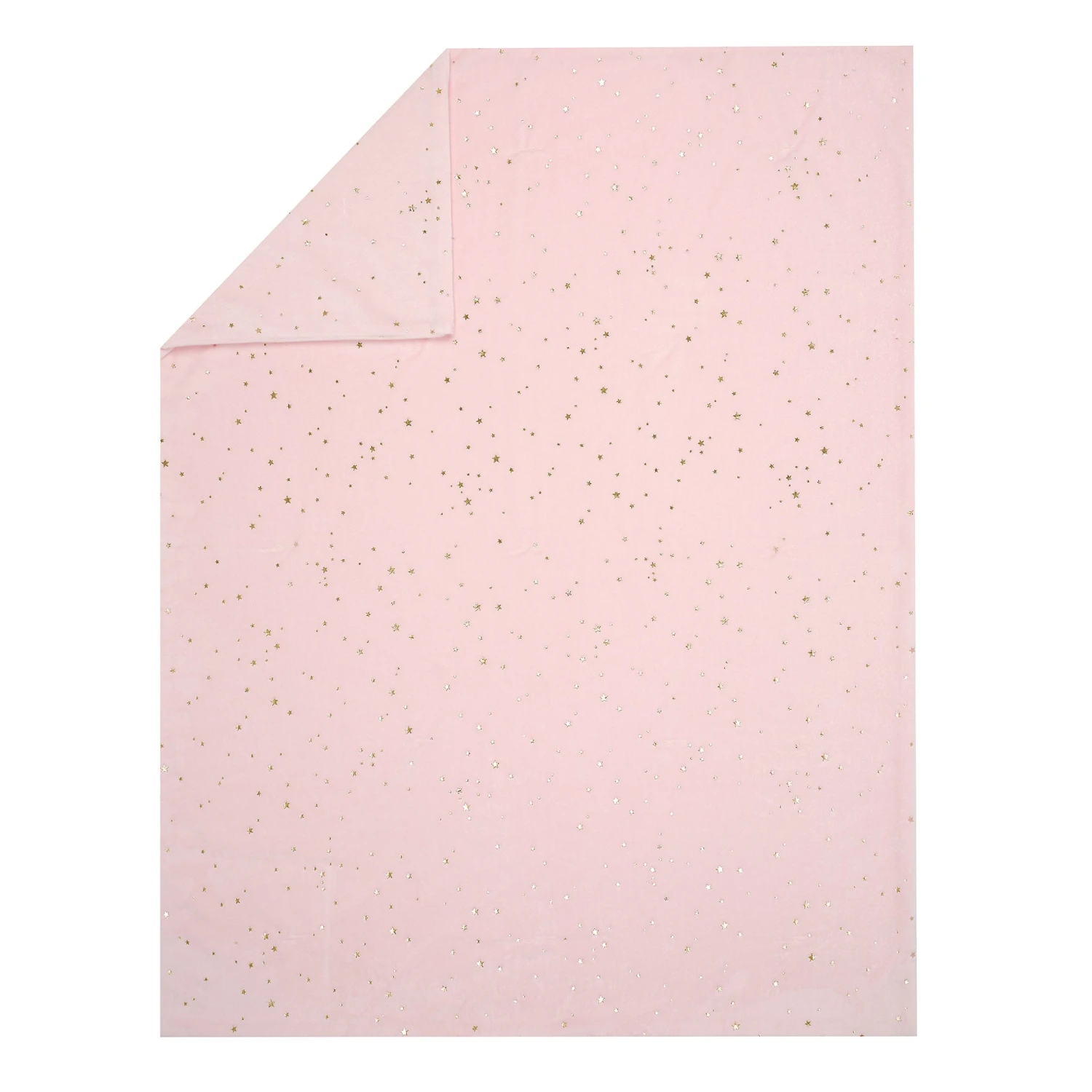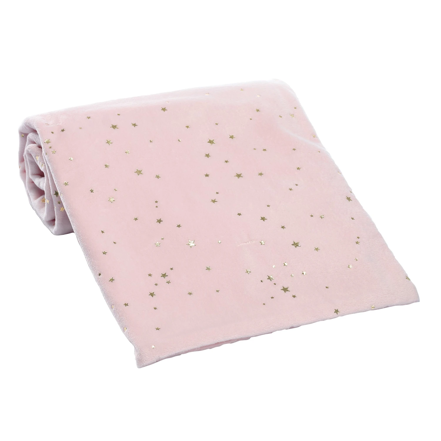 This soft luxurious Ballerina Baby blanket is warm and cozy. Perfectly sized at 30 inches by 40 inches makes it a great stroller blanket. It is made in a pretty shade of super-soft pink minky and decorated with metallic gold stars on both sides. Machine washable and dryable for easy care. Makes a thoughtful and wonderful welcome home baby gift. SKU: 701034, UPC: 084122017832.