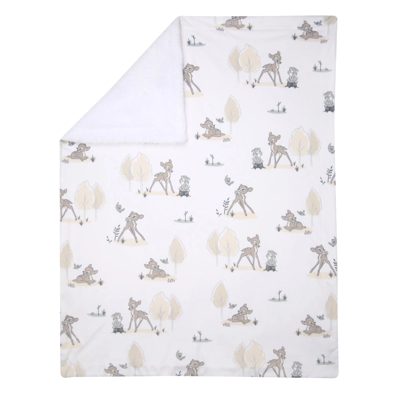This warm and cozy Disney Bambi blanket will add a little wonder and whimsey for your little one. A charming illustration in neutral earth tone colors adds to its charm. Bambi loves hanging out with his closest friend Thumper. The front of the blanket is a soft white minky ground and the back is a cozy white faux shearling. Sized at 30” X 40” making it a great stroller blanket. It is ideal for trips to the park, running errands, and is great for moms, dads, and little ones on the go. It is machine washable for easy care. SKU: 789034BMS, UPC: 084122015142.