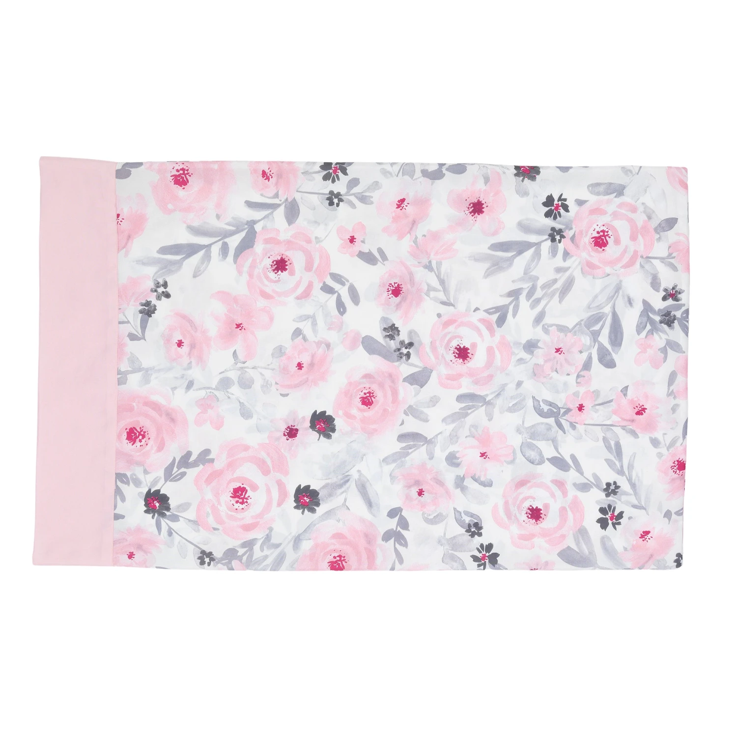 This toddler bedding set includes one quilt (42” X 57”) one fitted bottom sheet, one top sheet and one standard size pillowcase (BED NOT INCLUDED). The perfect way for your little one to transition from their crib is into a toddler bed. They share the same size mattress making switching a snap. A gorgeous floral watercolor print in pinks and grays decorates the quilt, fitted bottom sheet, top sheet, and a standard size pillowcase with a solid pink 3 ½” border. Made in a silky soft microfiber fabric this is sure to please your little toddler. The fitted bottom sheet is 28” X 52” and has elastic all the way around ensuring a safe and snug fit on a standard size crib/toddler mattress. The top sheet is 44” X 61” and the pillowcase is 20” X 31 ½”. SKU: 2620104V, UPC: 084122011977.