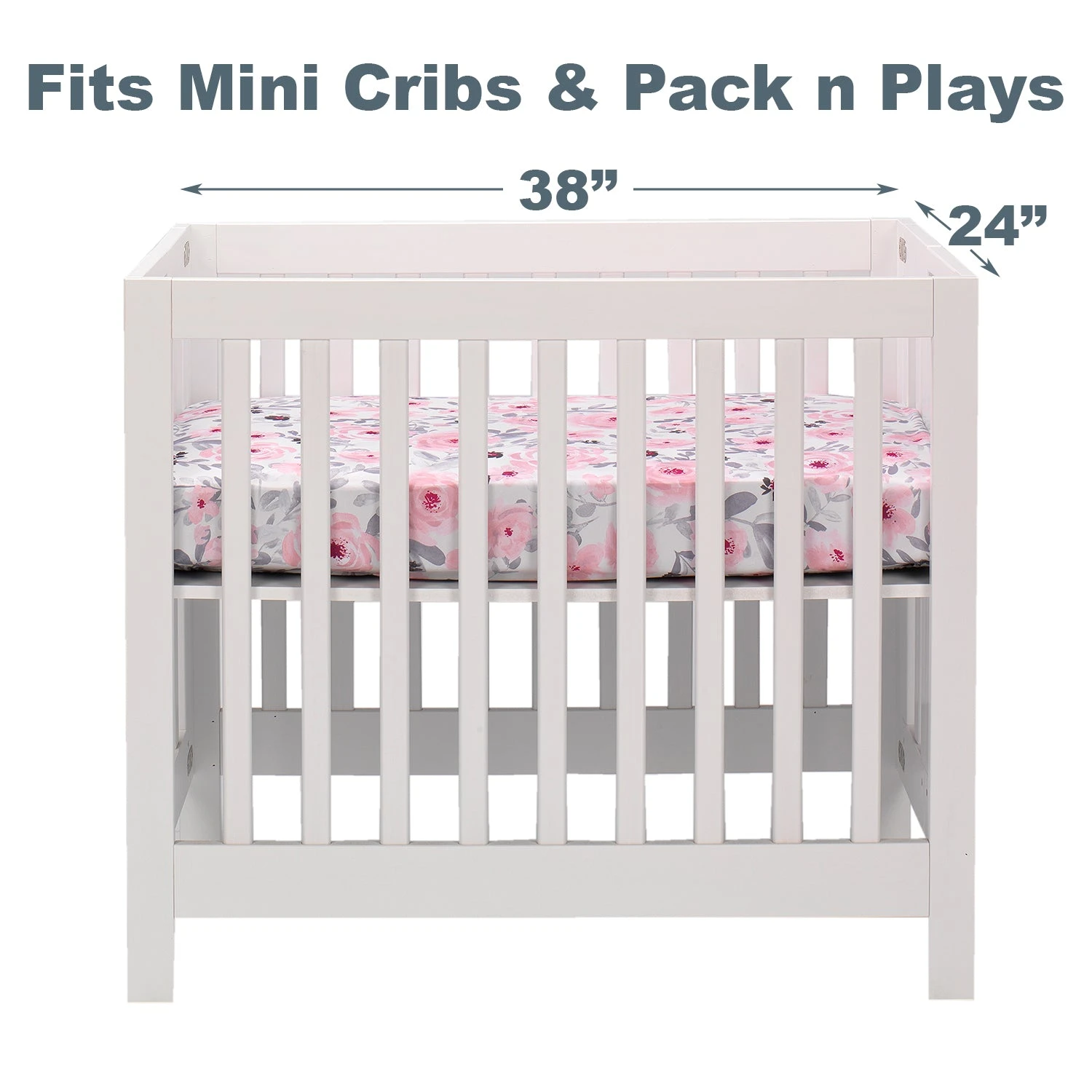 This beautiful pink and gray floral mini fitted crib sheet is made in a soft microfiber fabric. It is sized at 24” X 38” and fits most Pack N Play, portable, and mini crib mattresses. The fitted crib sheet has elastic all the way around for a safe and secure fit. It is super soft, durable, and machine washable.