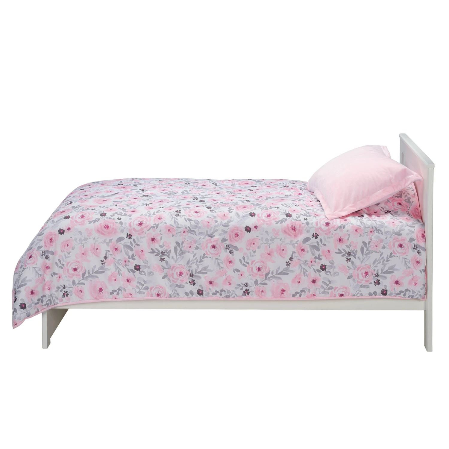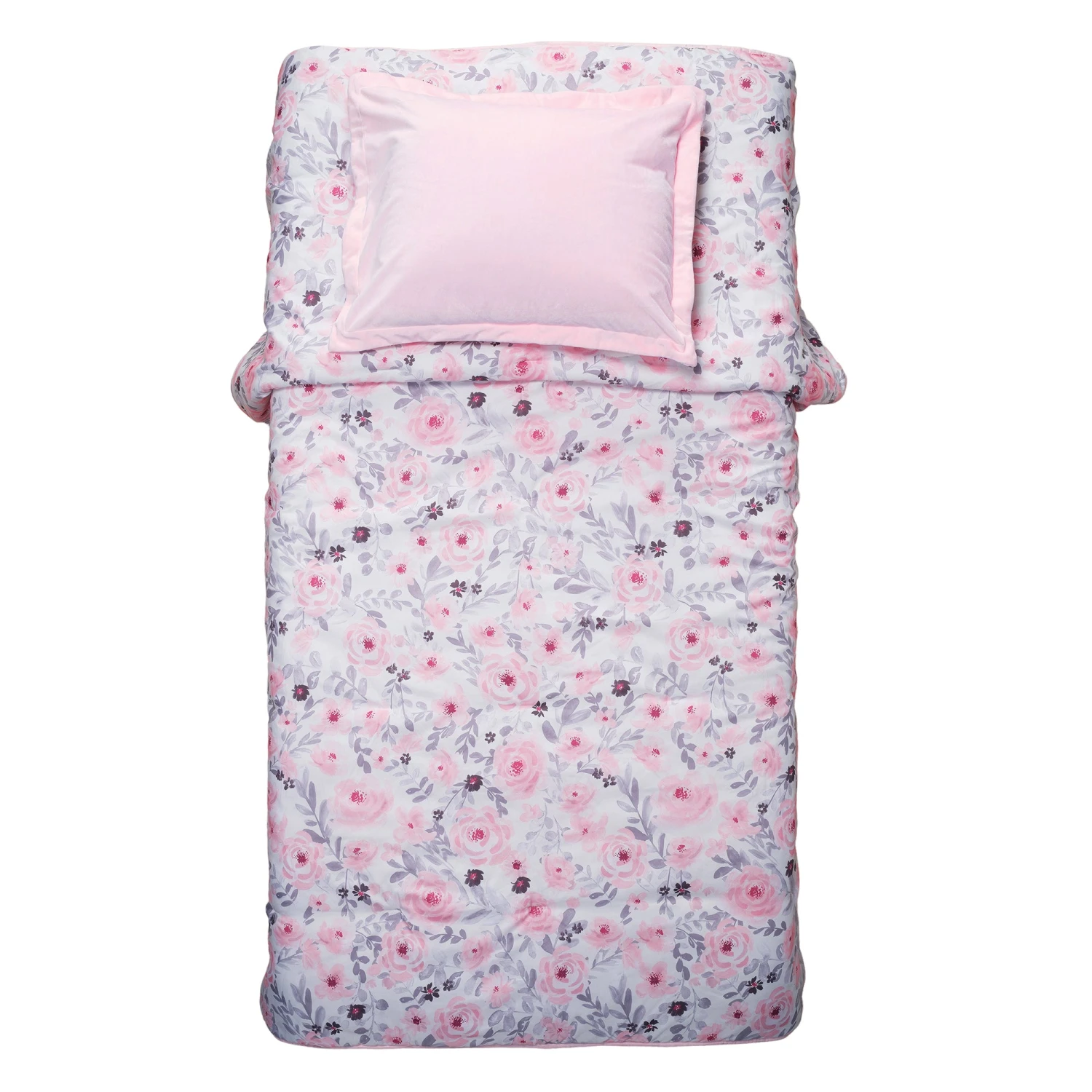 Create a cozy, inviting space for your child with this lovely watercolor floral twin size bed set. It includes one twin size quilt and one standard pillow sham. The watercolor floral print is in soft shades of pinks and grays and the quilt is 68” X 86”. The coordinating pillow sham is in a luxurious, soft pink minky fabric and is 23” X 29”. SKU: 262001TQ, UPC: 084122017962.