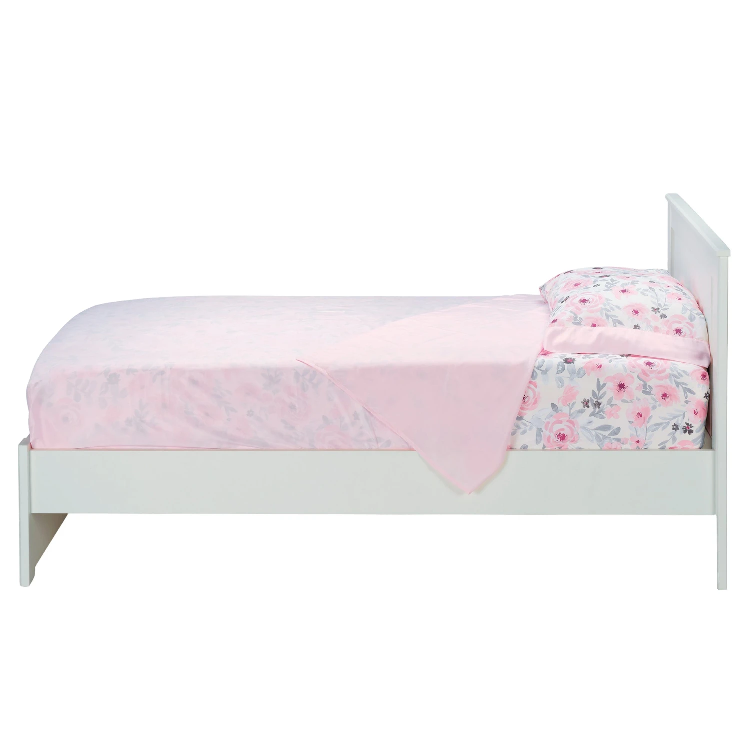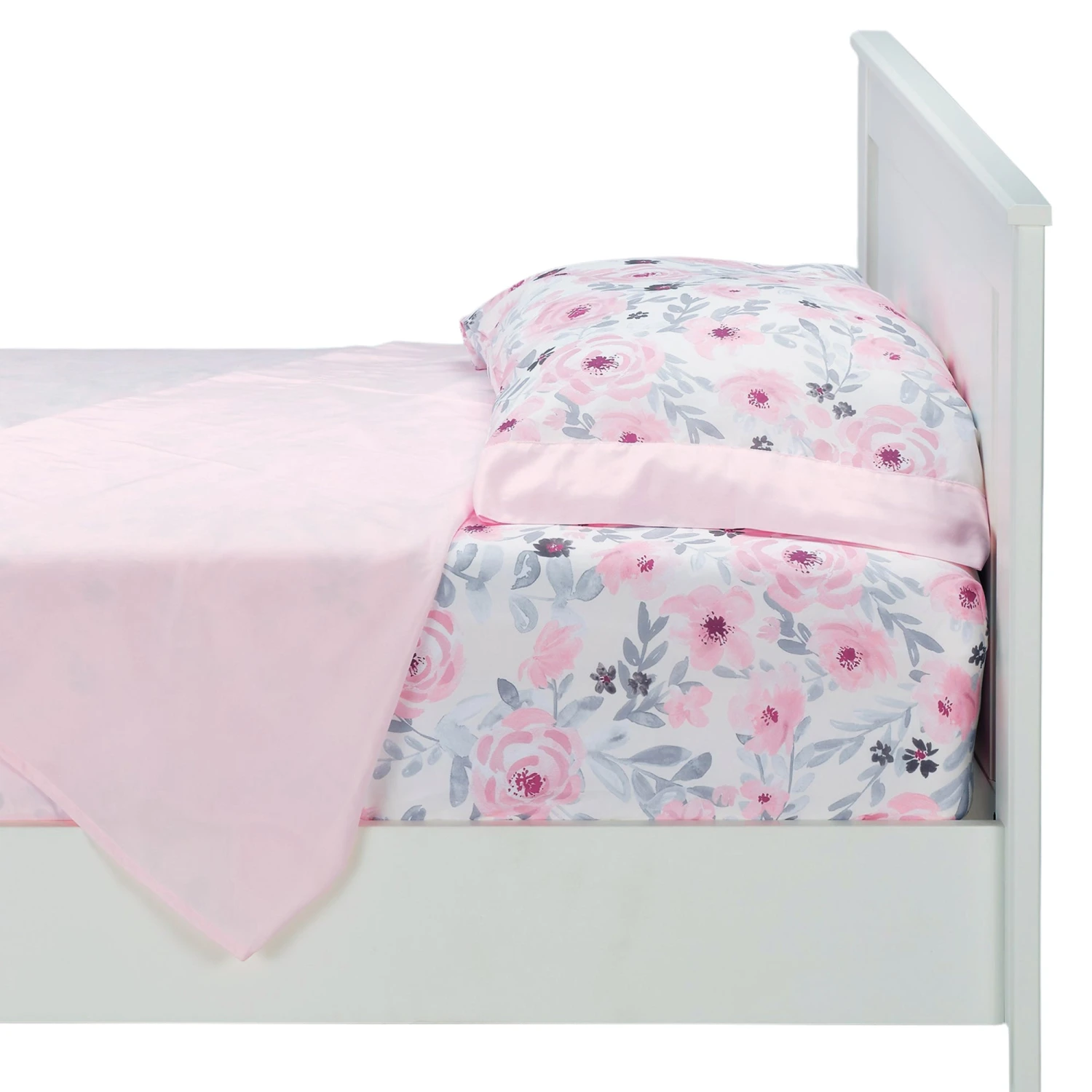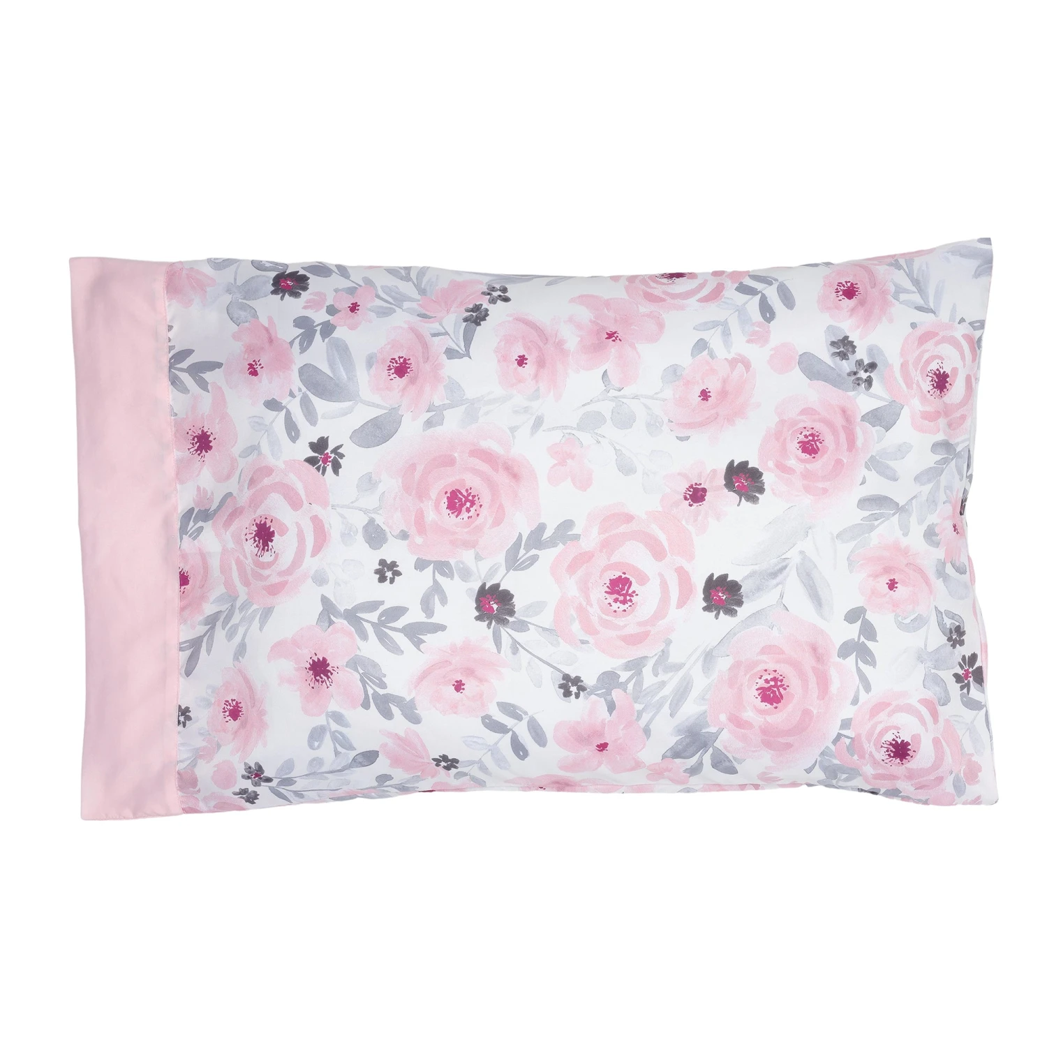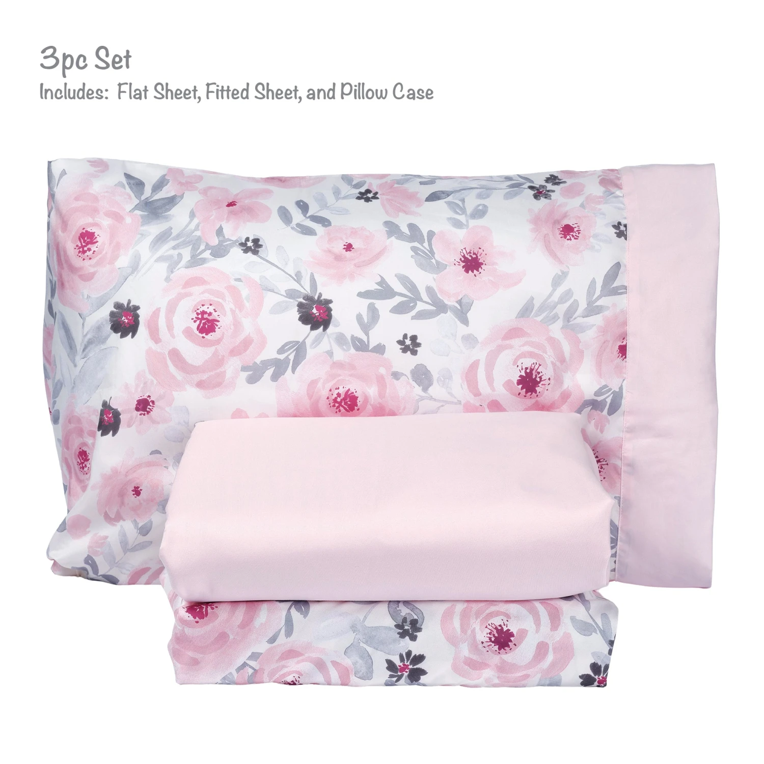 This three-piece twin bed set includes one standard sized pillowcase, one twin size fitted sheet and one twin sized flat sheet. The pillowcase has a lovely watercolor floral design on the front and back with a pretty pink border. It is approximately 31” X 20” and is made in a silky soft microfiber fabric. The watercolor floral fitted sheet is designed to sit a standard twin mattress measuring 38” x 75” and has elastic all the way around for a secure fit. The solid pink flat sheet is 66” X 96” with a self-border at the top. SKU: 262006TS, UPC: 084122017979.