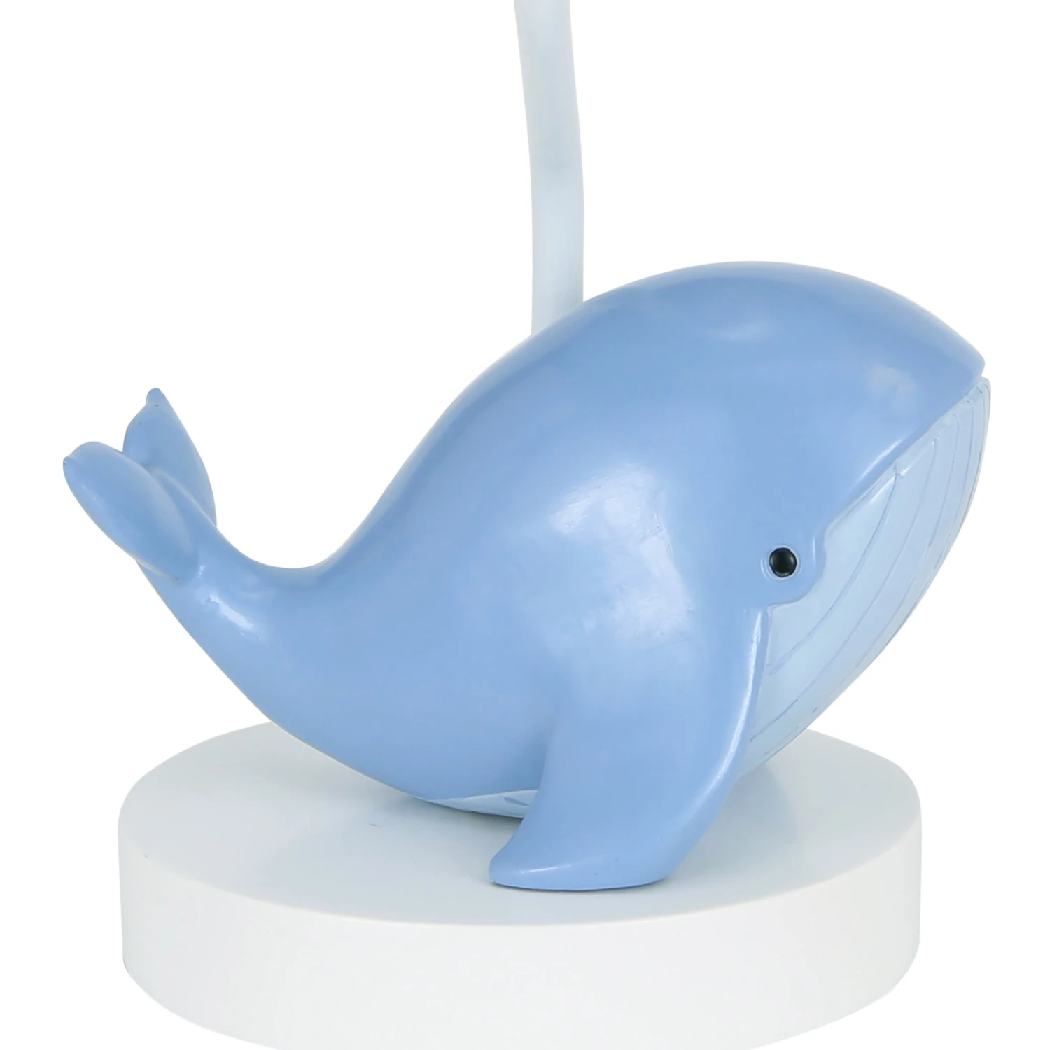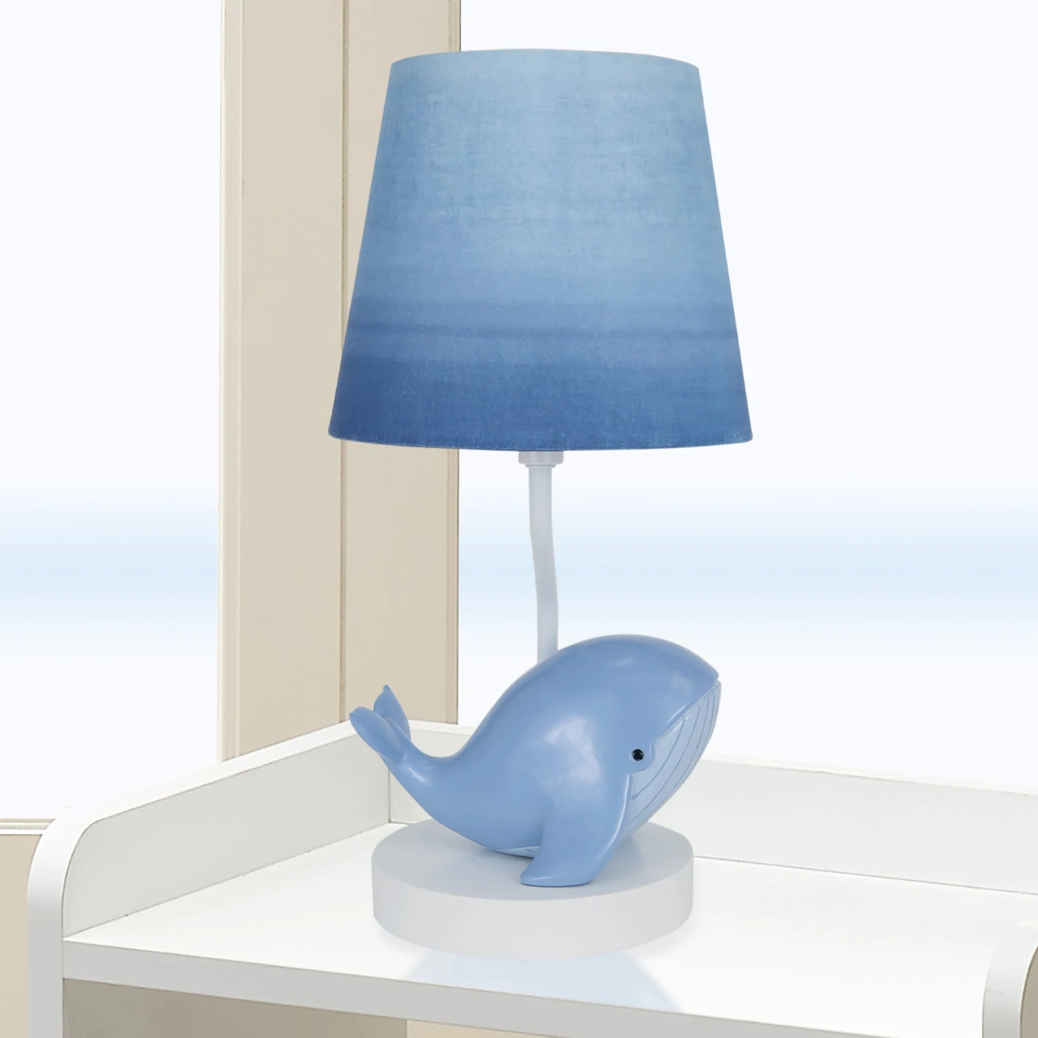 This custom hand-painted 3-dimensional lamp features our adorable sculptured whale named Squirt. The lamp with shade is approximately 14” tall and is made out of resin. Squirt has his fluke (tail) up and his fins are down. The ombre lamp shade transitions from light blue to dark blue and comes complete with an LED energy efficient light bulb. SKU: 704024B, UPC: 084122019379.