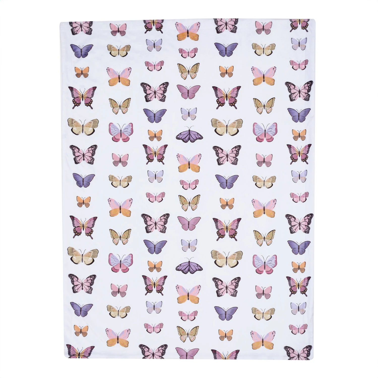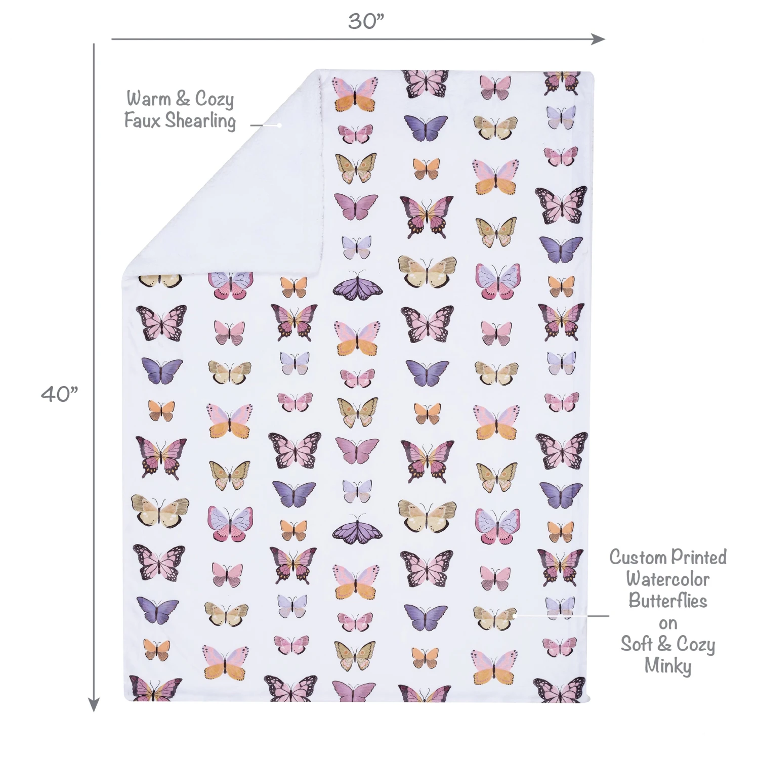 Imagine a world of unmatched softness, where your precious little one feels like they’re wrapped in a gentle hug. This luxurious baby blanket features a flutter of colorful butterflies on a soft white ground. This baby stroller blanket has a soft minky front and a luxurious white faux shearling back. It is generously sized at 30” X 40” which ensures your little one stays warm and cozy out and about and at home. SKU: 742034, UPC: 084122018785.
