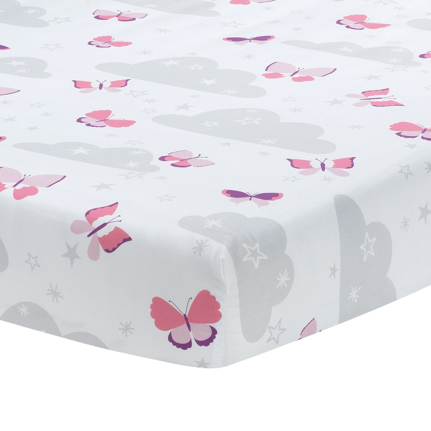 This three-piece baby bedding set includes one quilt, one fitted crib sheet, and one crib skirt. The quilt features beautiful butterflies in shades of pinks, lavender, and purple. There is a 2-inch pink border and a pretty silver ric rac trim which decorates the inside border. The fitted crib sheet is on a crisp white ground and is filled with colorful butterflies, stars, and clouds. Complete this charming baby bedding collection with the pink crib skirt with pink, purple and white butterflies, and stars. This collection has been printed in a high resolution for enhanced colors and is made of a soft microfiber. This set is a top baby registry pick and makes a great baby shower gift. SKU: 263003V, UPC: 084122011540.
