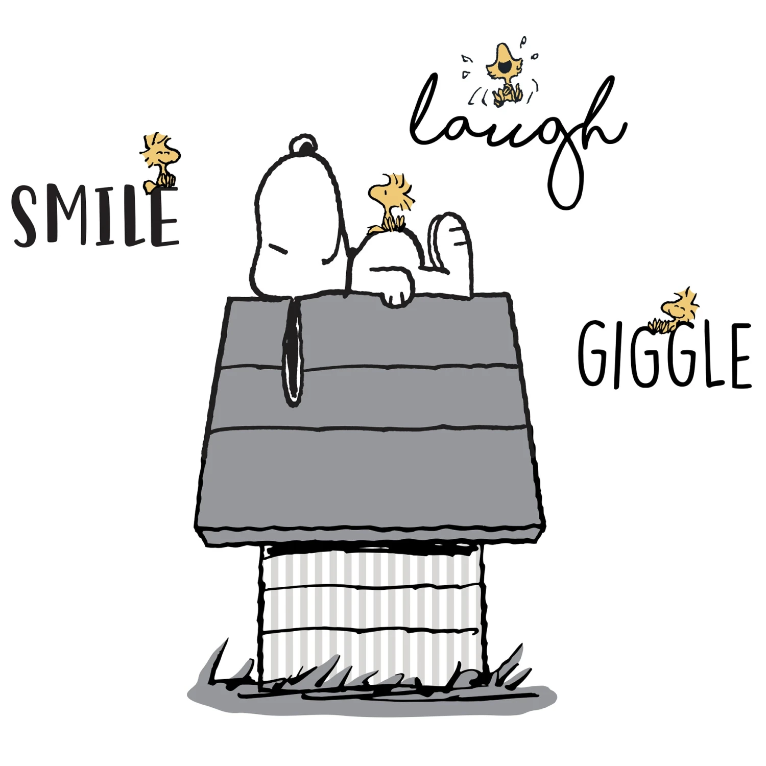 Add a designer touch to your baby’s nursery with these custom Snoopy wall decals. Featured is one of Snoopy’s favorite places which is on top of his doghouse. Of course, his sidekick, Woodstock, sits happily on his tummy. Included are the words “SMILE”, “LAUGH” and “GIGGLE”, with a cute little Woodstock approving each word. These decals are easy to apply and will not harm your walls. SKU: 890048, UPC: 084122011144.