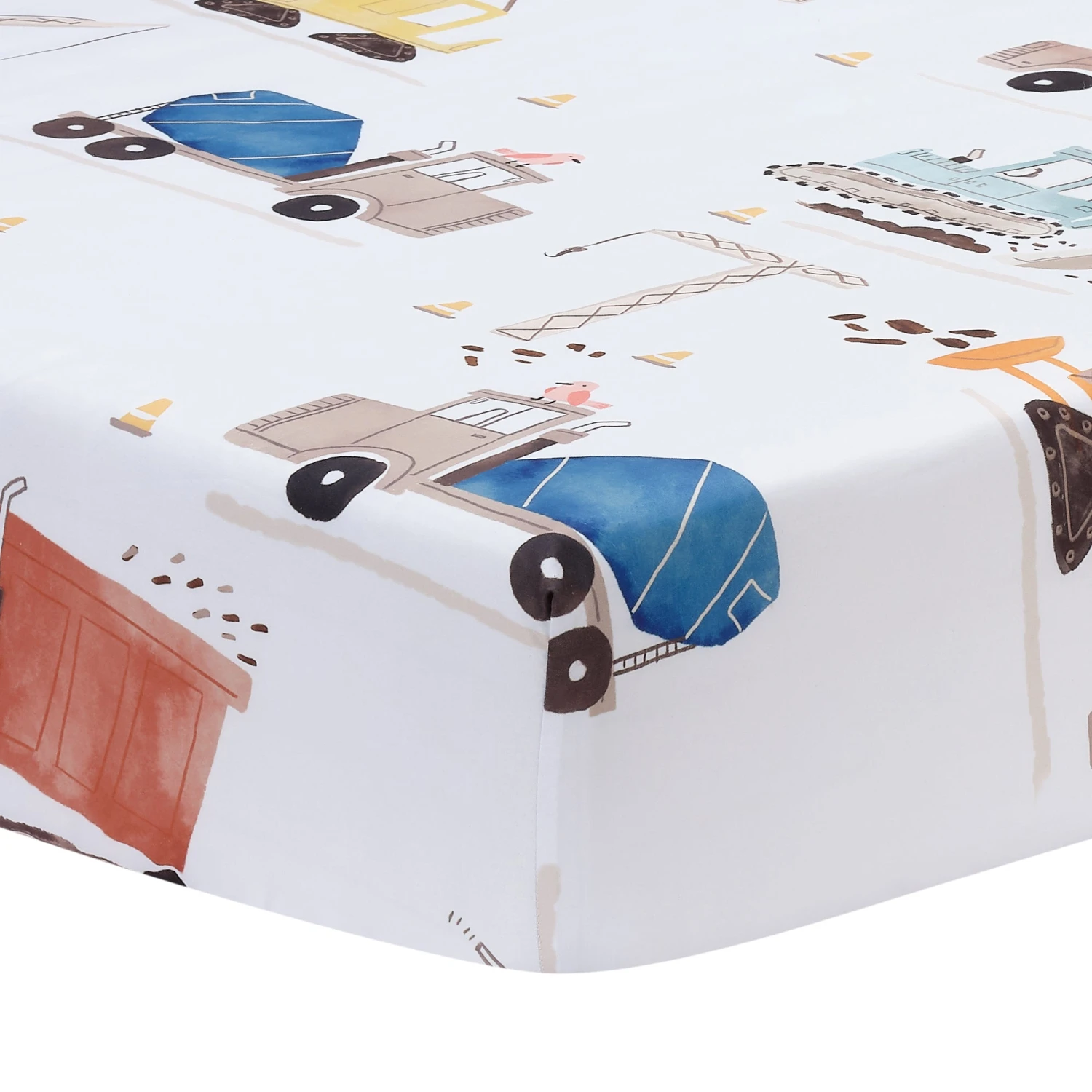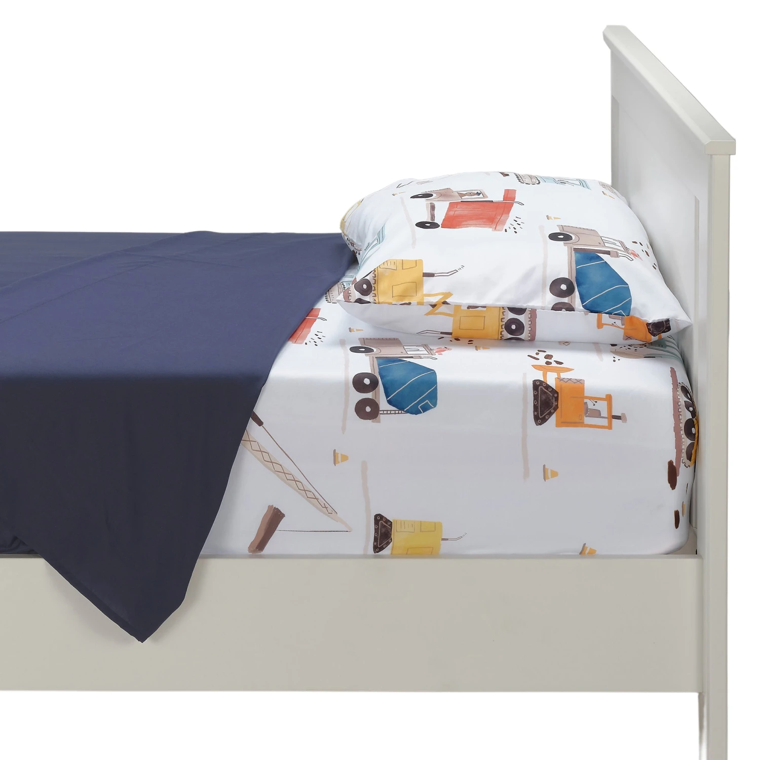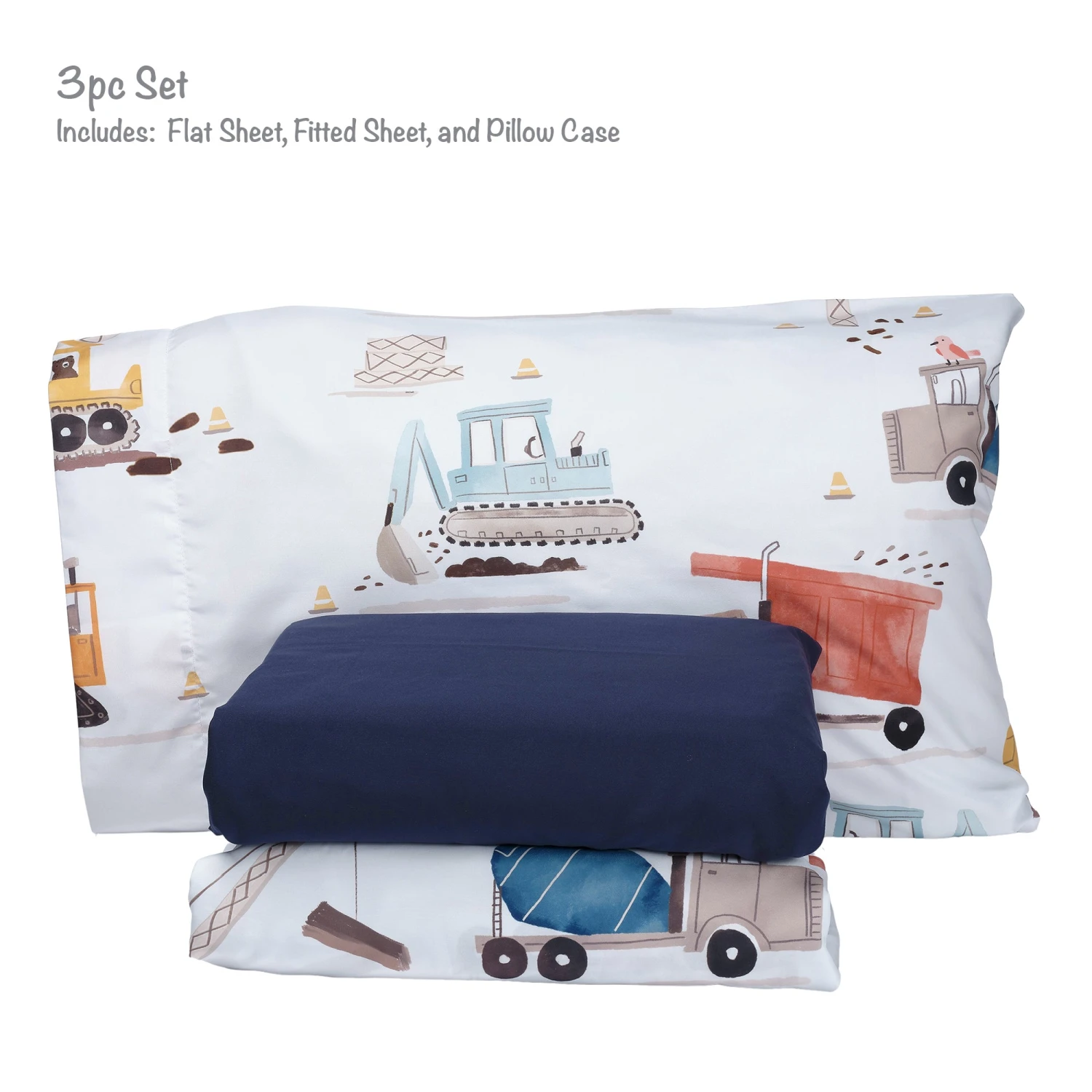 Your child will love sleeping on these soft microfiber sheets and pillowcase. The three-piece set includes one twin size flat sheet, one twin size fitted sheet, and one standard size pillowcase. The fitted sheet and pillowcase feature a variety of construction vehicles in vibrant watercolors. The fitted sheet has elastic all the way around for a secure fit. The top sheet is 66” × 96“ in navy blue with a self-border at the top. SKU: 287006TS, UPC: 084122018013.