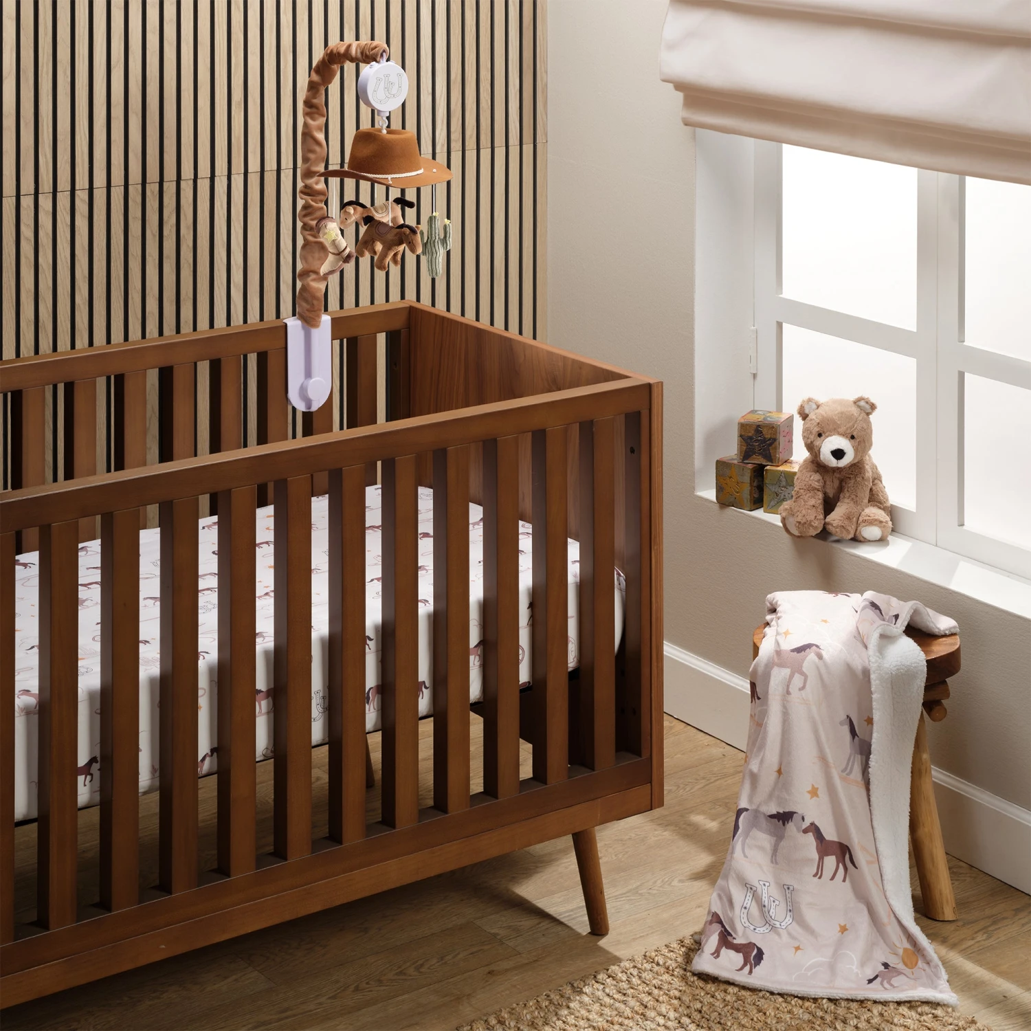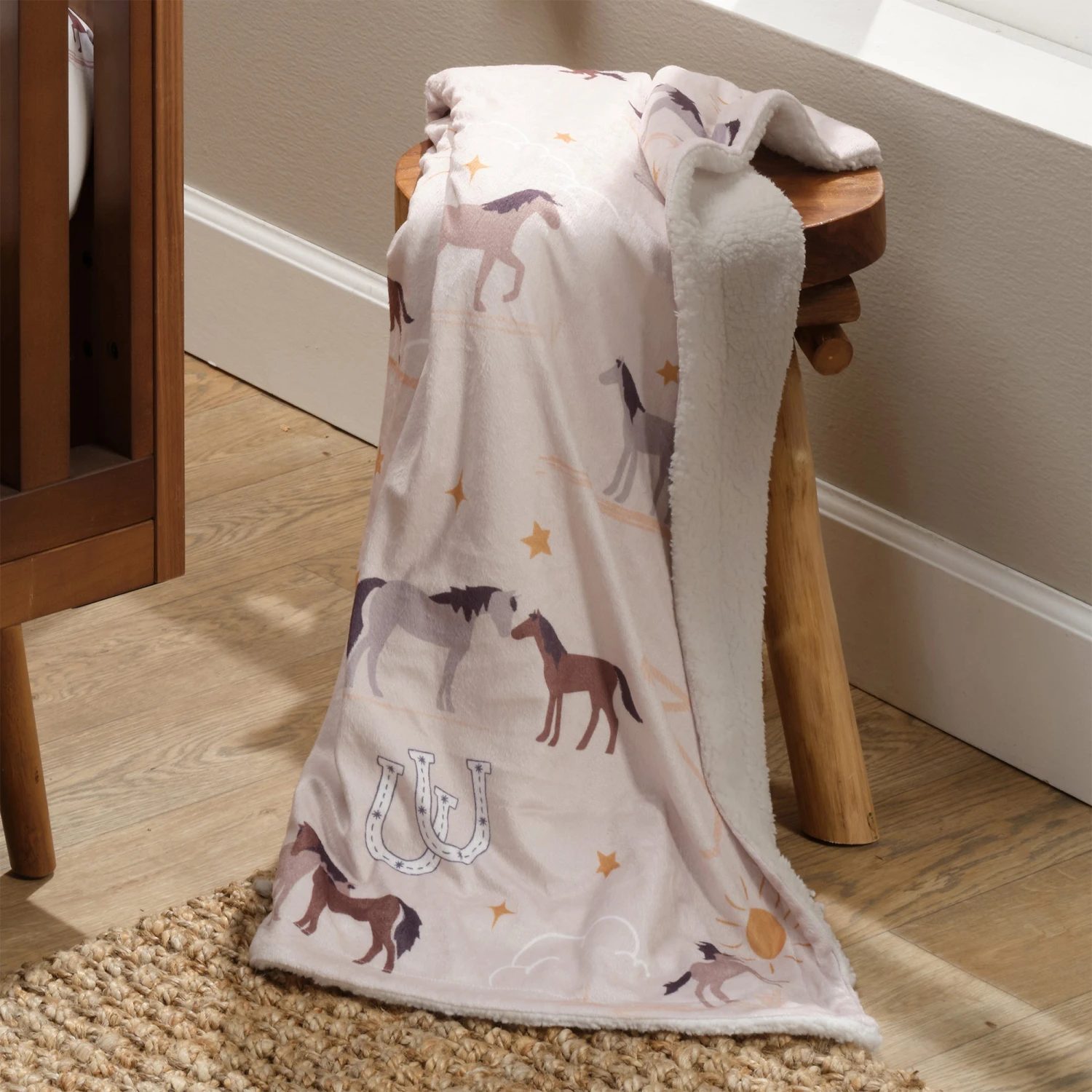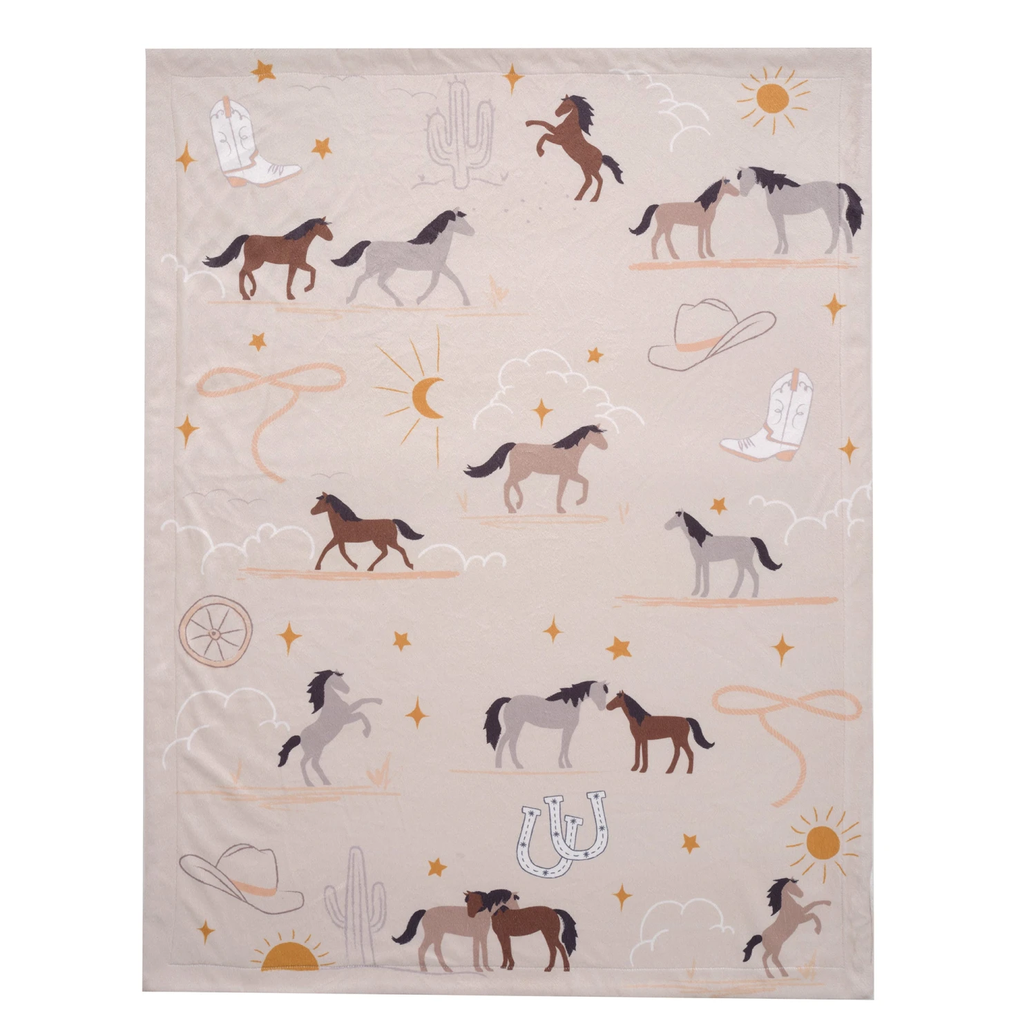 This soft and cozy cowboy/cowgirl themed baby blanket has a minky front with a luxurious white faux shearling back. It is 30 inches by 40 inches in size and features playful horses, cowboy hats, boots, wagon wheels, cacti, sun, moon, and clouds. This blanket captures the rustic charm of the frontier with a modern sophisticated touch. It makes a great baby shower gift or welcome home baby gift. SKU: 656034, UPC: 084122019928.