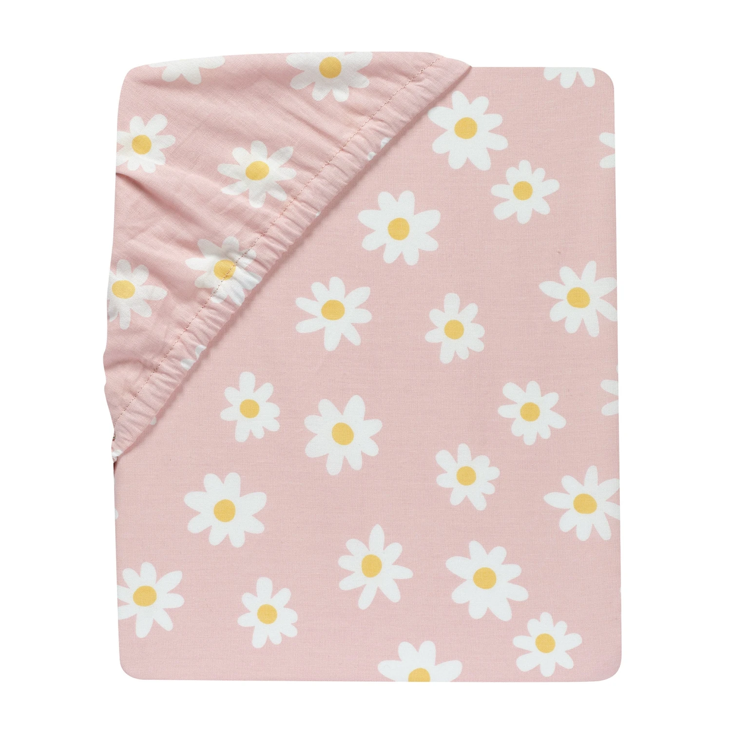 This lovely breathable 100% cotton fitted crib sheet is on a rose color ground filled with pretty white daisies with sun-kissed yellow centers. There is elastic all the way around ensuring a safe and secure fit on a standard size crib or toddler mattress measuring approximately 28” X 52”. It is machine washable for easy care. SKU: 745006B, UPC: 084122018976.