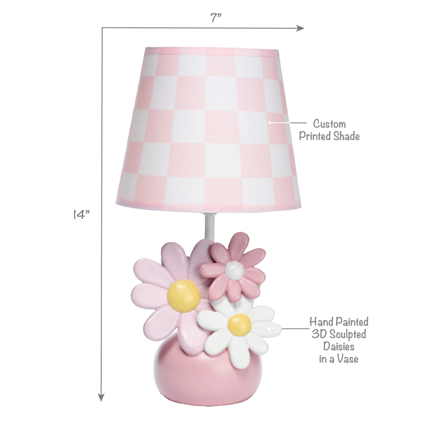 Add a soft glow to your child’s room with this hand-painted 3-dimensional resin lamp with shade and LED light bulb. An adorable rose pink flower pot is filled with one white daisy, one petal pink daisy, and one rose pink daisy along with two green leaves. The total height of the lamp with shade is approximately 14”. The coordinating lamp shade is a pretty petal pink and white checkered pattern. Comes complete with an energy efficient LED light bulb. SKU: 745024B, UPC: 084122019027.