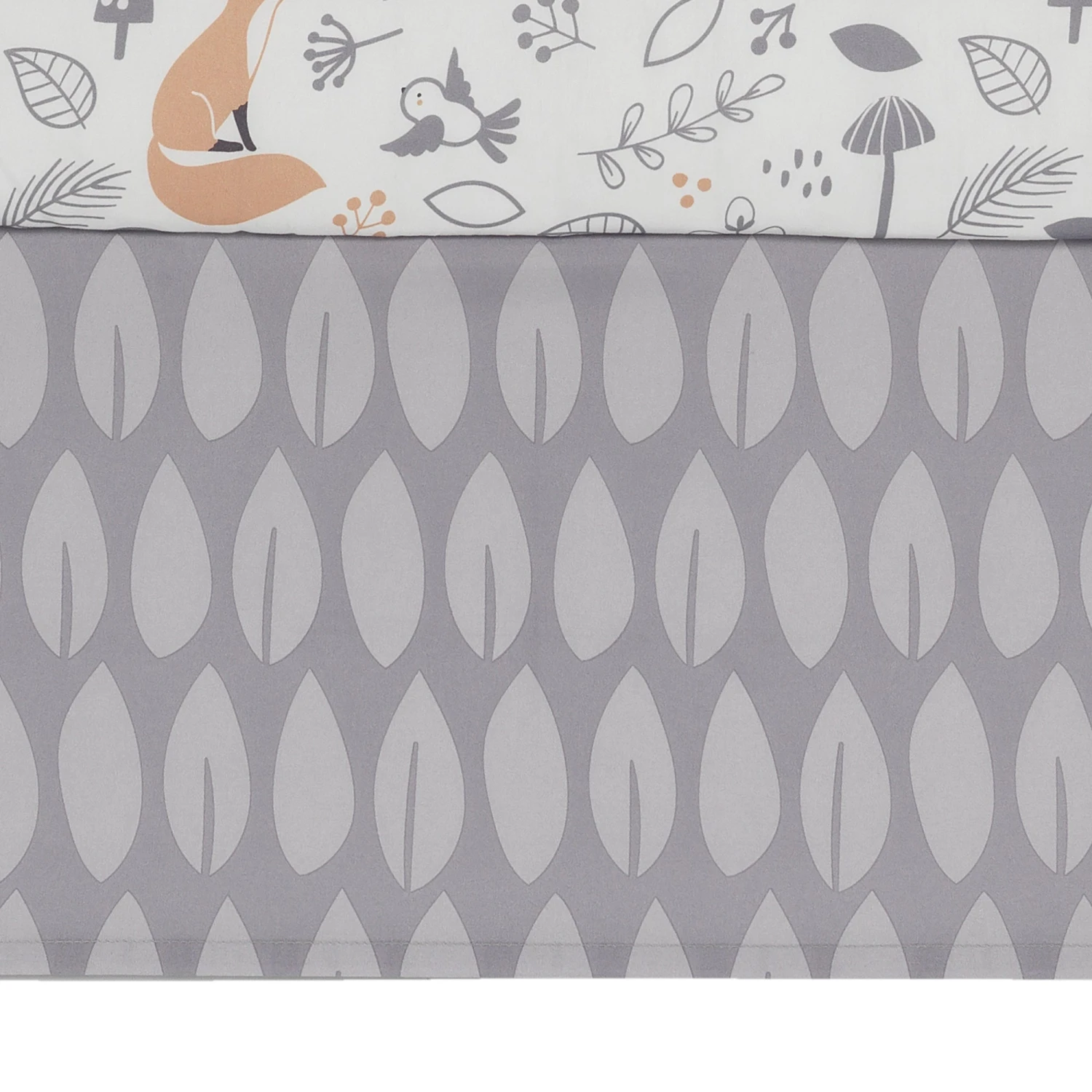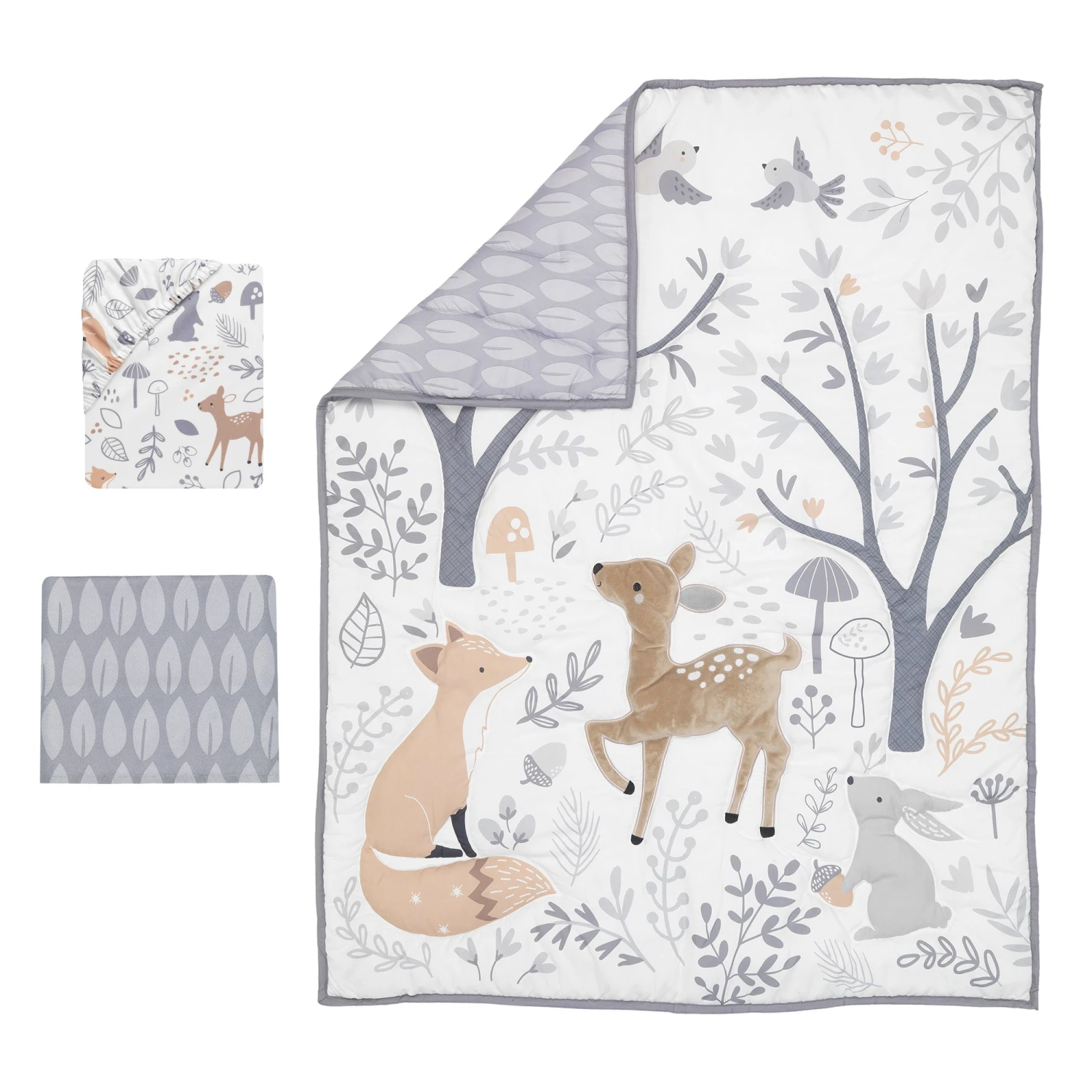 This 3-piece baby bedding crib set includes one quilt (35” X 44”), one fitted crib sheet (28” X 52”), and one crib skirt (dust ruffle) (51” X 27”). Designed in soft shades of gray, hazelnut and tan this enchanting forest is filled with trees, birds, mushrooms, a soft tan velour appliqued deer, a cute gray rabbit, and a mischievous fox. The back of the quilt is a pretty leaf pattern in two tones of gray and mirrors the crib skirt. The fitted crib sheet features all the charming forest animals along with leaves and mushrooms. The crib sheet has elastic all the way around ensuring a safe and secure fit. This collection was made in a soft microfiber fabric and is durable and machine washable. SKU: 285003V, UPC: 084122011410.