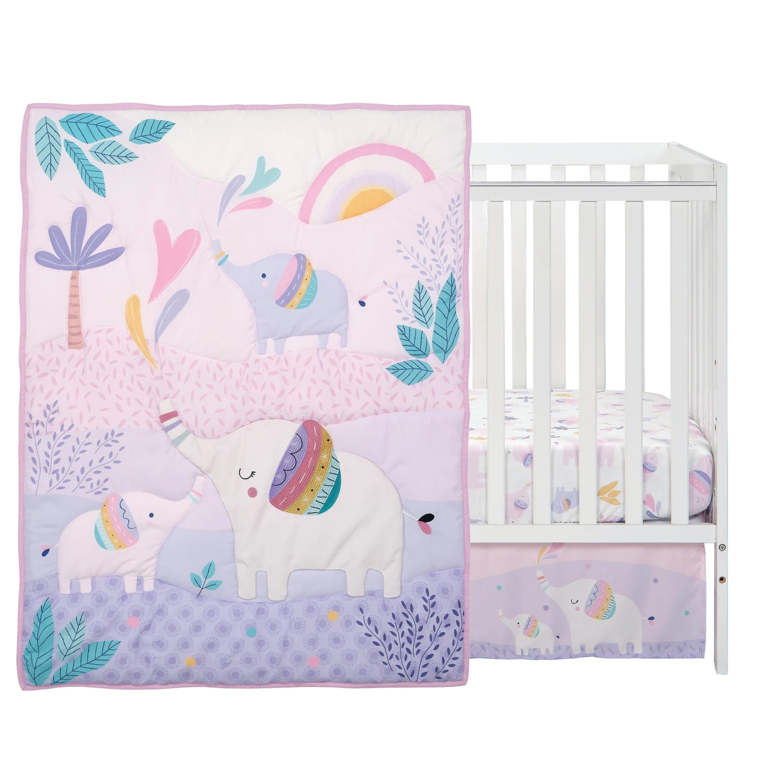 This three-piece crib bedding set includes one quilt, one fitted crib sheet and one crib skirt. It is made in a super soft microfiber material. This landscape designed quilt features mommy and baby elephants with pretty colorful ears. The mommy elephant is made in a soft white velour. Her ears are embroidered in pink, purple, gold, minty blue and turquoise. She has pastel embroidered rings on her trunk. There are tropical bushes, wavy lavender leaves, a palm tree, and a pastel rainbow. The fitted crib sheet is on a white ground with pastel color elephants along with leaves and palm trees. This fitted sheet has elastic all the way around ensuring a safe and secure fit on a standard sized crib mattress measuring 28” X 52”. The crib skirt adds the finishing touch to your child’s crib. It features the mommy and baby elephants on a pretty pastel ground with palm trees and large leaves. The four-sided crib skirt has a 10” drop. SKU: 286003V, UPC: 084122015845.
