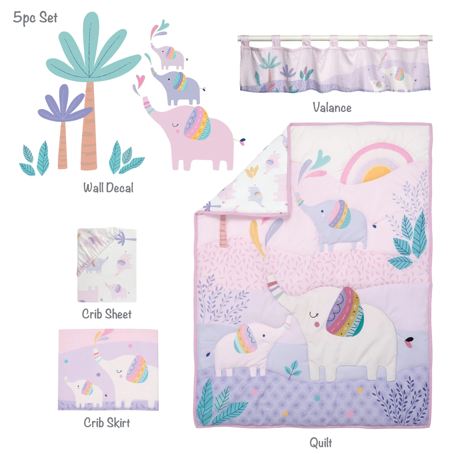 This 5 piece baby bedding and decor kit includes one quilt, one fitted crib sheet, one crib skirt, one window valance and one wall decal. This landscape design features mommy and baby elephants with pretty colorful ears. The mommy elephant is made in a soft white velour. She has pastel embroidered rings on her trunk. There are tropical bushes, wavy lavender leaves, a palm tree, and a pastel rainbow. The fitted crib sheet is on a white ground with pastel color elephants along with leaves and palm trees and has elastic all the way around ensuring a safe and secure fit on a standard sized crib mattress measuring 28 inches by 52 inches. The crib skirt adds the finishing touch to your child’s crib. It features the mommy and baby elephants on a pretty pastel ground with palm trees and large leaves. The window valance features a mommy and baby elephant with colorful ears along with palm trees, leaves, and a light pink sky. Measures 54 inches long, 13.5 inches high.The wall decals include three sheets 12 inches by 18 inches with eighteen pre-cut pieces. SKU: 286005K, UPC: 084122018945.