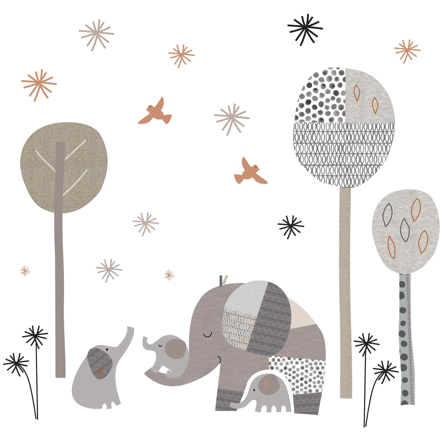 Add a designer touch to a feature wall in your child’s room with these easy on wall decals. There are four sheets that are 12” X 18” each with 22 pre-cut pieces. The mural features our mommy elephant with three of her babies along with three stylized trees, foliage, and birds. These work best on smooth walls. The finished size as shown is approximately 45” X 25”. They are so easy to apply and will not harm your walls. SKU: 237048, UPC: 084122013896.
