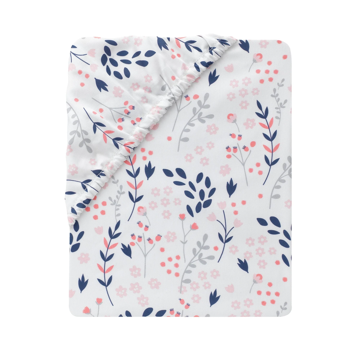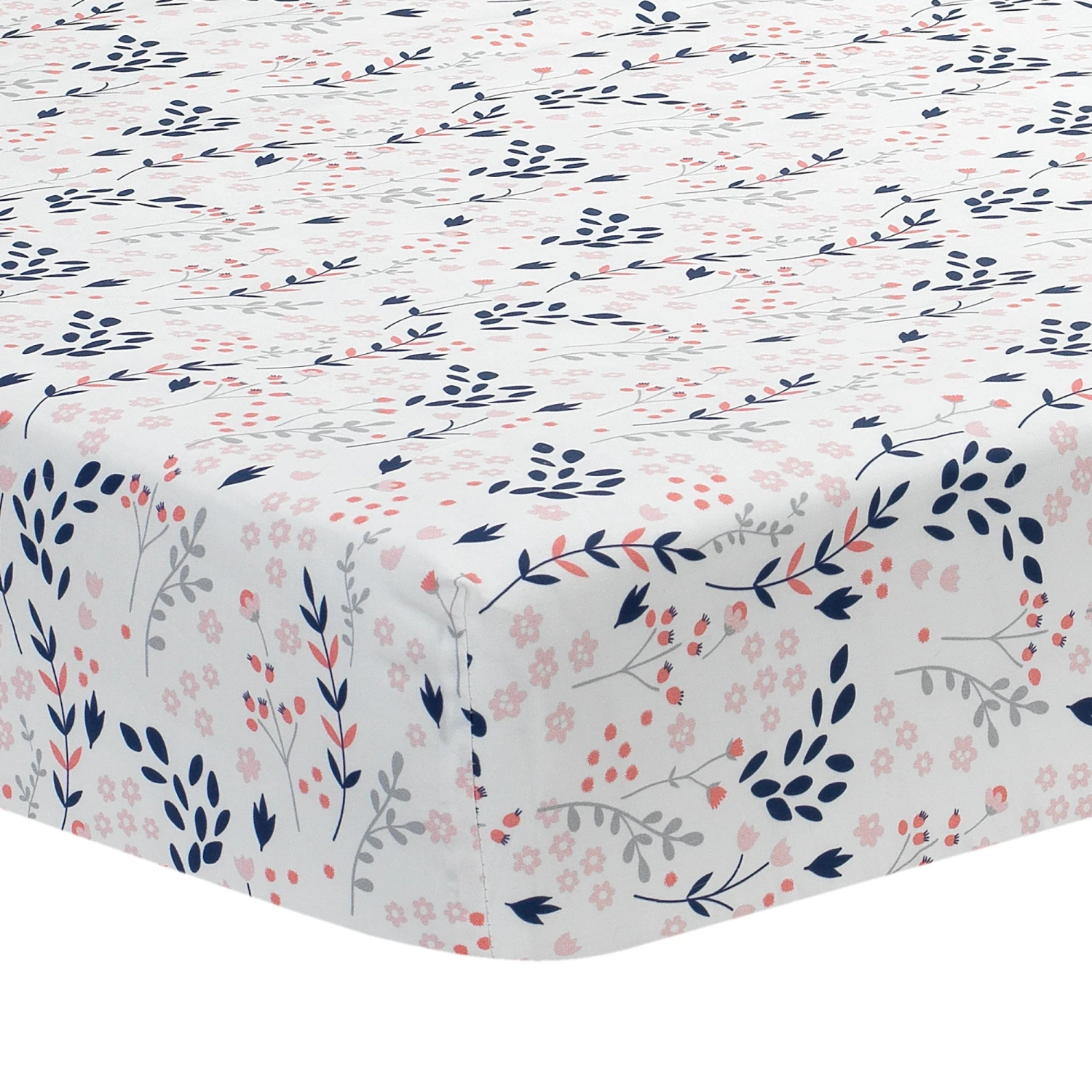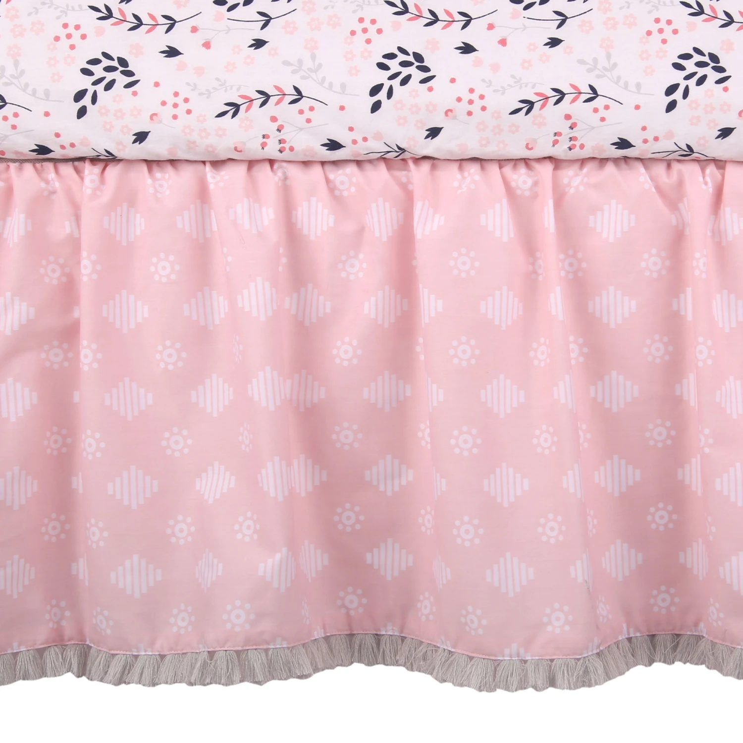 This adorable nursery crib bedding set includes one quilt, one 100% cotton fitted crib sheet, one patterned crib skirt (dust ruffle) and one wearable blanket which is recommended for safe sleep. A sweet gray owl and owlet, mommy and baby foxes and a cute little hedgehog decorate this charming woodland collection. Intricate embroidered flowers and leaves add interest to these darling characters. These characters are made out of a super soft furry minky. The quilt has pom pom trim and is finished with a soft pink ribbed velour border. The back of the quilt is a pretty diamond and flower print. The 100% cotton fitted crib sheet is a floral print in pinks, navy, and gray. Complete the bedding with a pink diamond and flower crib skirt with gray tassel trim which decorates the bottom. The wearable blanket is the fourth piece and is 100% cotton interlock. The chest area has an appliqued gray owl with embroidered details. Wearable blankets are recommended for safe sleep. This fits a size small/medium and is 27” in total length. SKU: 885004V, UPC: 084122007970.