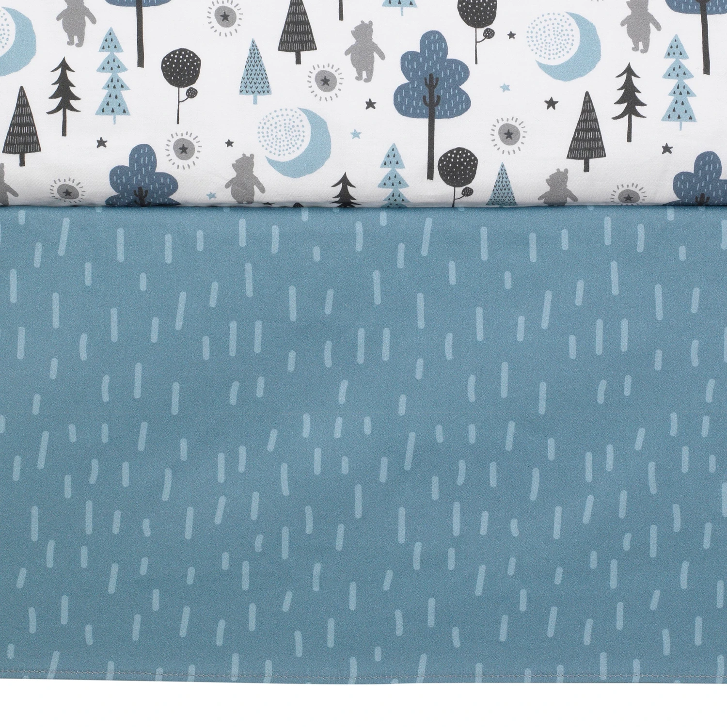 The 3-Piece crib bedding set includes one quilt, one fitted crib sheet and one crib skirt. The quilt features a charming hillside in shades of blues and grays with Winnie the Pooh, back to back with his best friend Piglet. Under the starry night sky, they amuse themselves blowing dandelion flowers into the night air. Winnie the Pooh is fully appliqued in a soft faux shearling and is wearing his favorite blue chambray shirt. Tigger, sitting close by on the hillside is enjoying the view. The fitted crib sheet is decorated with various trees in different shapes and sizes along with silhouettes of Winnie the Pooh and moons and stars. The crib skirt is a pattern of two colors of blue. This collection has been digitally printed in a high resolution on microfiber which enhances the blues and grays and it is eco-friendly. SKU: 780003V, UPC: 084122780033.