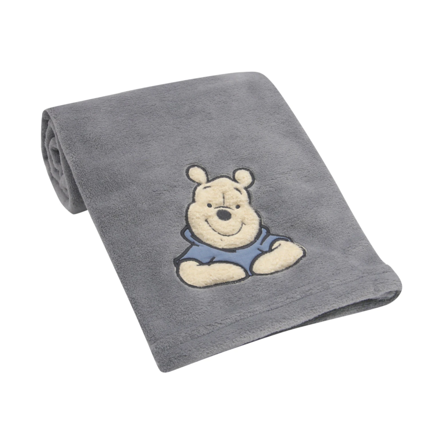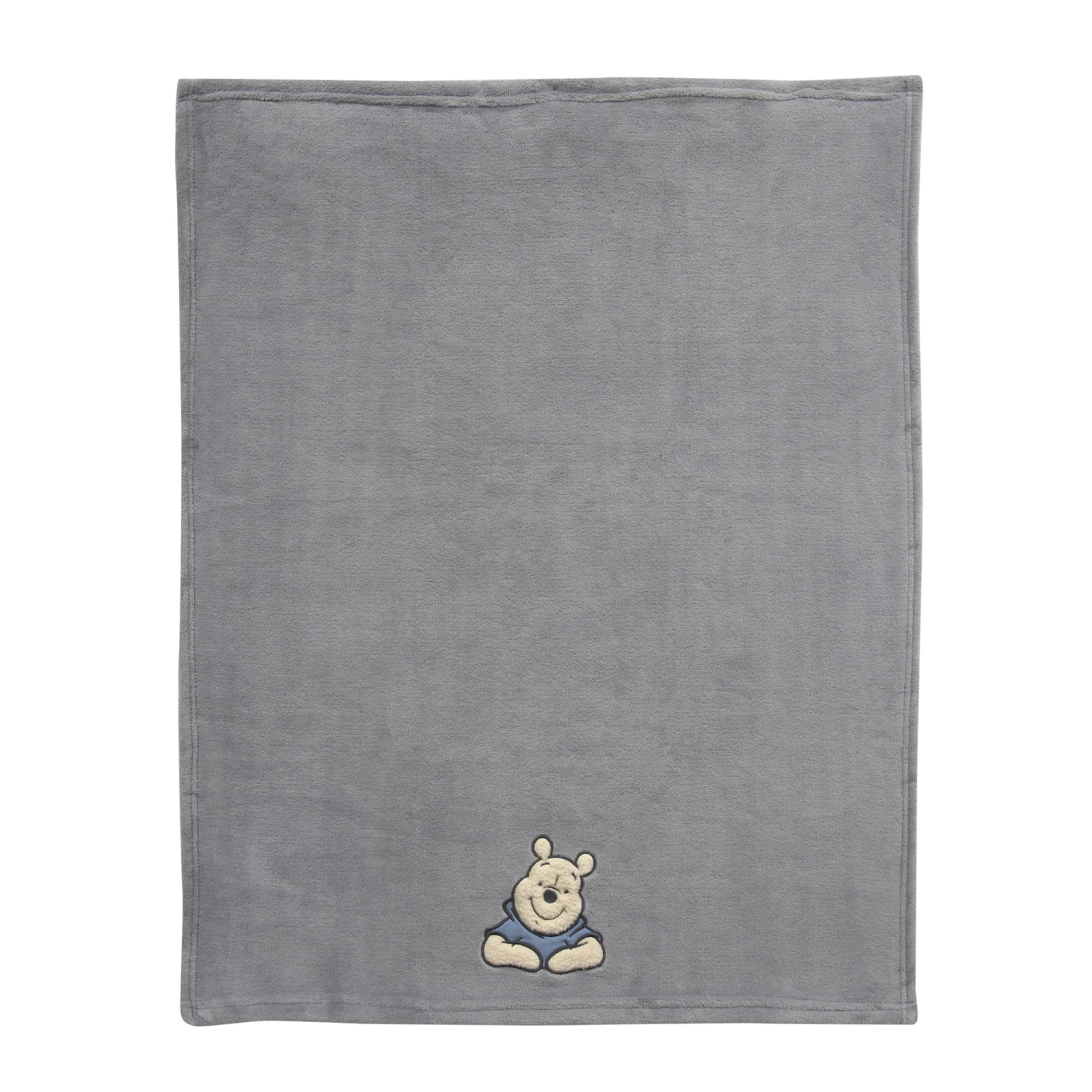 Winnie the Pooh is at the bottom center of this soft plushy gray blanket. He is wearing his favorite blue chambray shirt. The blanket is 30” x 40” and is perfect for keeping your little ones warm and cozy. SKU: 780034, UPC: 084122780347.