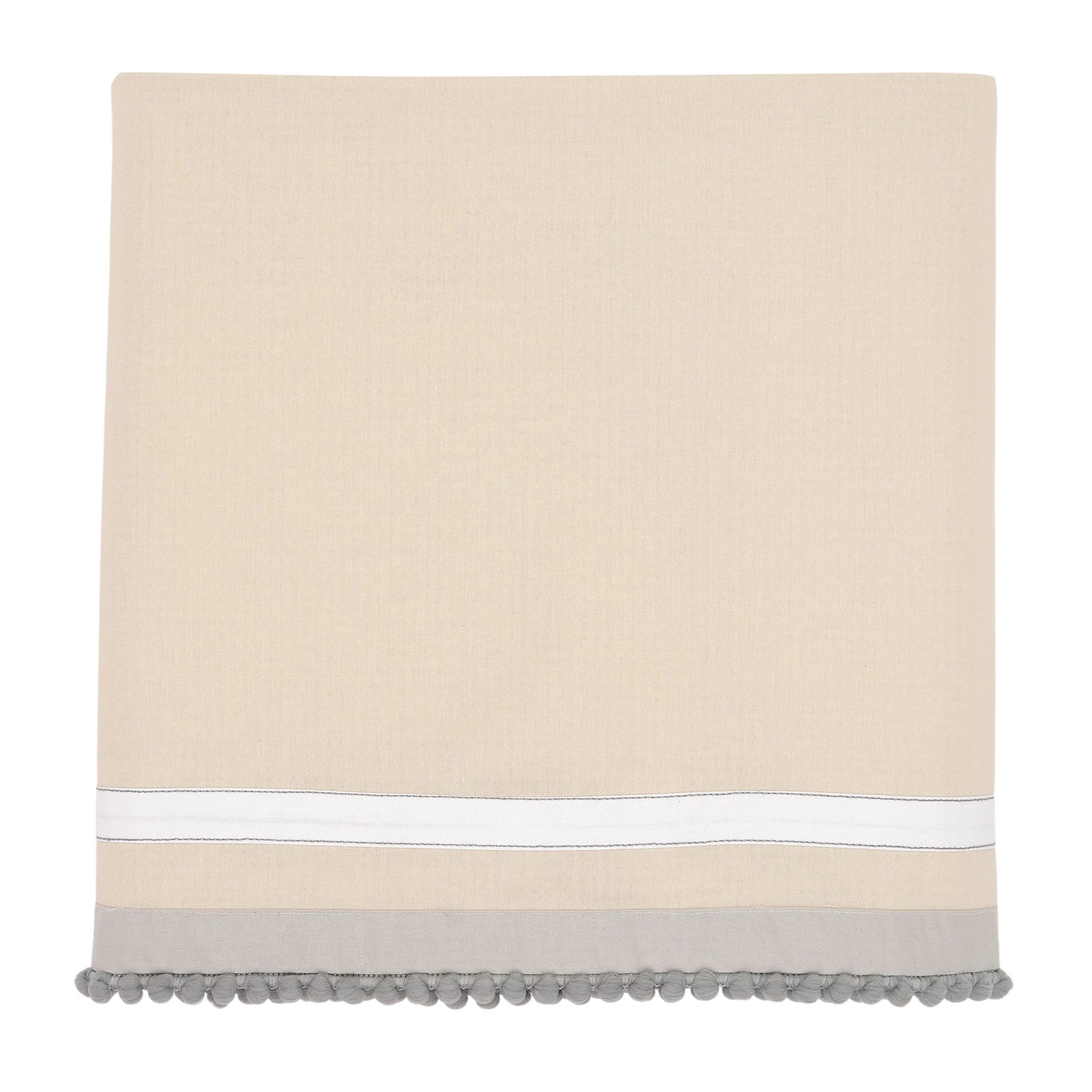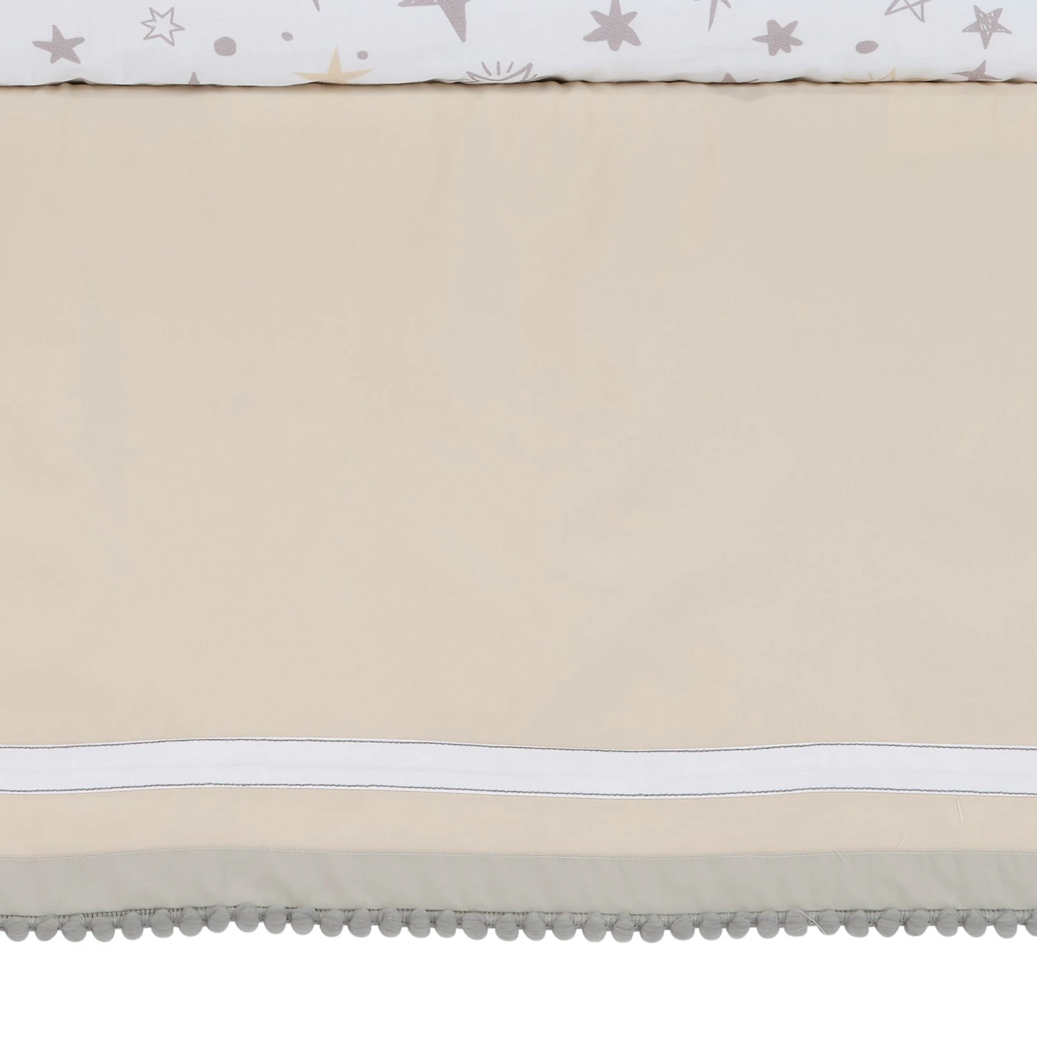 Your little one will reach for the stars with this dreamy gender-neutral three-piece nursery crib bedding set. The set includes one quilt, one breathable 100% cotton fitted crib sheet and one crib skirt. This amazing cotton sateen quilt front is expertly embroidered and appliqued. There are heather gray chambray clouds, creamy velour appliqued cloud, appliqued copper stars, and a large embroidered crescent moon with a 3-dimensional star and the words, “You are my sun my moon and all of my stars” embroidered in script writing. The back of the quilt is a 100% creamy cotton twill. The fitted crib sheet is 100% cotton and is a tossed print of crescent moons and stars on a soft white ground. The fitted crib sheet has elastic all the way around ensuring a safe and secure fit on a standard size crib mattress. The crib skirt adds the finishing touch to your child’s crib. It is made in a cotton twill in a lovely creamy color. There is a ¾” wide white twill tape along with gray pom poms. SKU: 733003V, UPC: 084122016262.