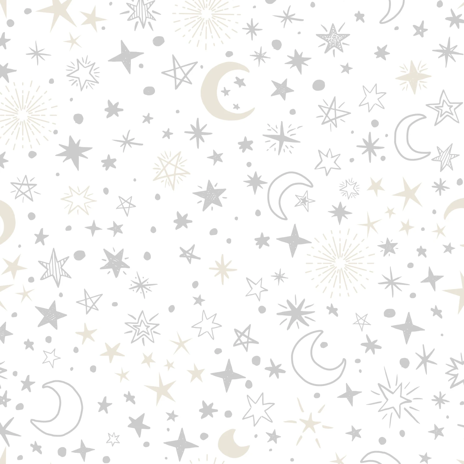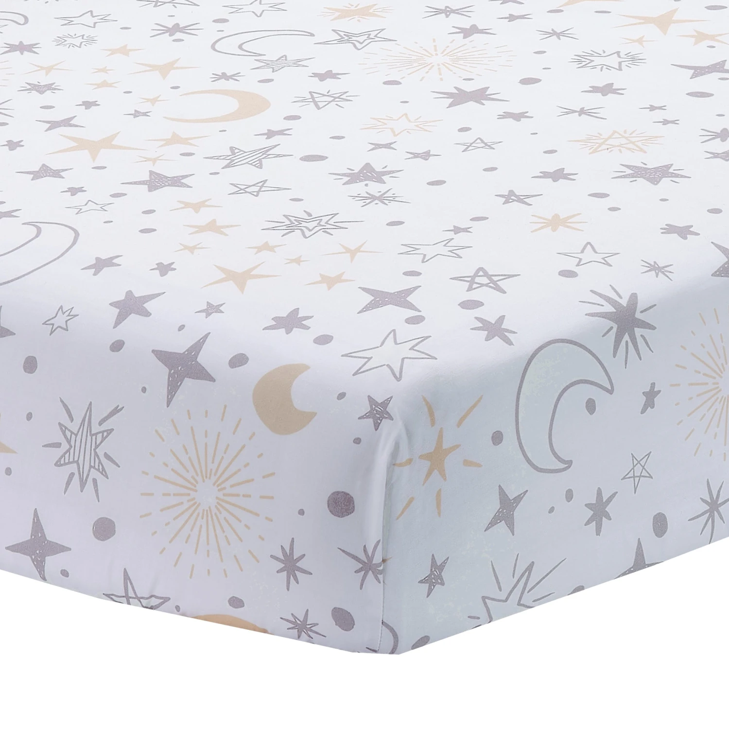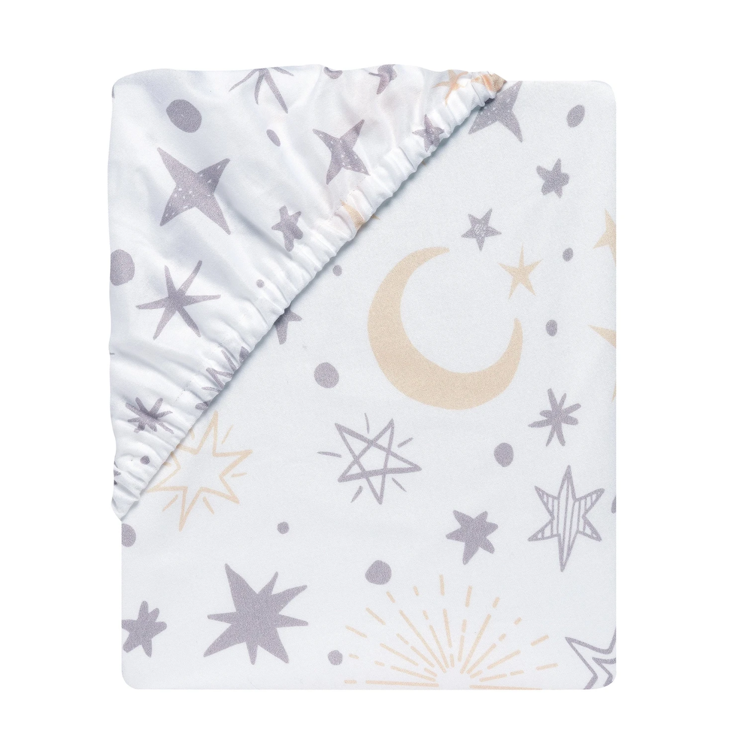 Tossed crescent moons and stars decorate this breathable 100% cotton fitted crib sheet. It is on a soft white background with multiple sized stars that are gray and copper. The sheet has elastic all the way around ensuring a safe and secure fit on a standard sized crib mattress measuring 28” X 52”. SKU: 733006B, UPC: 084122016279.