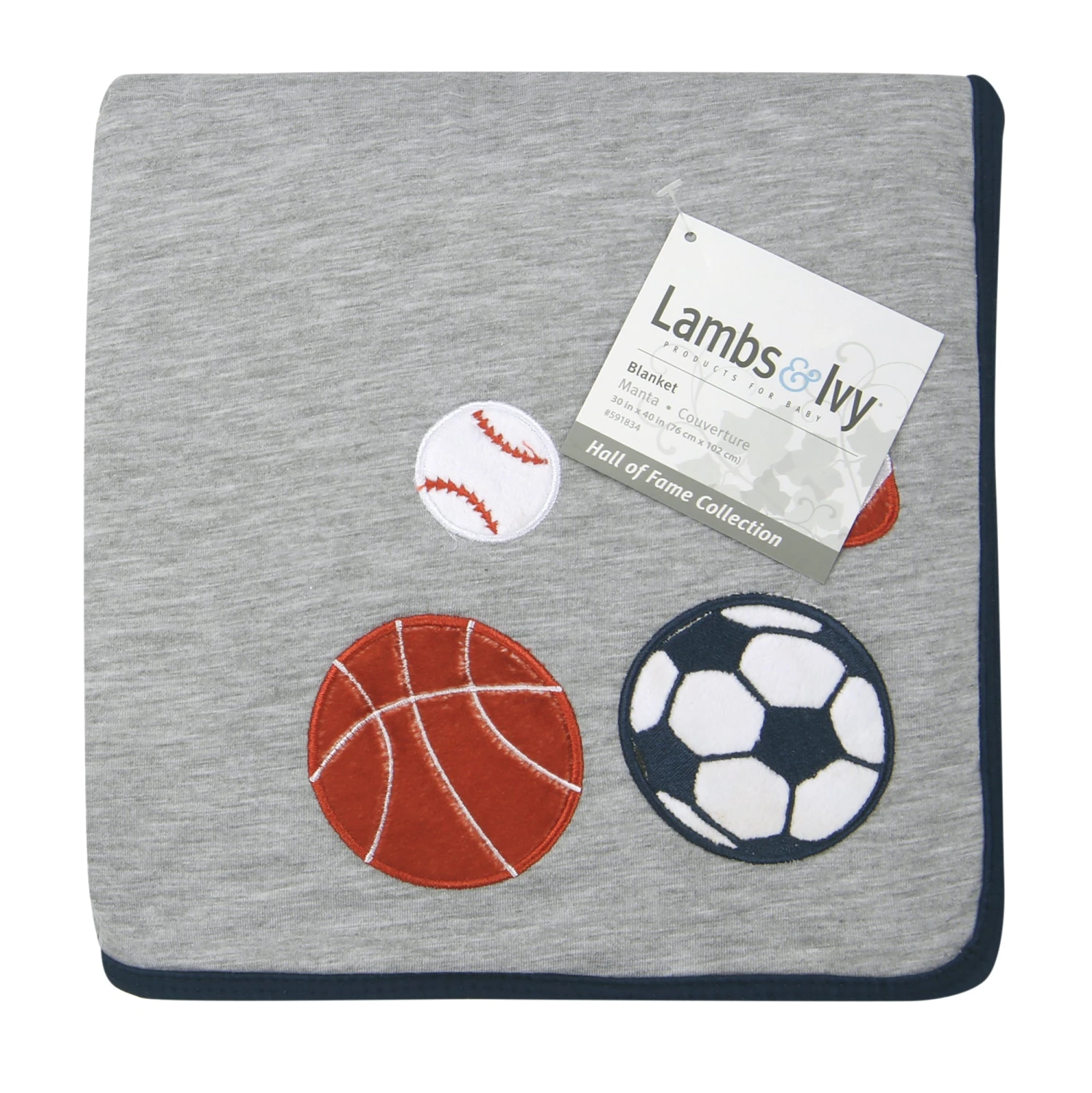 A basketball, football, baseball, and soccer ball are appliqued on this soft heather gray jersey baby blanket. The front is a cotton-blend jersey with a soft faux shearling back and navy trim. It is 30” X 40” and makes a great stroller blanket, cuddling with your little one blanket or just running errands blanket. It is a top baby registry pick and perfect as a baby shower gift or welcome home baby gift. SKU: 591834, UPC: 084122011342.