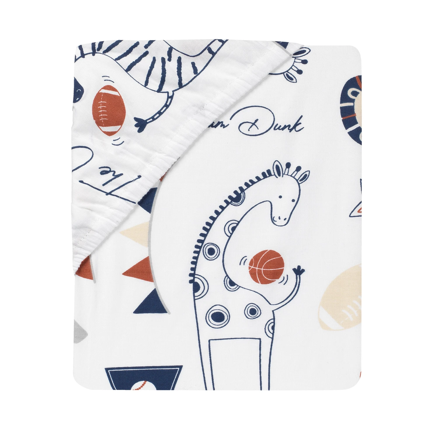 This fun sports themed breathable 100% cotton fitted crib sheet features a combination of baseballs, basketballs, footballs, and soccer balls along with the athletic all-star animal team of lions, giraffes, zebras, and elephants. It has elastic all the way around for a safe and secure fit on a standard size crib mattress measuring 52” X 28”. SKU: 591806B, UPC: 084122011328.