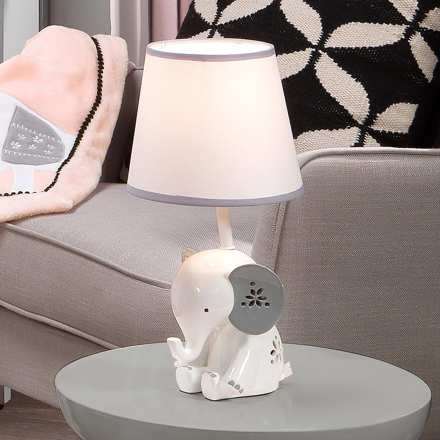 The lamp base is a custom, 3-dimensional sitting white elephant that measures 6” in height and has large gray ears each carved with flower shapes. There are additional flower shapes carved on her back and her toenails are painted in gray. The coordinating lampshade is white with gray binding. There is an energy-efficient light bulb included. This unique elephant lamp measures 14.25 inches tall and will add a soft glow to your child’s room. SKU: 651024B, UPC: 084122012257.