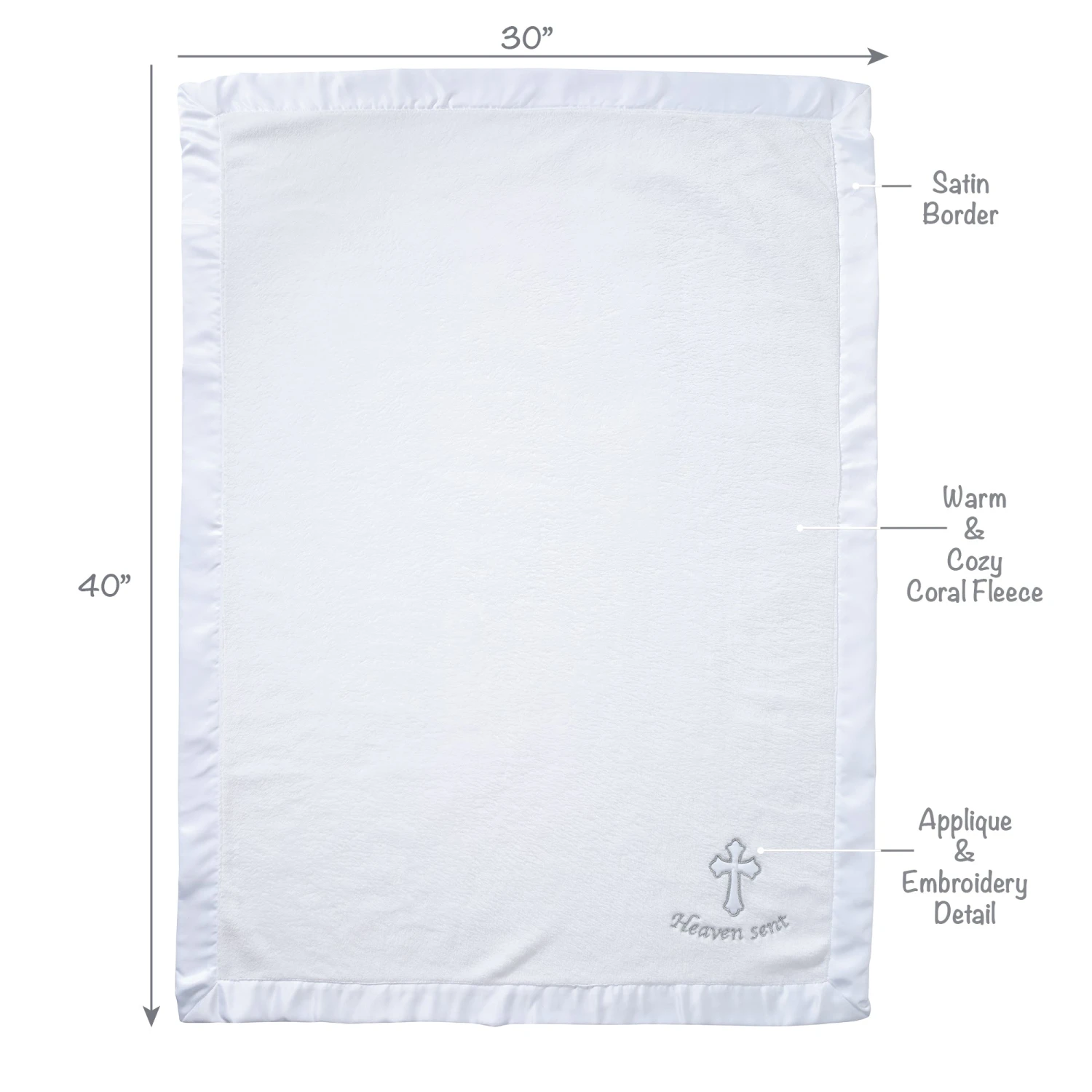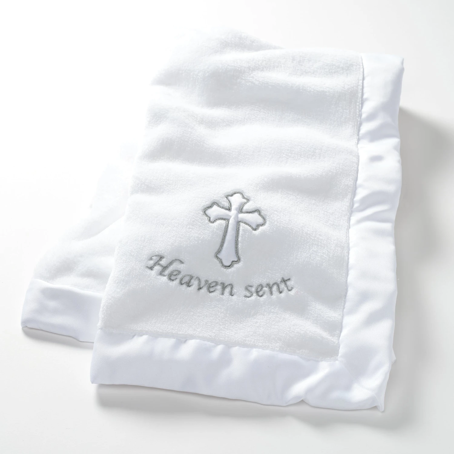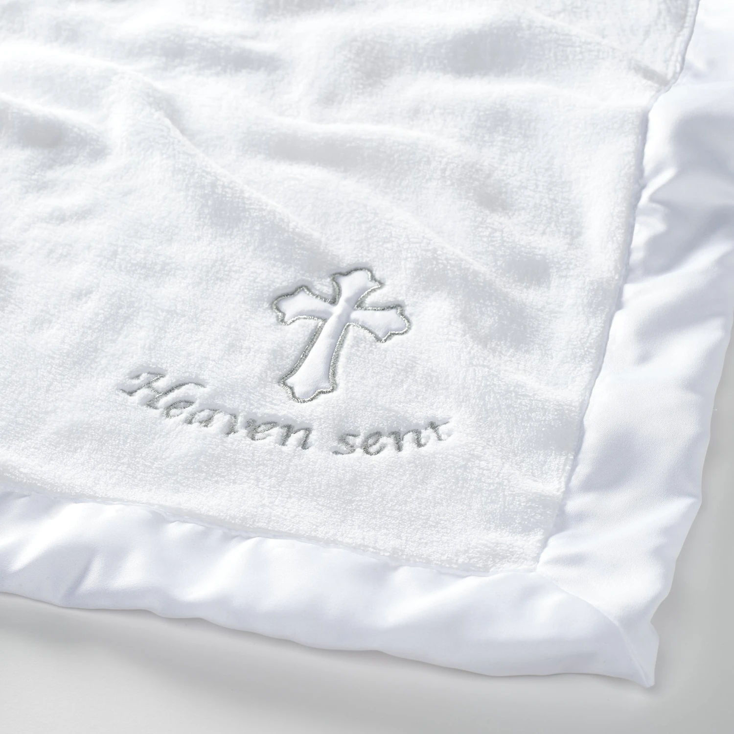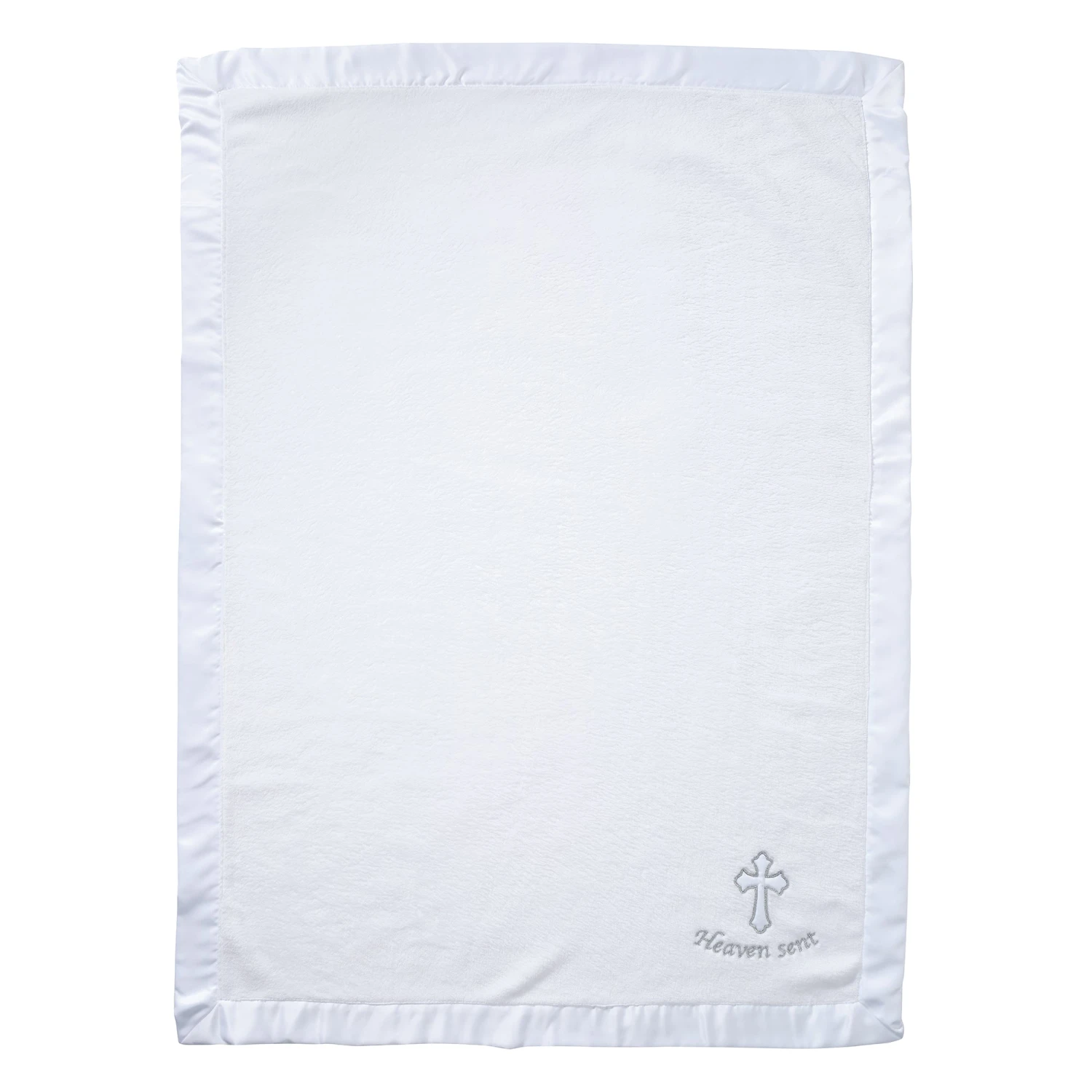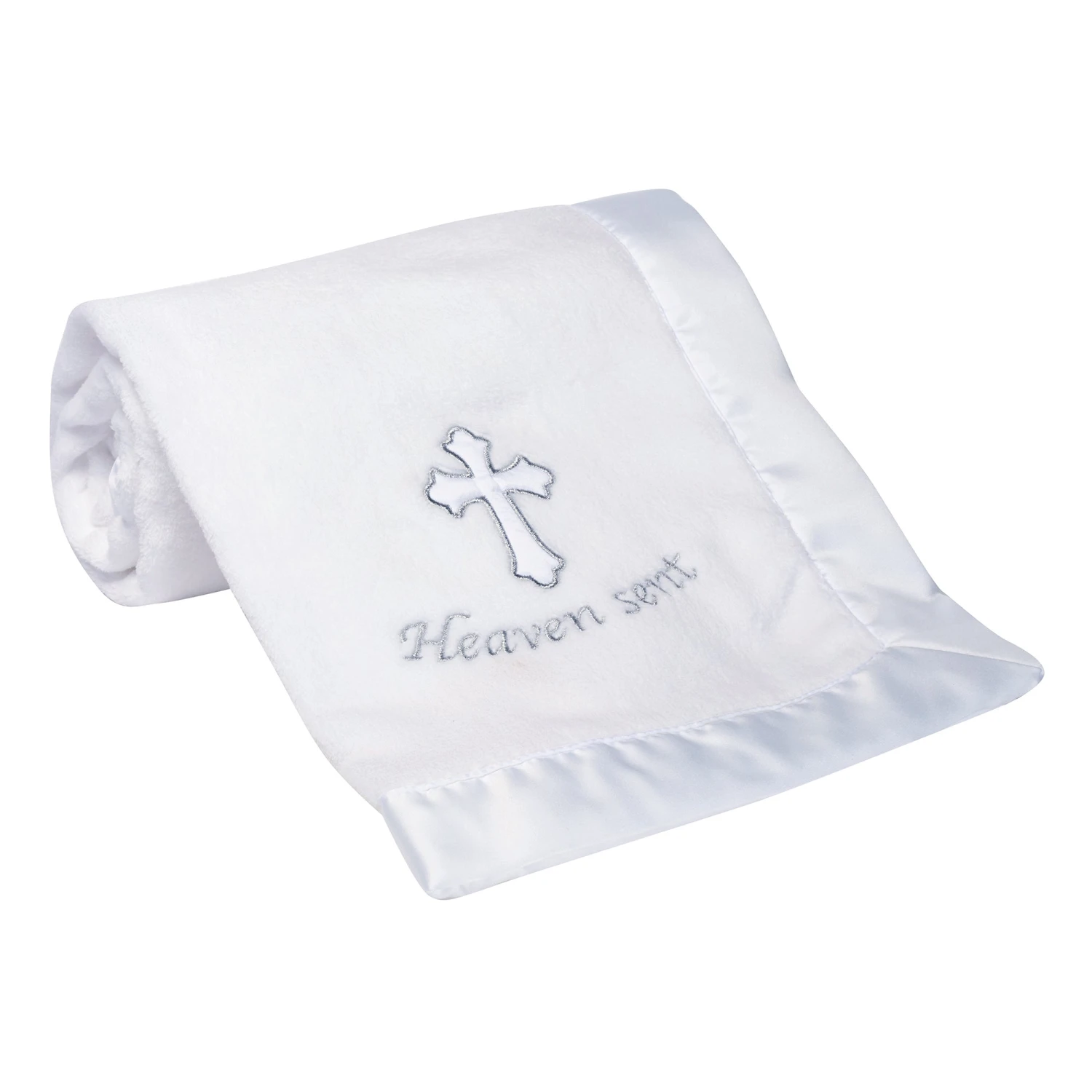 Celebrate your little one’s special day with this 30 inch X 40 inch baptism/christening blanket made from the softest fleece, ensuring ultimate comfort for your precious baby. A wide white satin border frames the blanket, adding a touch of elegance. The corner of the blanket is a beautifully embroidered white cross applique, accented with silver metallic thread, and the words “Heaven sent” are embroidered in shimmering silver. A keepsake to be treasured forever. SKU: 707034HE, UPC: 084122020023.