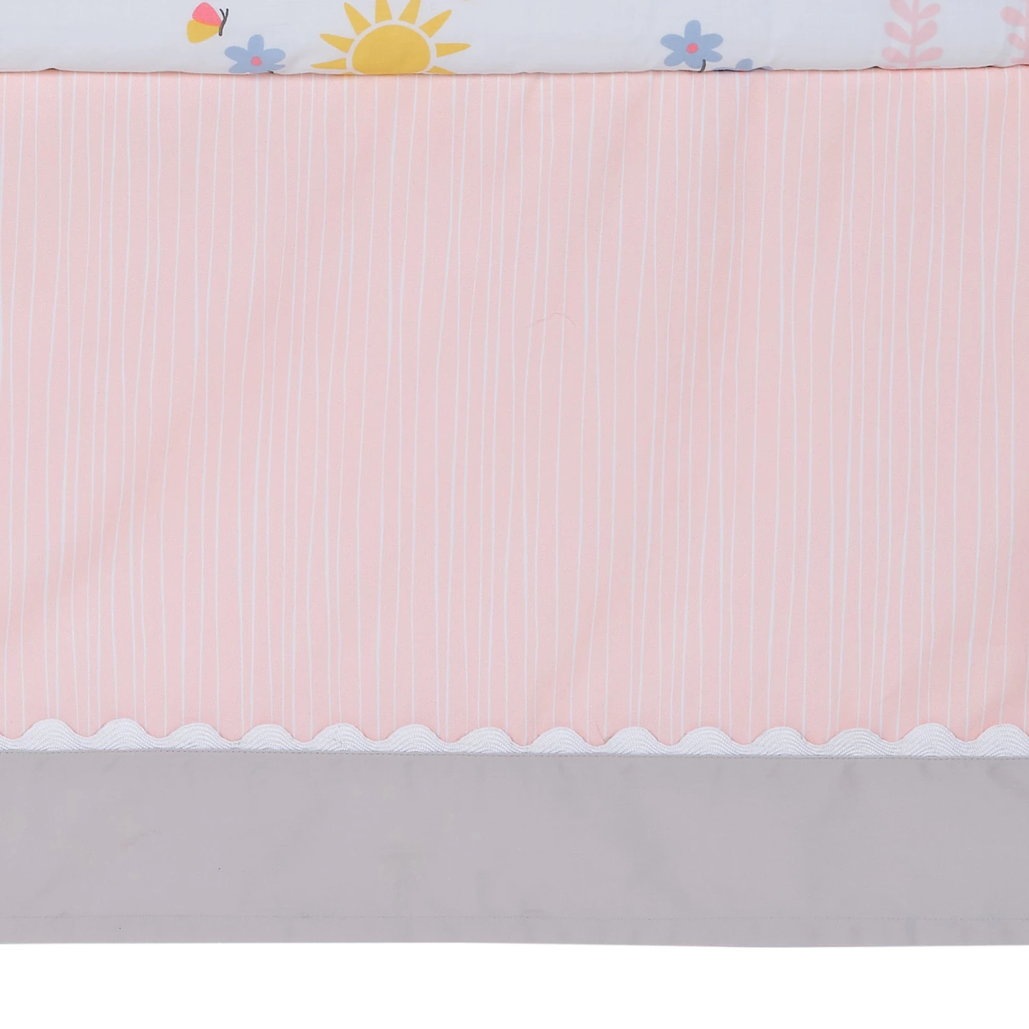 The three-piece infant crib bedding set includes one quilt, one breathable 100% cotton fitted crib sheet, and one crib skirt. Adorable jungle animals are expertly appliqued in soft textured fabrics with dimensional details. A modern color palette features pink, rose, peach, strawberry, apricot, gray and white. The gray minky elephant on the quilt has dimensional ears with a playful pink velour birdie on her head. The large giraffe is made in a light peachy velour with strawberry-colored circles. The cutest zebra named Jazzy is made of white velour and is embroidered with colorful stripes. The breathable 100% cotton fitted crib sheet has mommy and baby giraffes, elephants, zebras, yellow suns, butterflies, plants, and wildflowers. The crib sheet has elastic all the way around ensuring a safe and secure fit on a standard sized crib mattress measuring 28” X 52”. The coordinating crib skirt adds the finishing touch to your child’s crib. The upper panel is a pretty peach and white cotton twill blend. The lower panel is solid gray twill with white ric rac trim in between. It has a 14 ½” drop. SKU: 735003V, UPC: 084122016842.