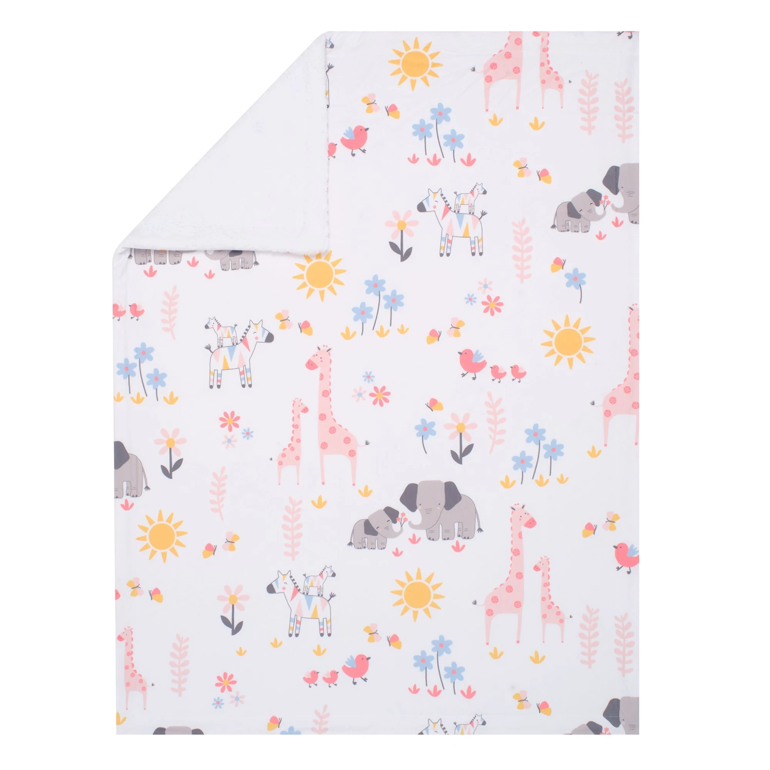 Keep your little one warm and cozy with this soft minky front and fleece faux shearling back baby blanket. Mommy and baby giraffes, elephants, zebras, and birds, decorate this charming blanket along with butterflies, plants, and wildflowers. Perfectly sized at 30” X 40” making it a great stroller blanket and perfect for wrapping up baby around the house. It makes a lovely baby shower gift or welcome home baby gift. SKU: 735034, UPC: 084122016866.