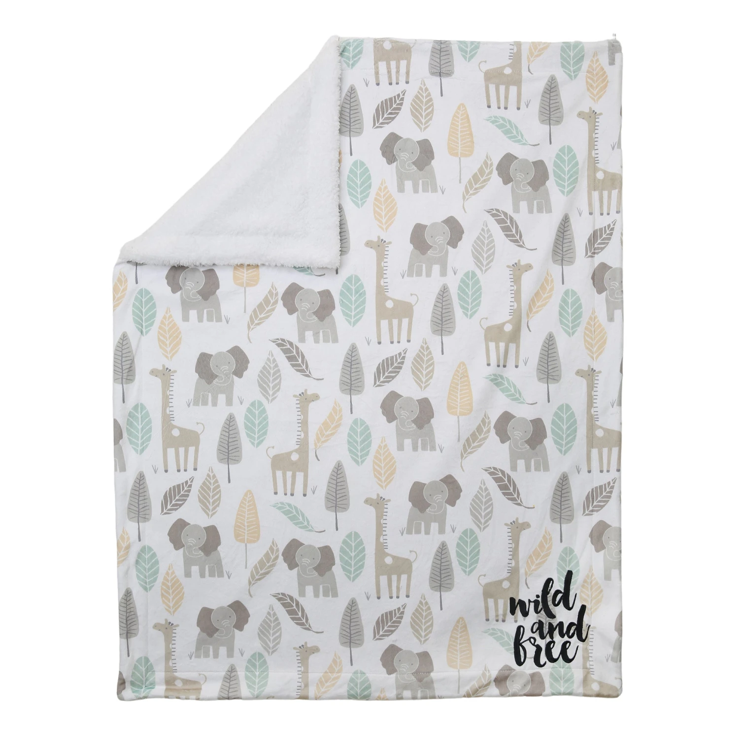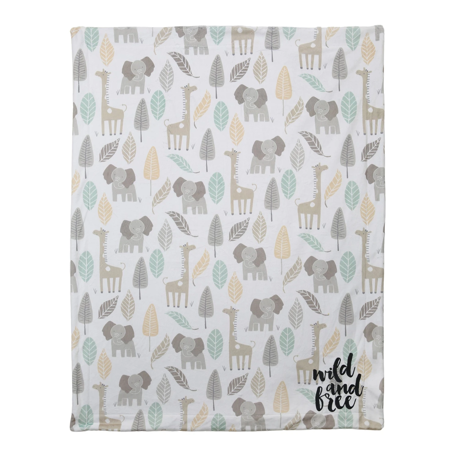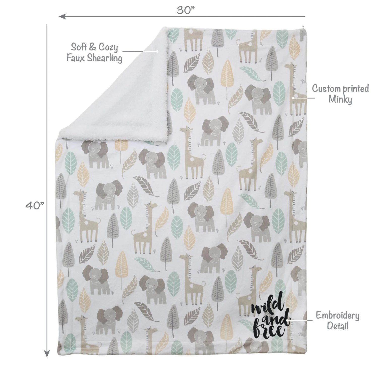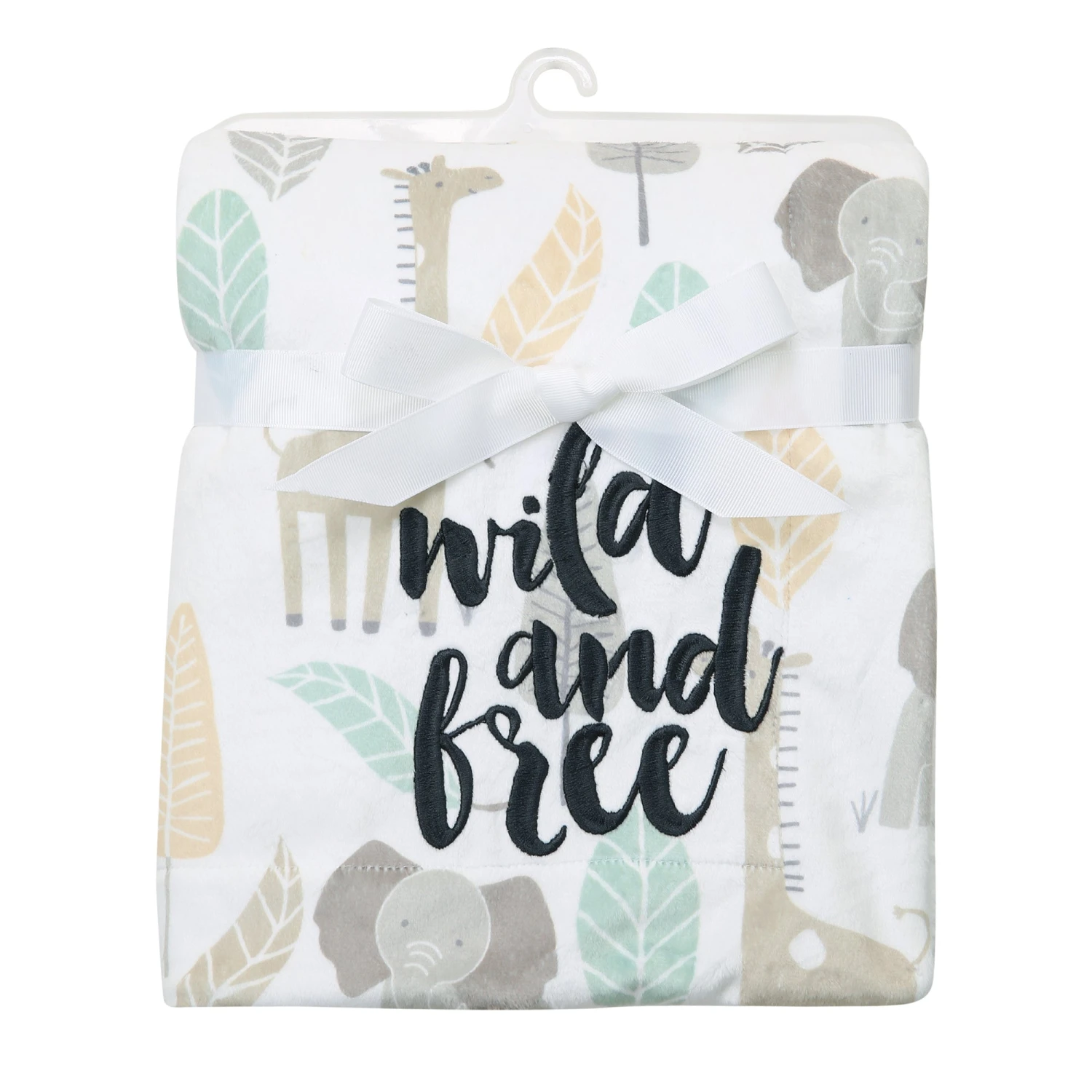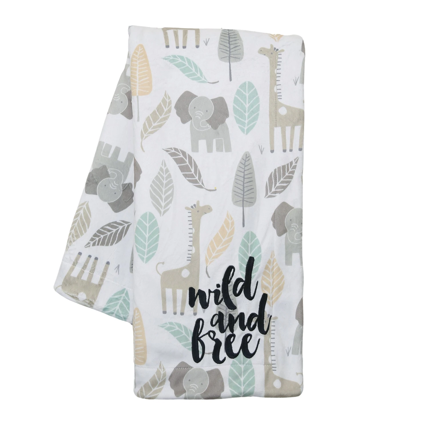 Cuddle up your little one with this soft, luxurious baby blanket. It features gray elephants with jumbo ears, tall giraffes, colorful leaves, trees, and the words wild and free embroidered in the right corner. This blanket is 30 inches by 40 inches and is the ideal size for a stroller blanket, going to the park, running errands, and is perfect for moms, dads, and babies on the go. Made in a soft and cozy minky front with a soft white faux shearling fleece back. It is machine washable for easy care and makes a great baby shower or welcome home baby gift. SKU: 711034MS, UPC: 084122018389.
