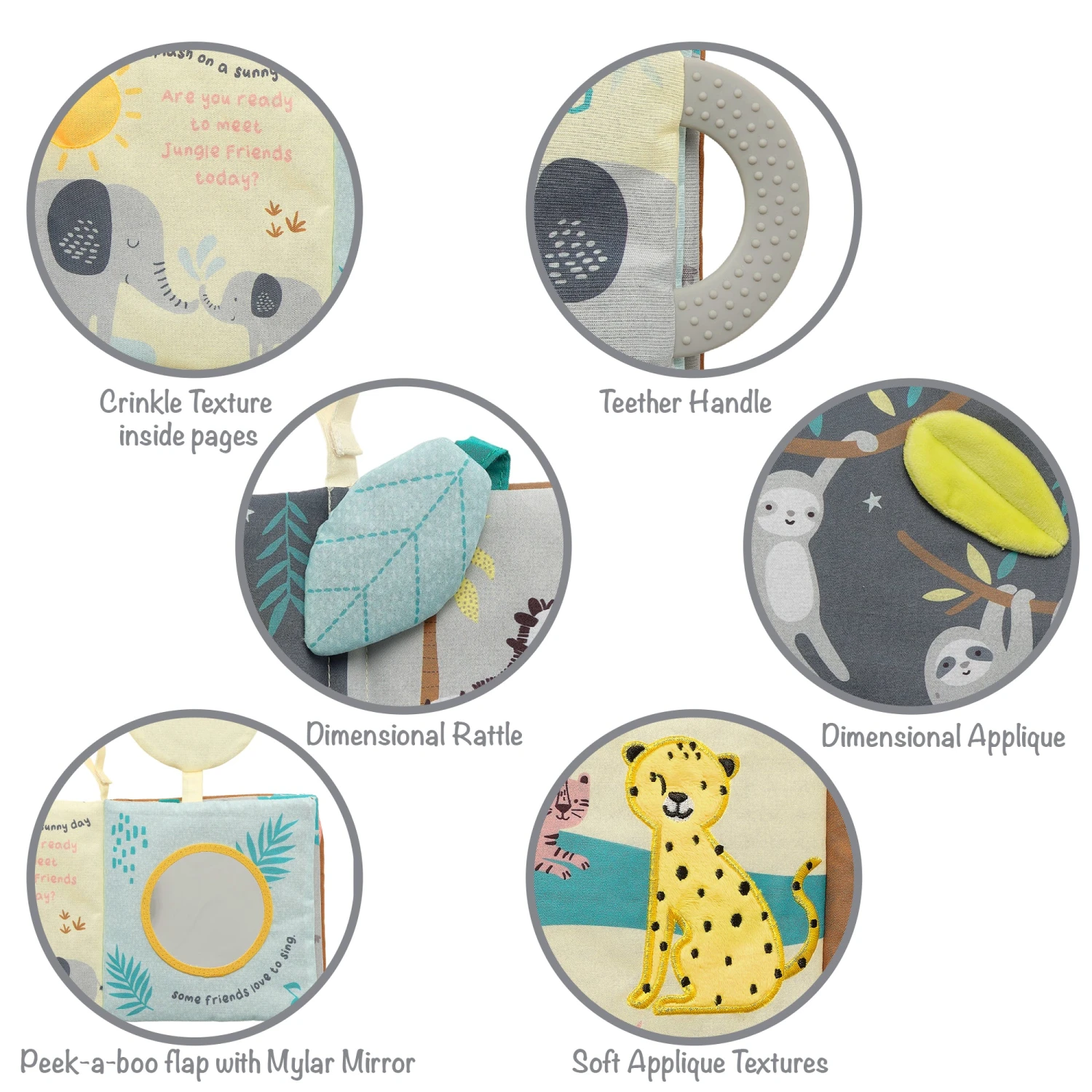 This Lambs & Ivy foldable book is a story about jungle friends that’s easy for little ones to follow. The soft microfiber book is loaded with developmental and interactive features such as a gray teether, mylar mirror, dimensional leaves, appliqued animals, a rattle, a squeaker, and several crinkle pages. This fun jungle story is about elephants, lions, sloths, a cheetah, toucans, zebra, giraffe, and a tiger. Included with this book is a 5.75” baby safe plush elephant made in a soft gray minky. The bottom of his feet and his inner ears are dark gray. It makes a super cute baby shower gift or welcome home baby gift. SKU: 728064JF, UPC: 084122015654.