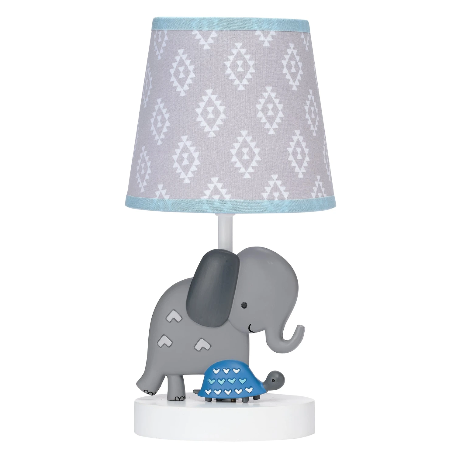 Add a soft glow to your child’s room with this adorable Jungle Fun 2-dimensional resin lamp and shade. The total height of the lamp and shade is approximately 11”. The sculpted gray elephant is in a standing position, has a dark gray ear and three light gray chevron patterns on his body. His BFF is always by his side. The sweet little turtle is a pretty shade of teal blue with three rows of hearts in white and light blue. The coordinating lamp shade is a print pattern of white diamond shapes on a gray ground. A long-lasting energy efficient light bulb is included. It is a 5-watt LED bulb equivalent to a 40-watt incandescent bulb. SKU: 207024BNS, UPC: 084122015258.