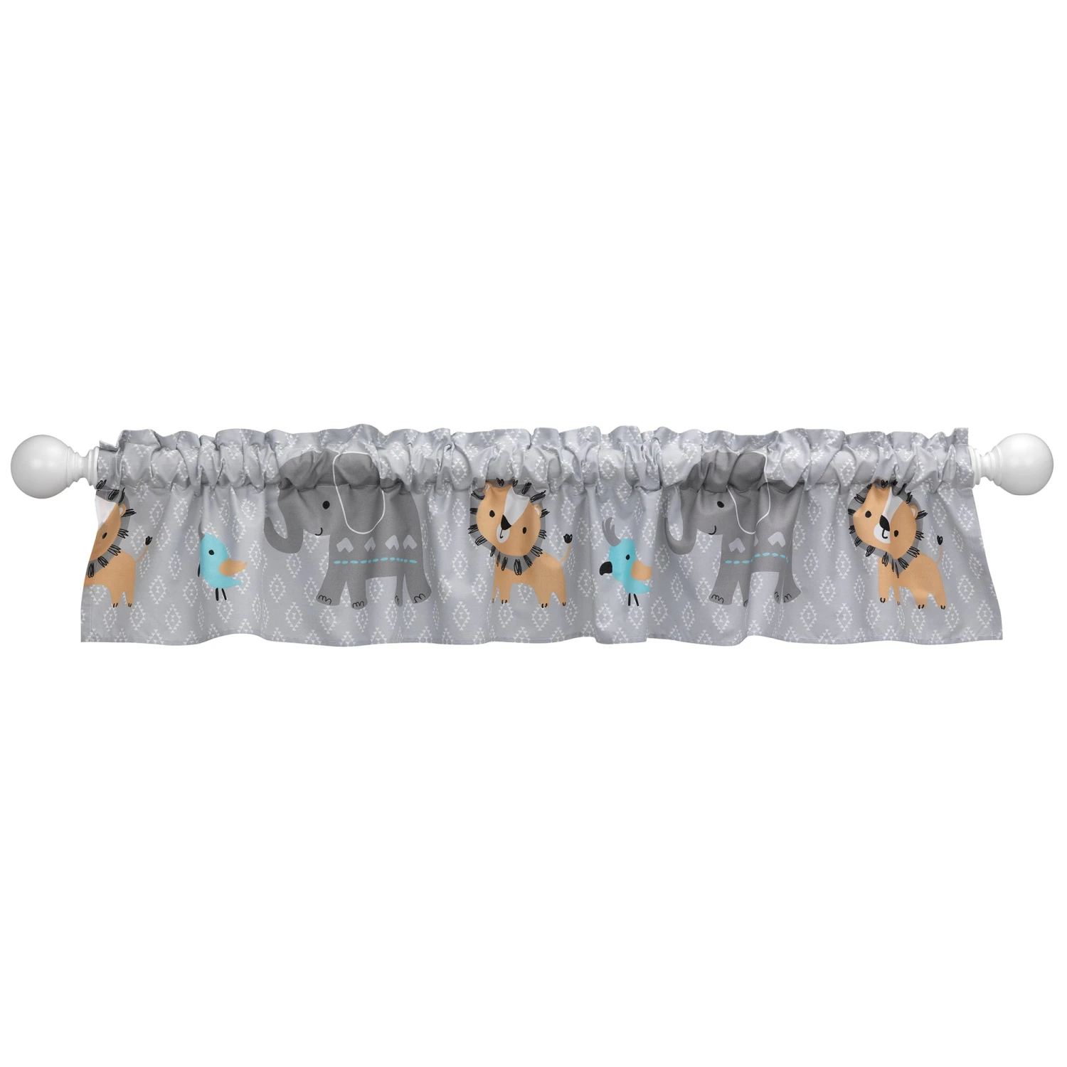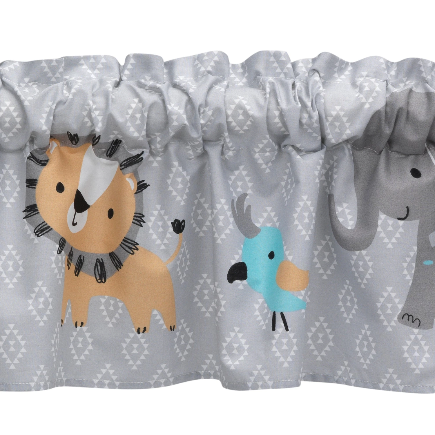 Whimsical safari animals parade across this decorative window valance. The background fabric is a gray and white diamond print. Measures 54” long and 10” high and is made of a cotton poly blend. Imported. SKU: 207029, UPC: 084122207295.