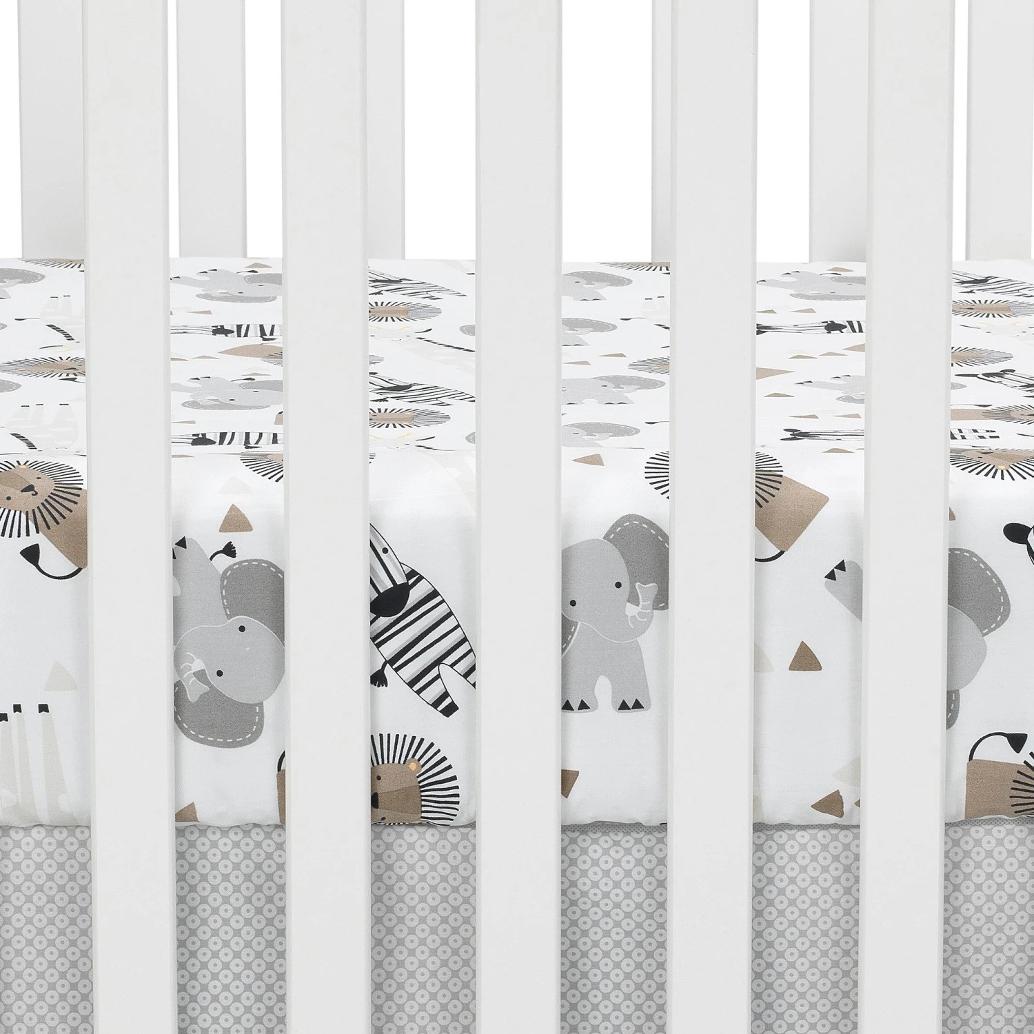 The 100% cotton fitted crib sheet highlights our adorable safari animals including an elephant, giraffe, lion and zebra. Designed to fit a 28 inch by 52 inch crib/toddler mattress. This sheet has an extra deep pocket and elastic all around to ensure a safe and secure fit. SKU: 840006B, UPC: 084122006997.
