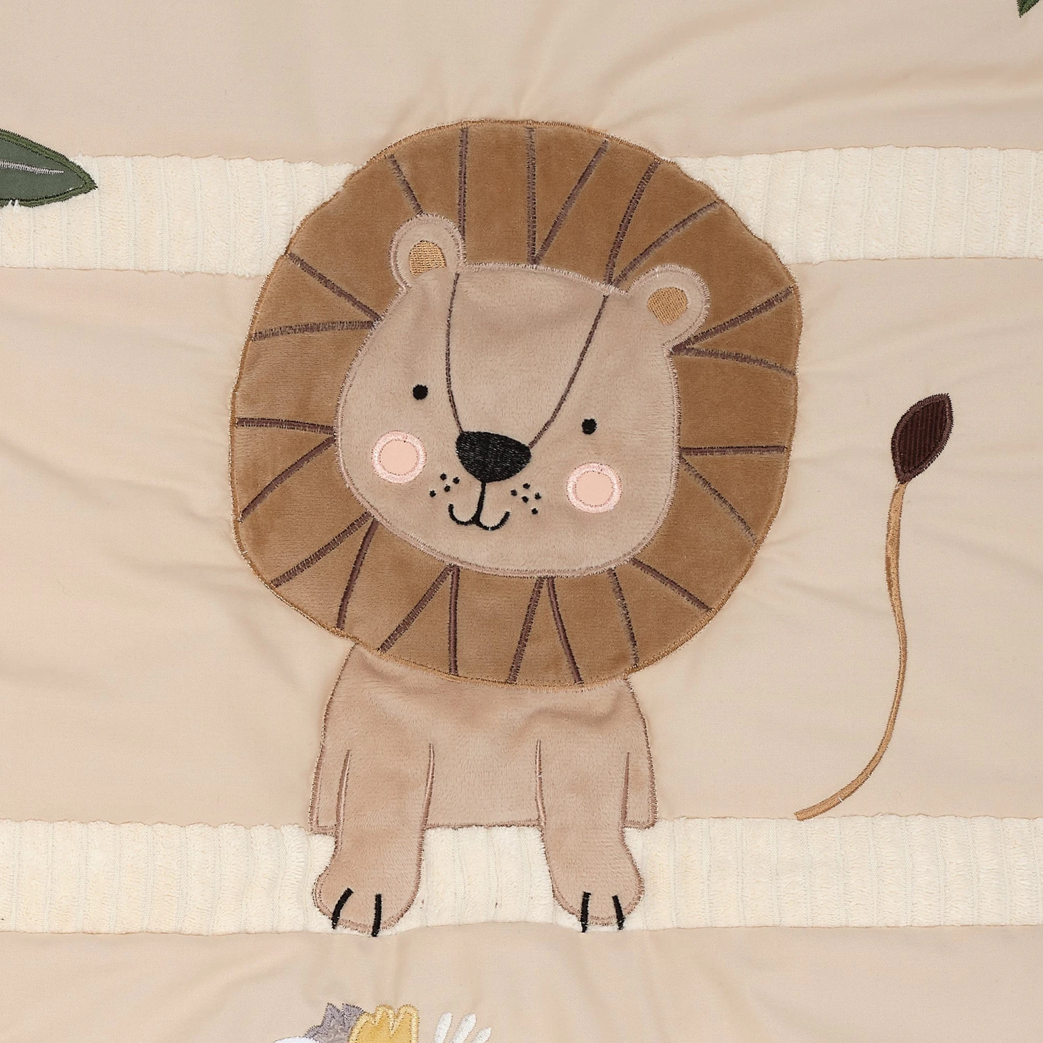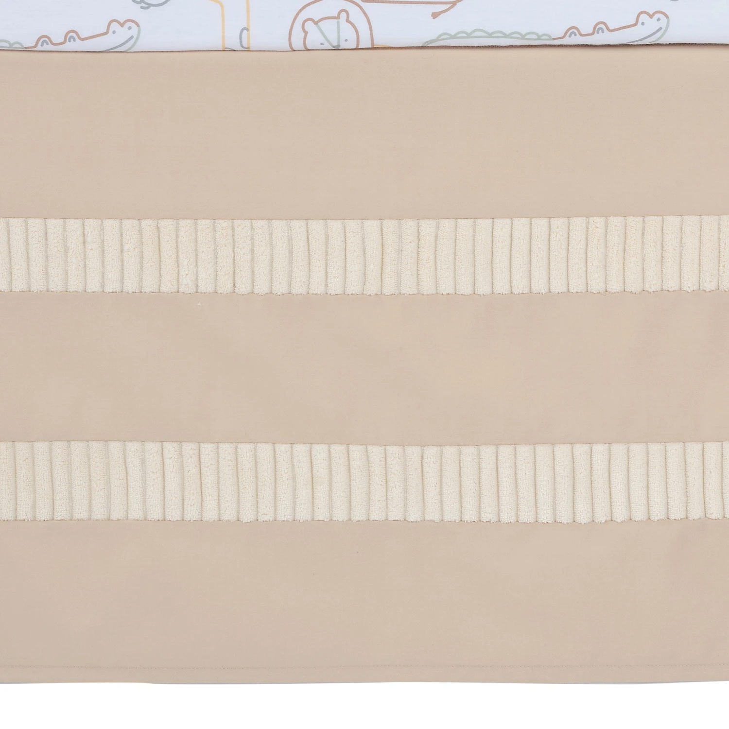 This three-piece baby crib bedding set features friendly jungle safari animals with playful details on a soft, neutral beige/tan/gray color palette. The bedding set includes one quilt, one breathable 100% cotton fitted crib sheet, and one crib skirt. Our fully appliqued quilt features a golden faux suede giraffe, a taupe minky velour lion, a gray boucle elephant with brown corduroy ears, a sleepy curly boucle sloth, and a dusty green soft textured alligator. There are four rows of textured creamy ribbed velour in between these happy jungle animals. The front and back of the quilt is a poly/cotton twill. This quilt, with so many textured animals, is perfect for tummy time with your little one and makes a great play mat. The breathable 100% cotton fitted crib sheet is on a white ground with gray elephants, lions, giraffes, and alligators in multi-colored silhouettes. The fitted crib sheet has elastic all the way around for a safe and secure fit on a standard size crib mattress. The decorative crib skirt is a natural sand color in a poly cotton twill. The front panel is decorated with two rows of creamy ribbed velour and has a 14 ½” drop. This crib skirt adds the finishing touch to your child’s crib. SKU: 897003V, UPC: 084122018174.