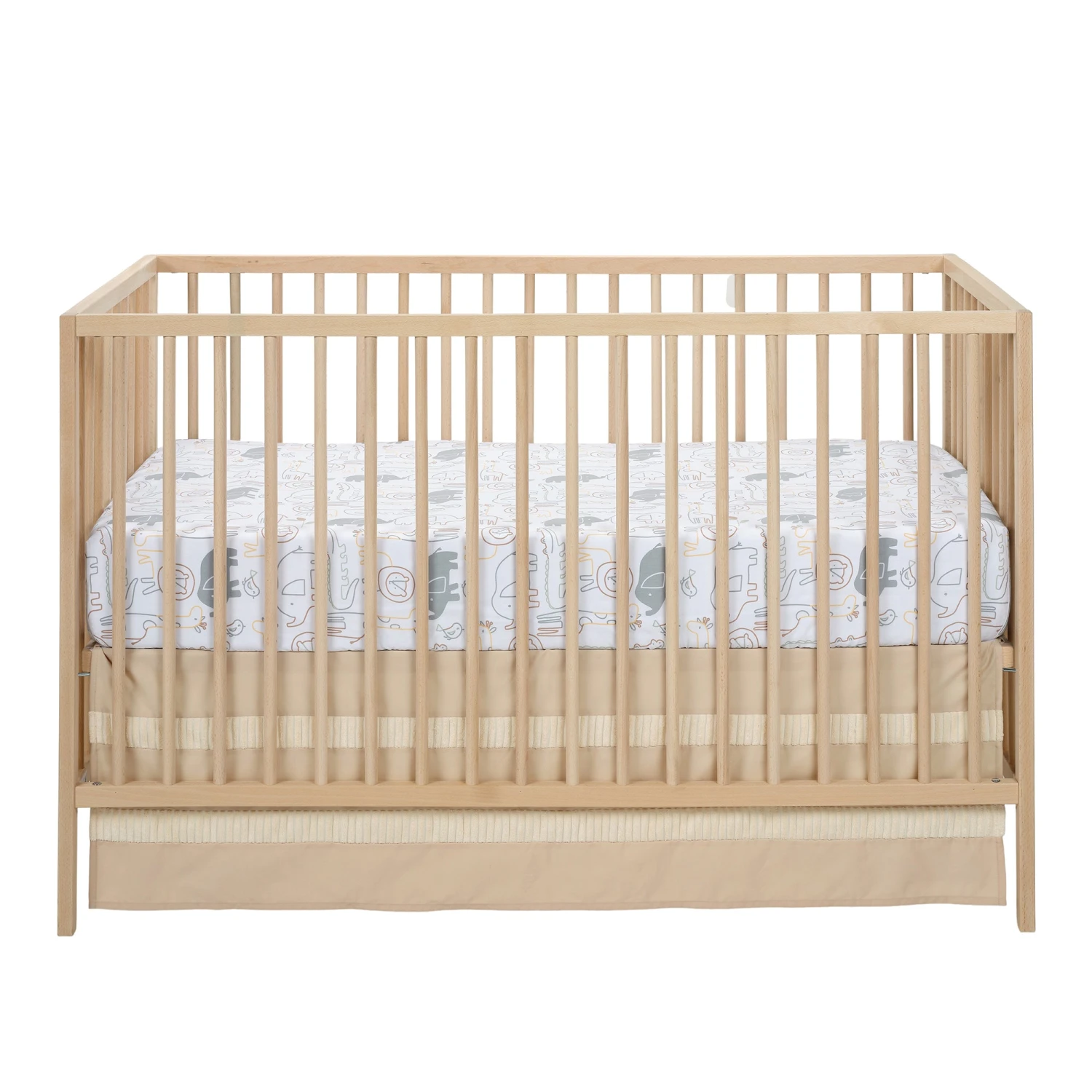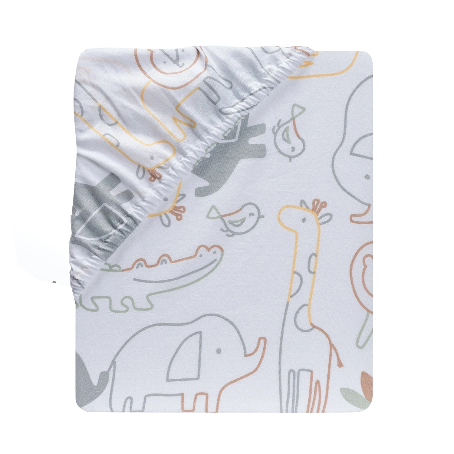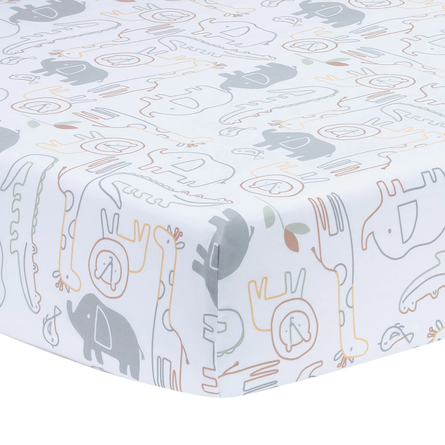 Gray elephants decorate this white ground breathable 100% cotton fitted crib sheet along with lions, giraffes, and alligators in multi-colored silhouettes. There is elastic all the way around ensuring a safe and secure fit on a standard size crib mattress. This sheet will create a calming and inviting sleep space for your little one. SKU: 897006B, UPC: 084122018181.