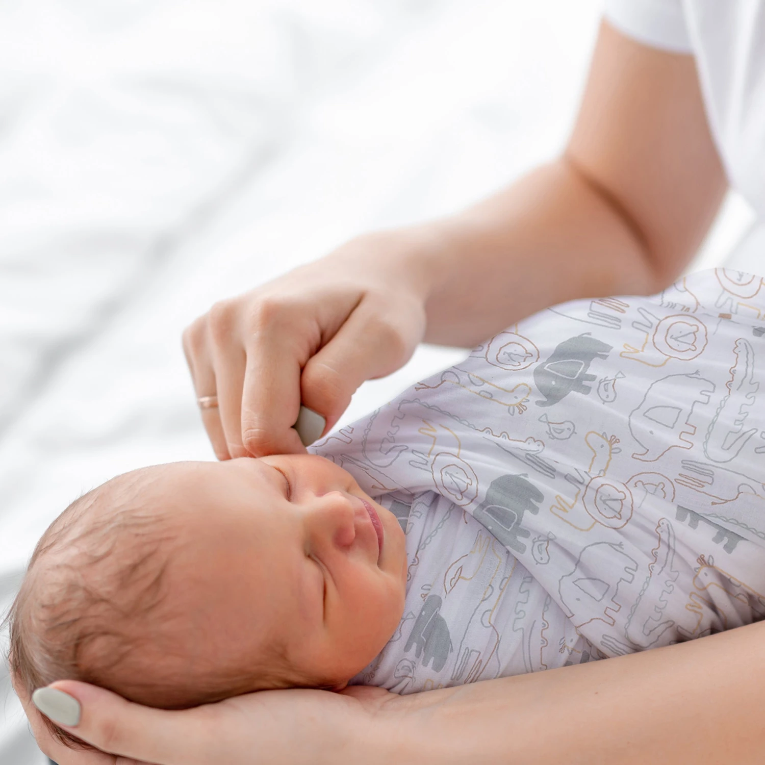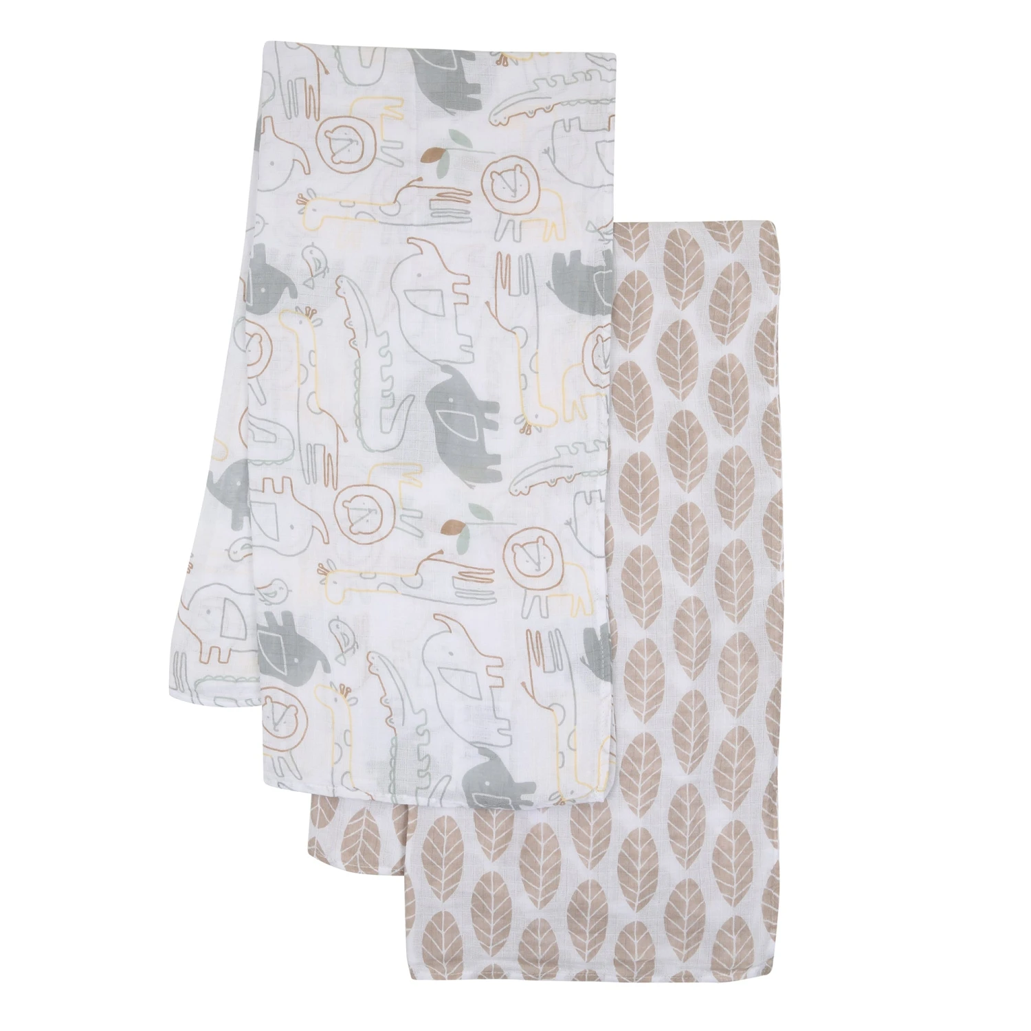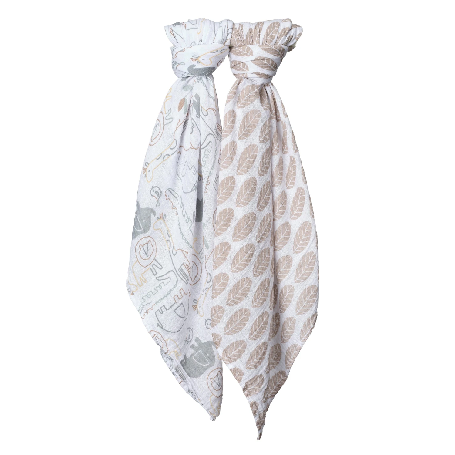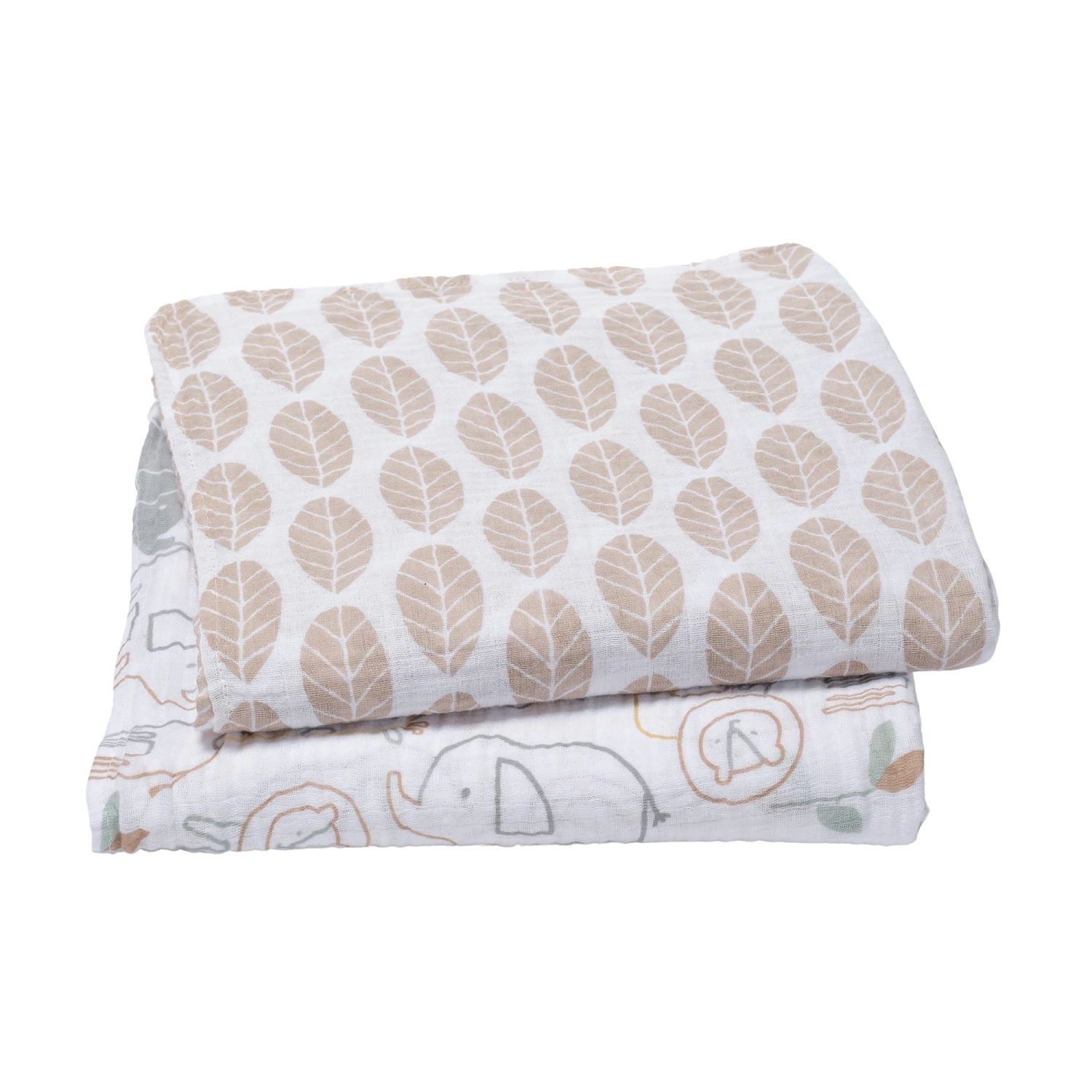 Wrap your precious little one in the warmth and security of our soft and breathable swaddle blankets. Designed to mimic the comforting womb-like environment your little one once knew. These swaddle blankets are 44” X 44” and are 100% cotton muslin. One print is on a white ground with gray elephants, and silhouettes of lions, giraffes and alligators. The second swaddle blanket is on a white ground with soft taupe color leaves. These are machine washable for easy care. SKU: 897034SW, UPC: 084122018198.