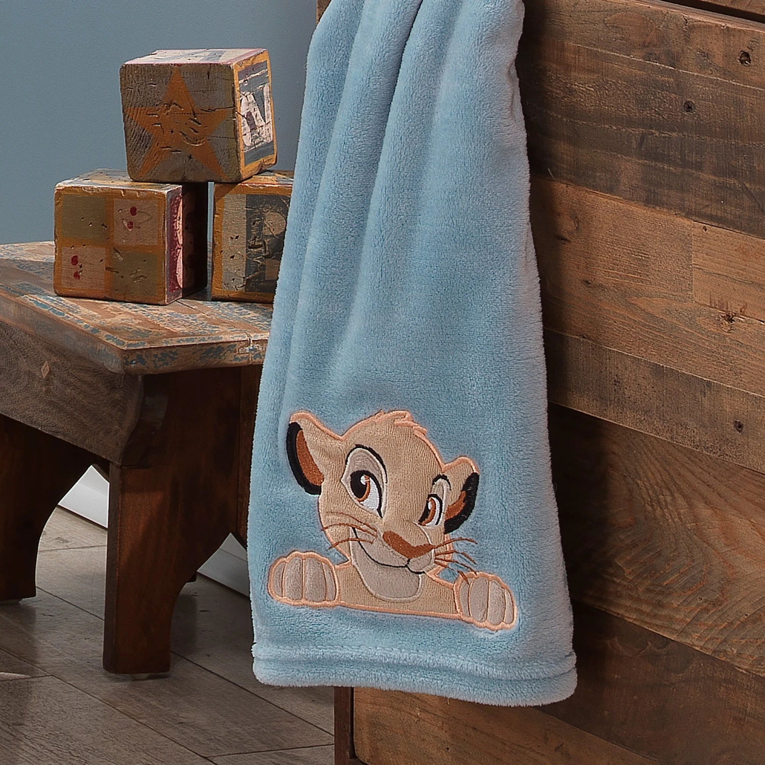 Simba in a soft minky two toned fur is centered at the bottom of the blanket resting his head on his front paws. This cozy blue blanket is 30” x 40” and is perfect for cuddling your little one. SKU: 790034, UPC: 084122790315.