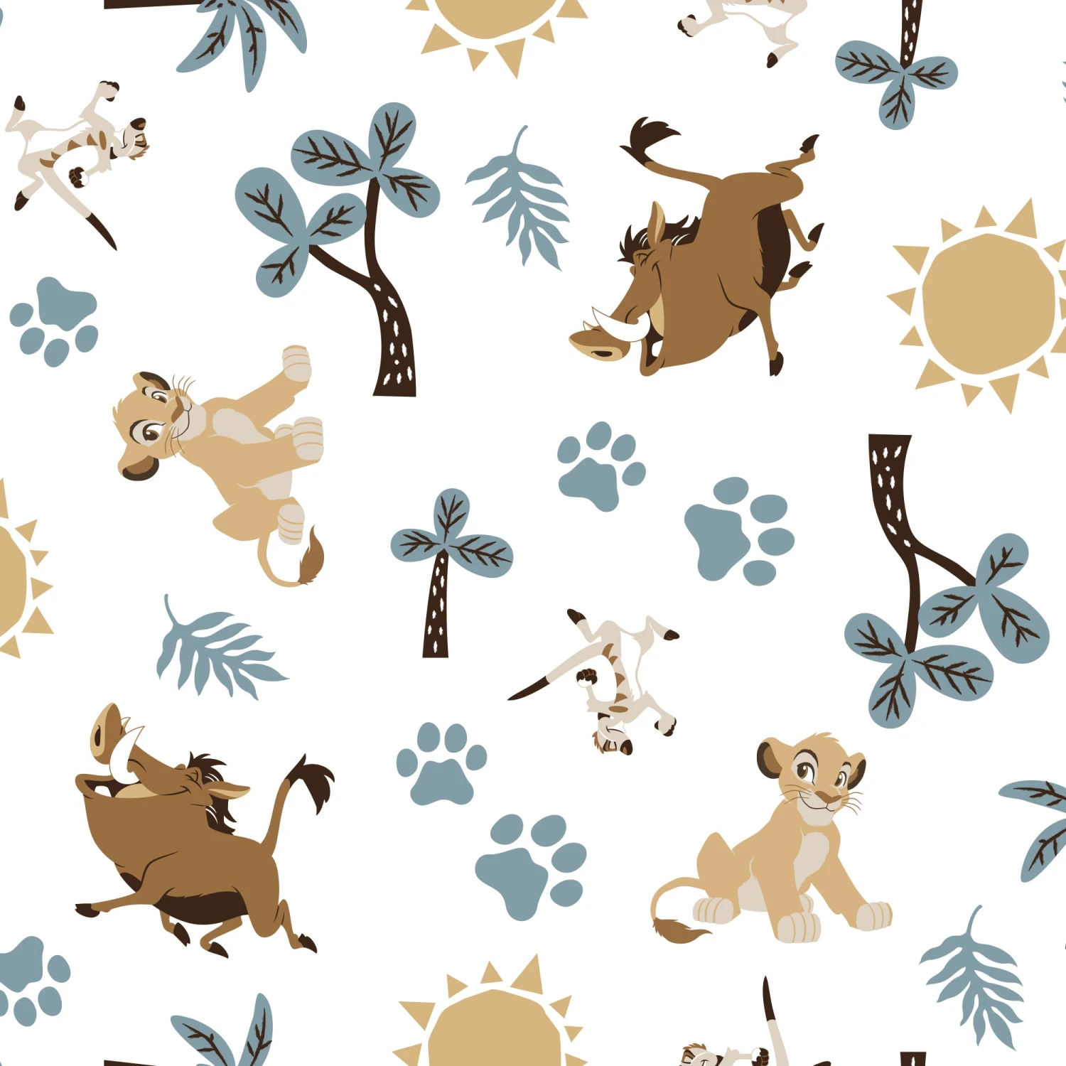 This fitted crib sheet features Simba, Pumbaa, and Timon tossed on a white ground with paw prints, trees and the sun. Measures 28” x 52” and fits a standard crib mattress. This eco-friendly crib sheet was digitally printed on microfiber in a high resolution ensuring enhanced colors. SKU: 790006B, UPC: 084122790018.