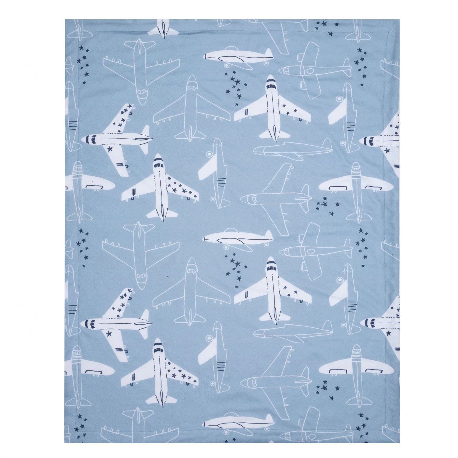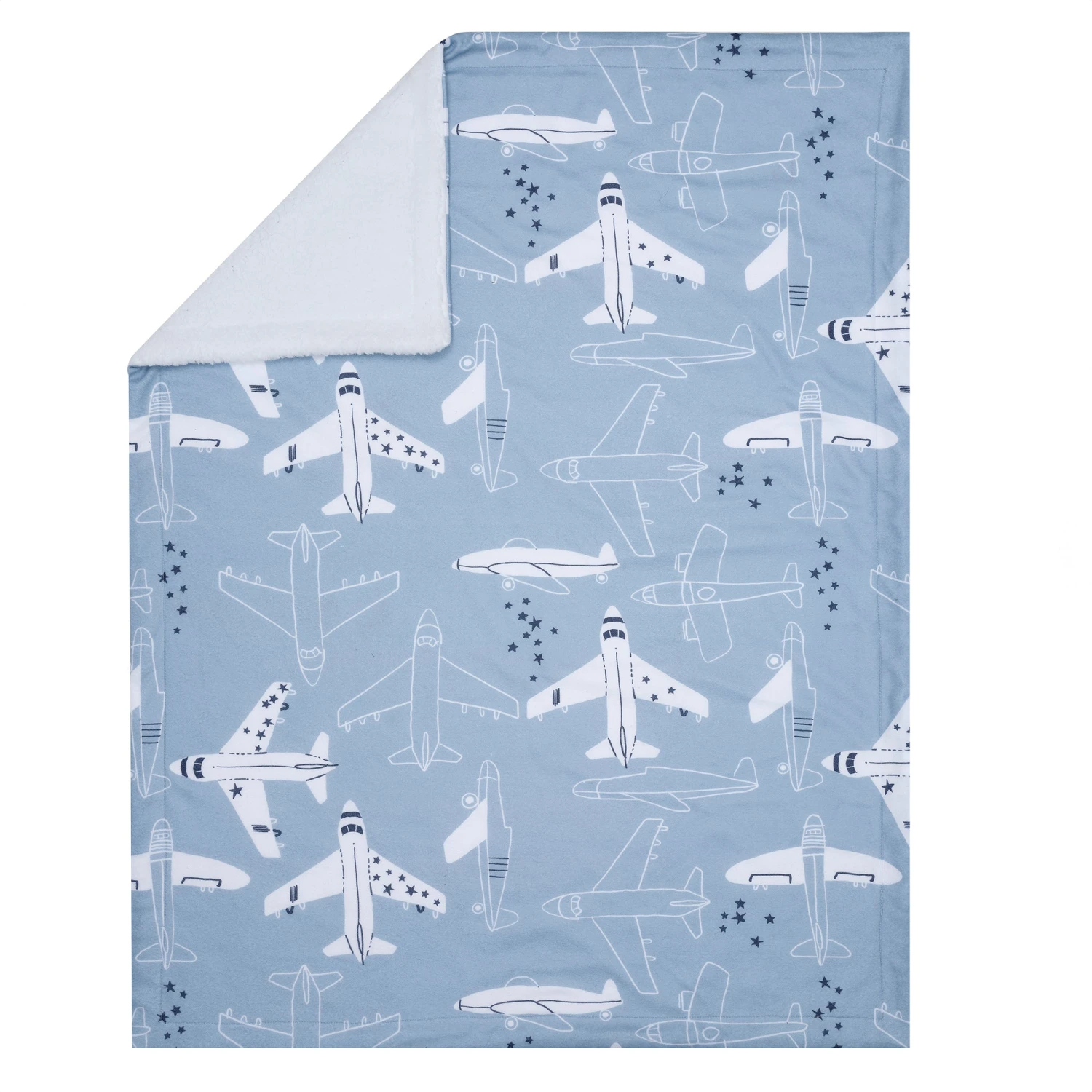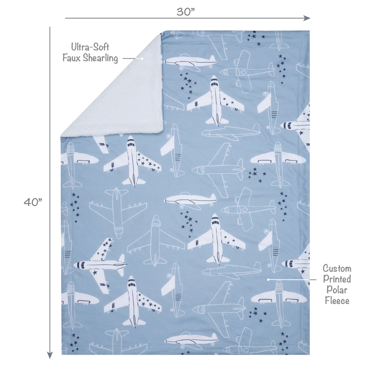 Wrap your little one in cozy comfort with this soft polar fleece front and luxurious white faux shearling back baby blanket. It will deliver ultimate comfort and warmth while gently embracing your precious little one. Multiple style airplanes, some in silhouette, decorate the front of this blanket which is perfectly sized at 30” X 40”. It is machine washable for easy care. SKU: 258034, UPC: 084122018693.