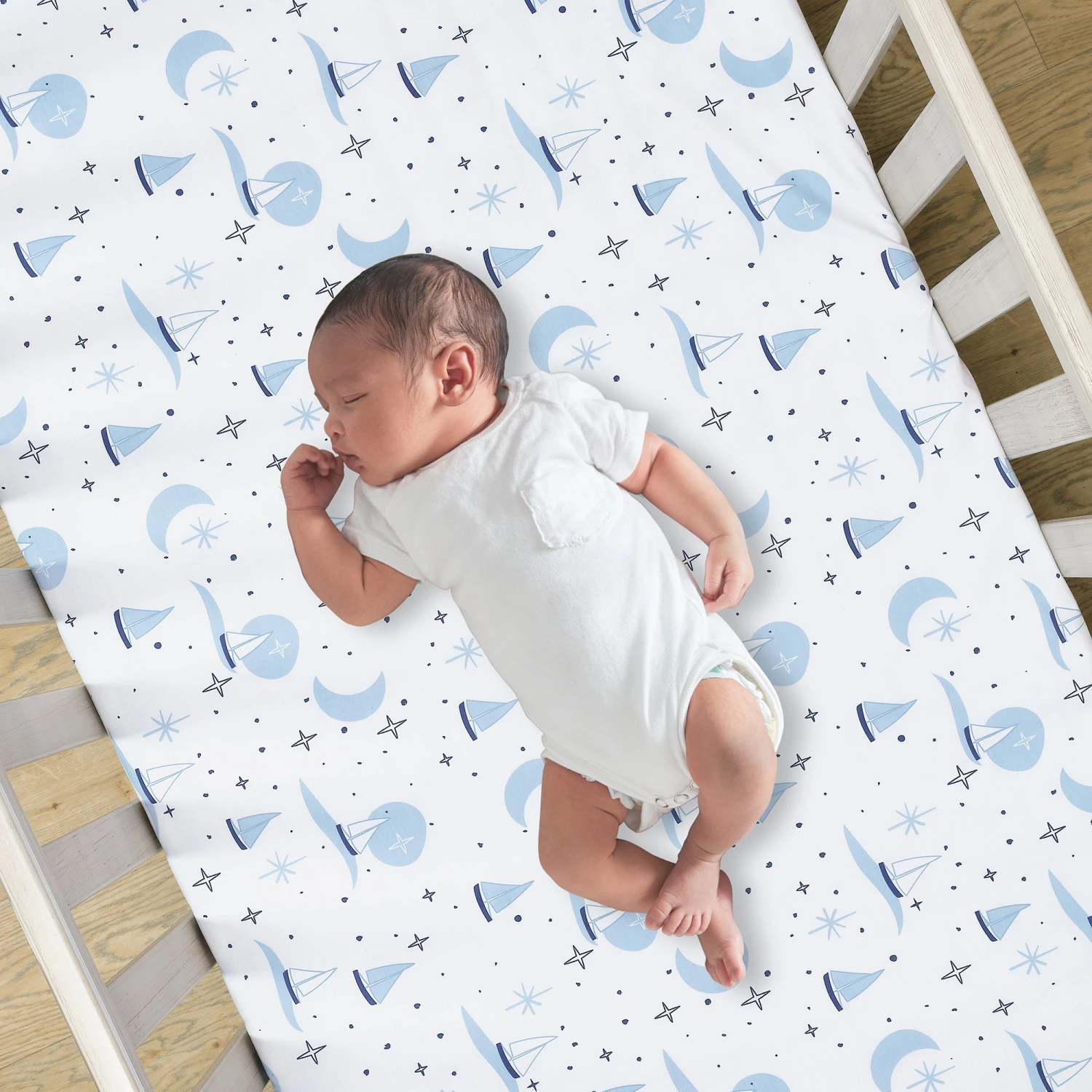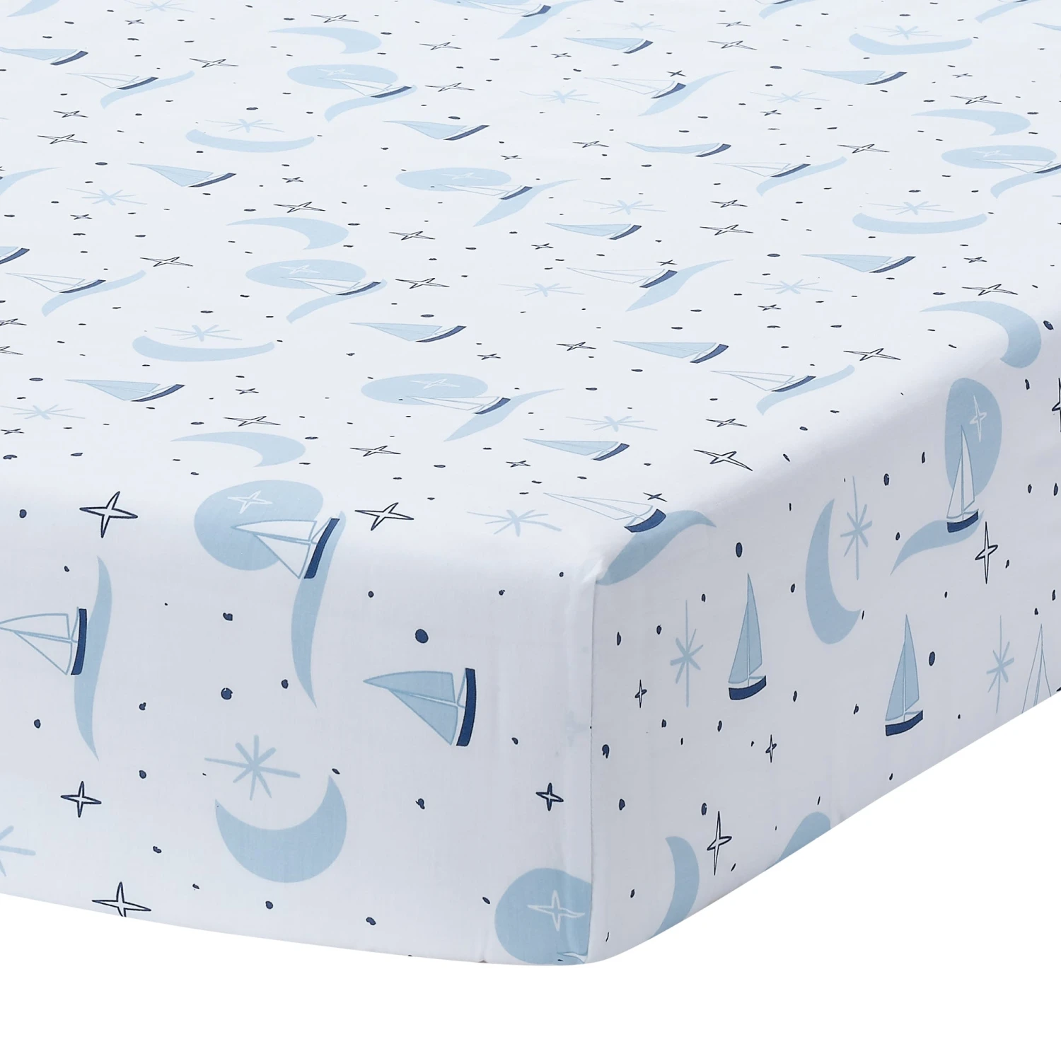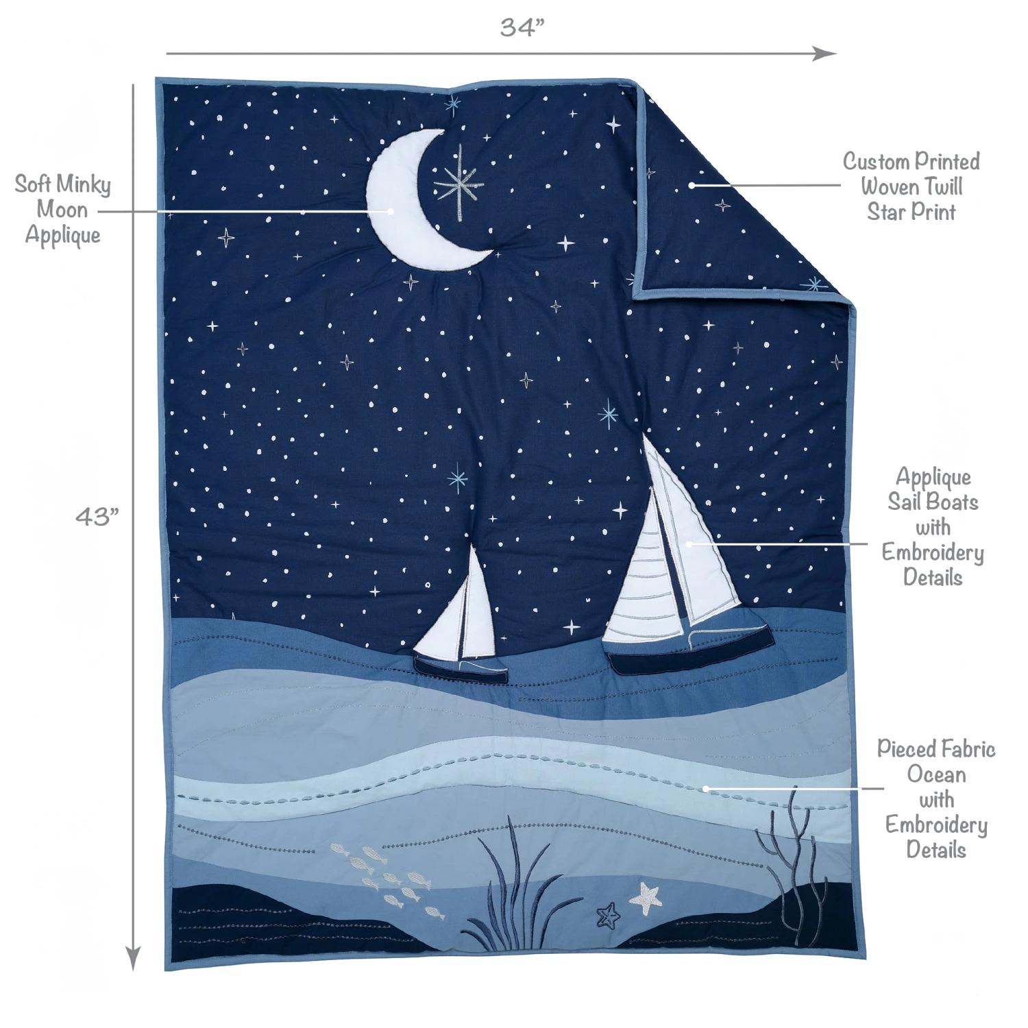 Your little one will love falling asleep under a crescent moon and twinkling stars. This 3-piece infant crib bedding set includes one quilt, one breathable 100% cotton fitted crib sheet, and one decorative cotton crib skirt. The cotton quilt features two appliqued sailboats with white faux suede sails, along with a white crescent moon and embroidered blue north star. The breathable 100% cotton fitted crib sheet is on a clean white ground and features sailboats, crescent moons and stars. There is elastic all the way around ensuring a safe and secure fit on a standard size crib mattress measuring 28” X 52”. The crib skirt adds the finishing touch to your child’s crib. The front of the crib skirt features a navy blue twill applique sailboat with white faux suede sails and twinkling stars in the background. It has a 14 ½” drop and conceals most of the crib frame. SKU: 705003V, UPC: 084122019430.