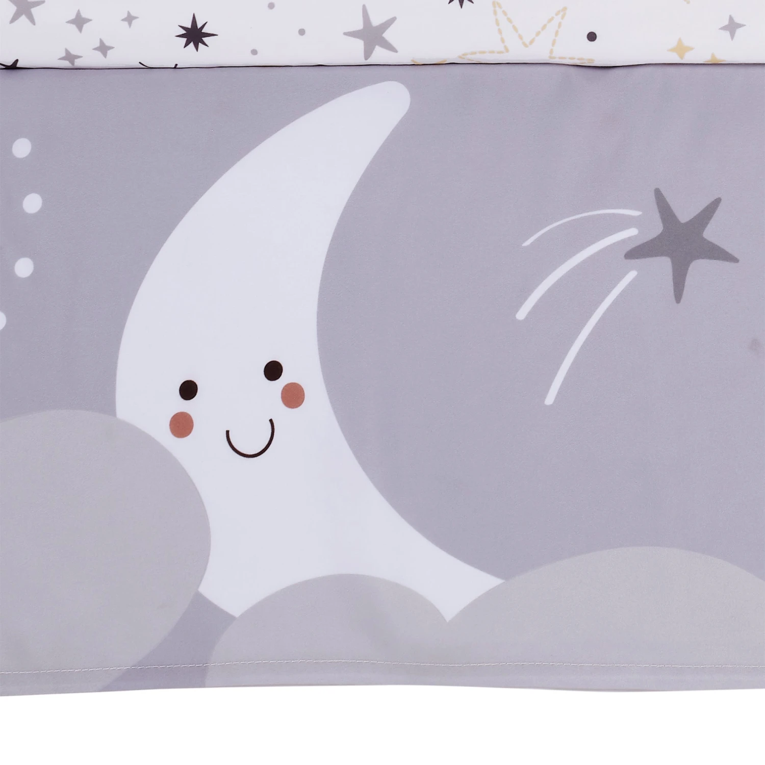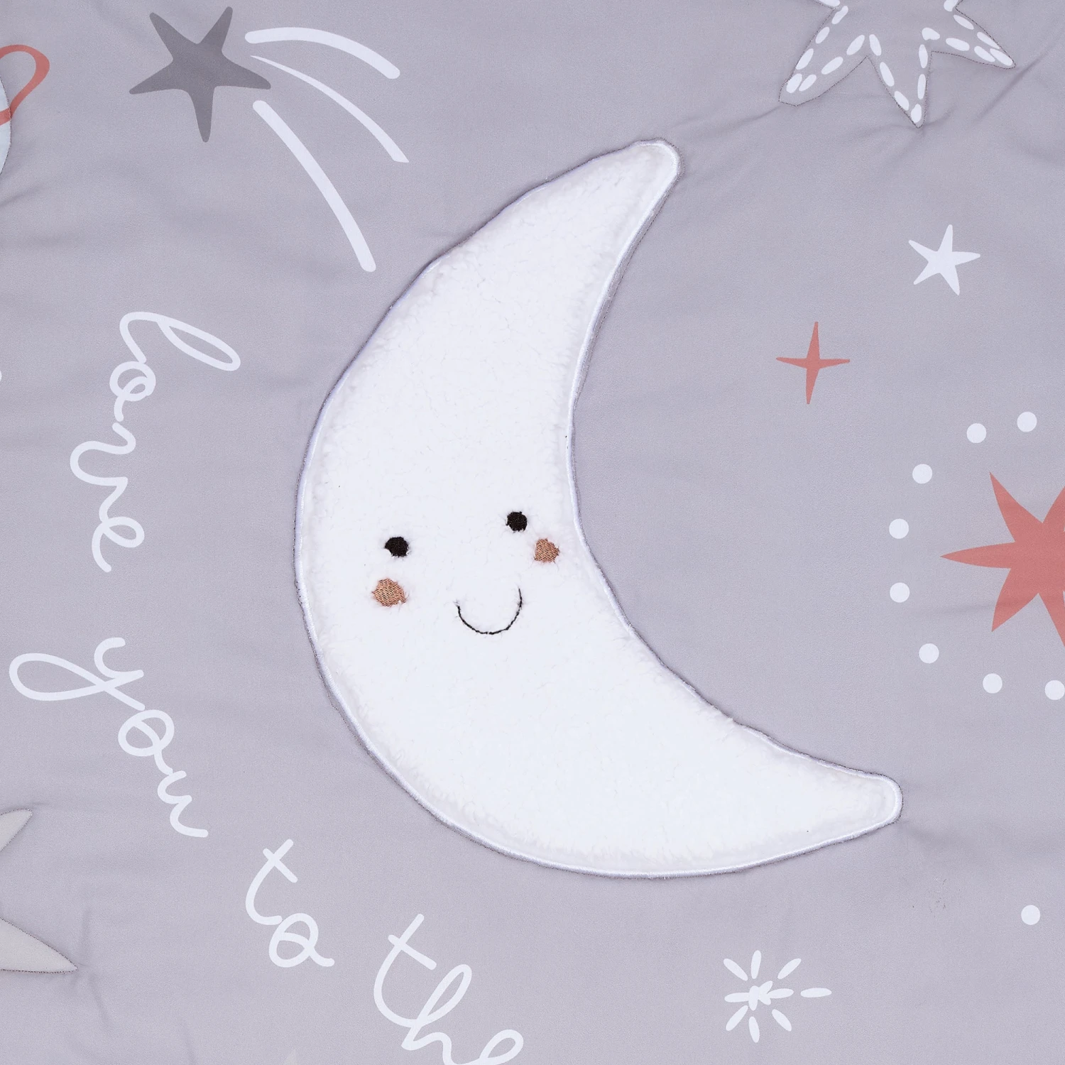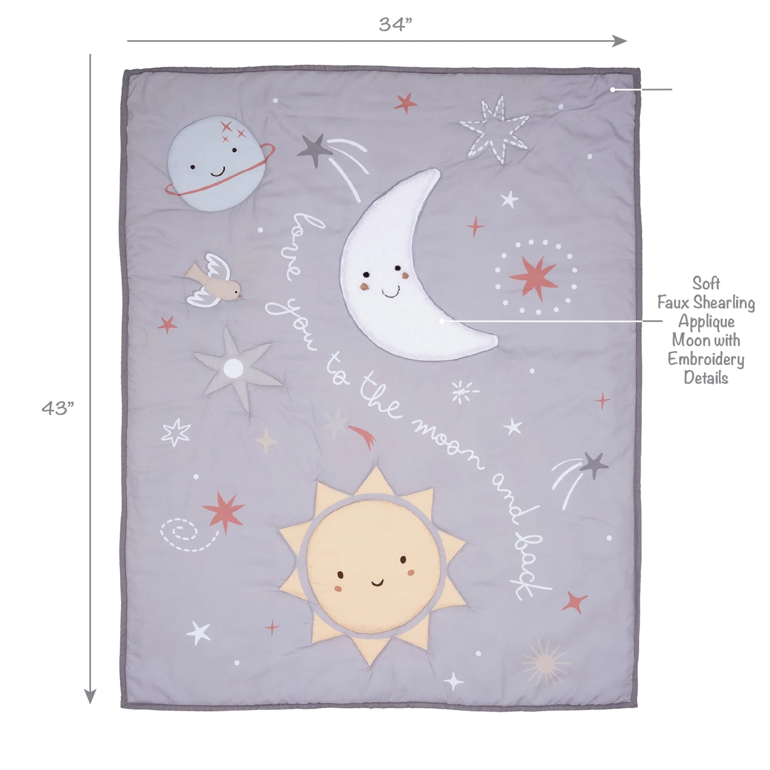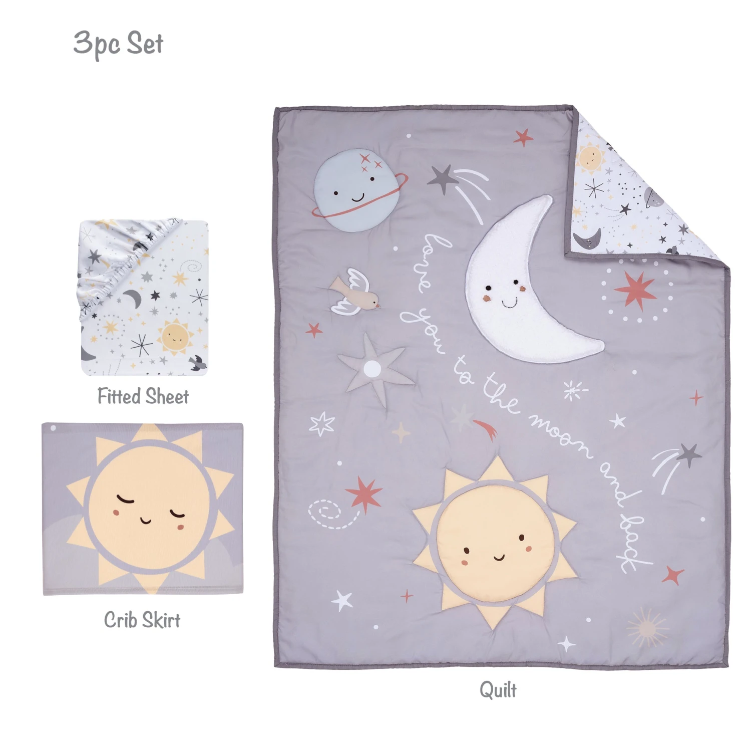 Bedtime Originals Little Star three-piece baby bedding set will create a nursery that’s truly out of this world. The three-piece set includes one quilt, one fitted crib sheet and one crib skirt. The quilt has an expertly appliqued crescent moon in soft white faux shearling with an adorable embroidered face. The words “love you to the moon and back” are printed next to the moon. There is a sweet yellow sun, a happy blue planet and shooting stars. This quilt is the perfect size for tummy time with your little one. The microfiber fitted crib sheet is on a clean white background with crescent moons, suns, planets, and stars. There is elastic all the way around ensuring a safe and secure fit on a standard size crib mattress measuring 28” X 52”. The crib skirt adds a designer touch to your child’s crib. The crib skirt features happy white crescent moons, cute yellow suns, and multi-colored stars. This celestial design will ignite your baby’s imagination, with a sense of wonder and curiosity. The microfiber material and soothing colors promote a calming environment that encourages a peaceful sleep for your little one. SKU: 288003V, UPC: 084122018242.