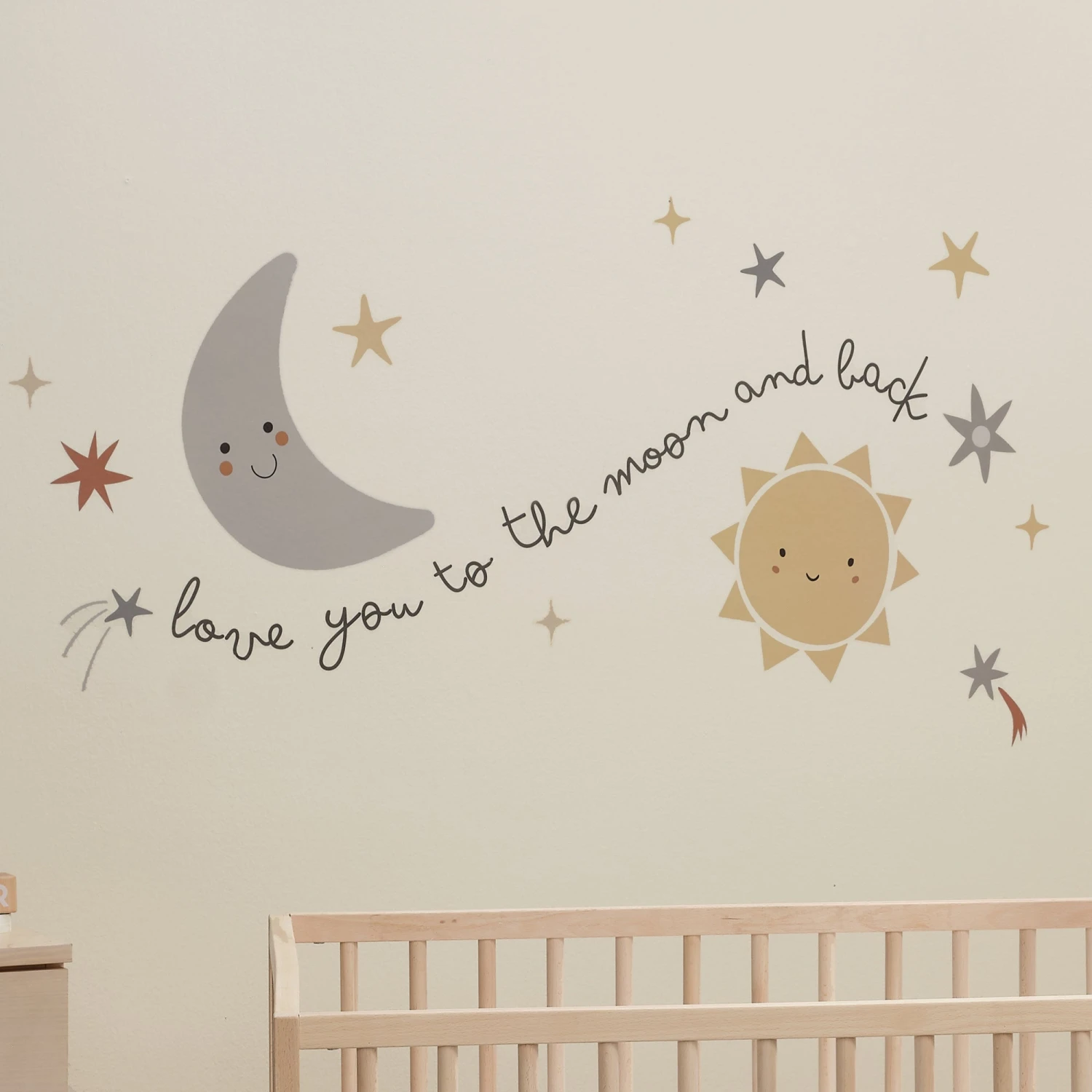 Transform your nursery into a celestial wonderland with our enchanting Little Star wall decals. There are three sheets that are 12” X 18” each with a total of 20 die-cut pieces. There is a smiling sun and moon along with 9 stars, 2 shooting stars, and the words “love you to the moon and back.” These decals work best on smooth walls. SKU: 288048, UPC: 084122018327.